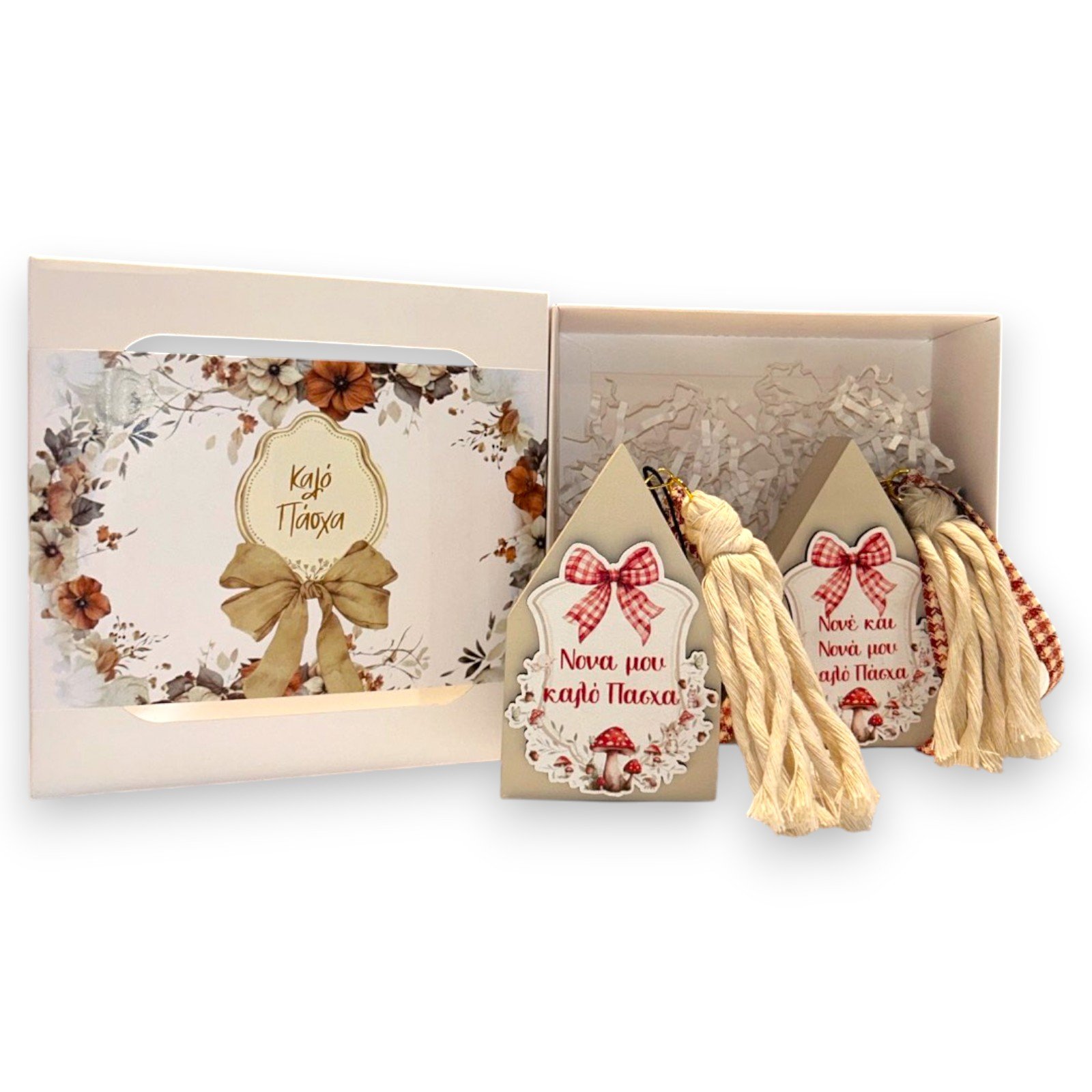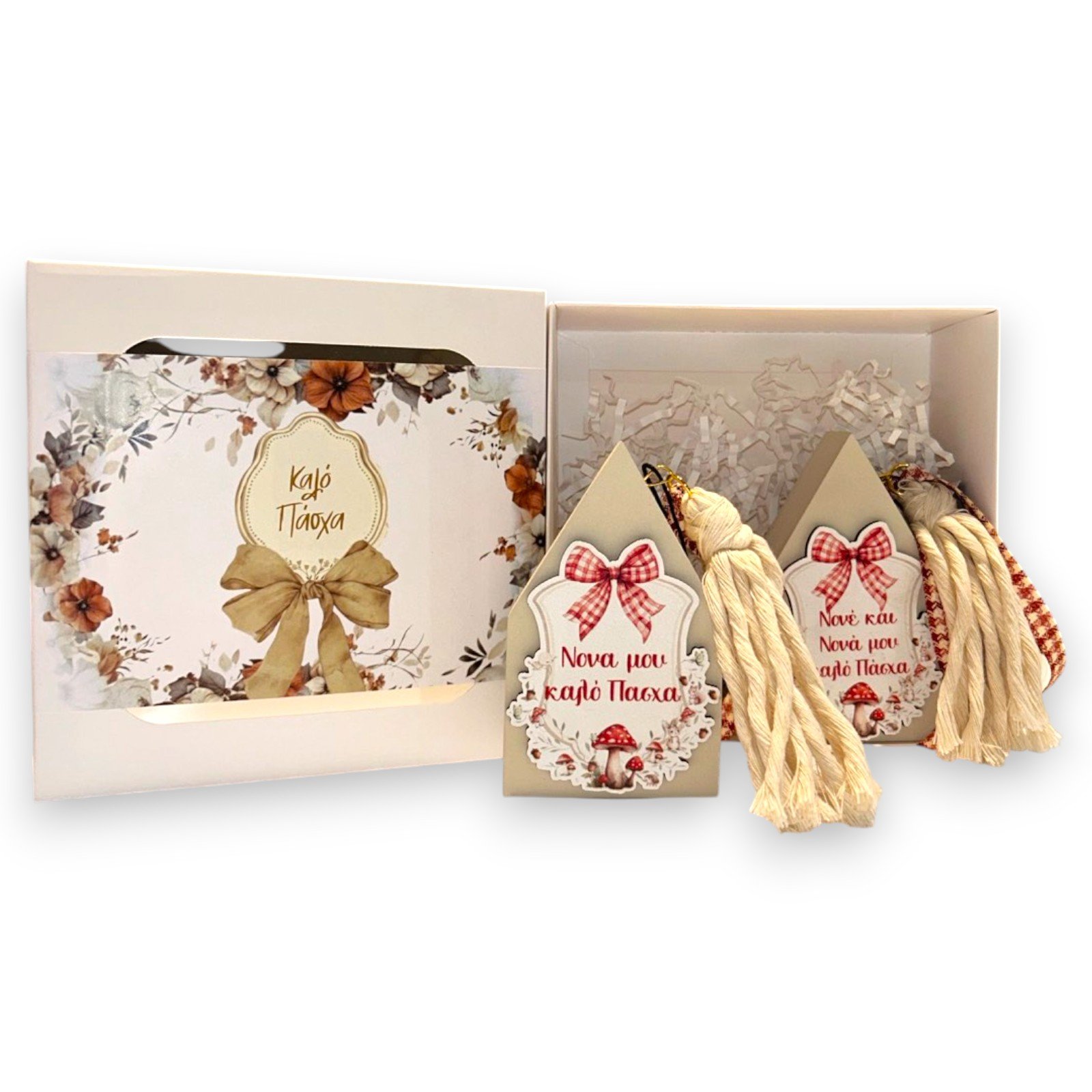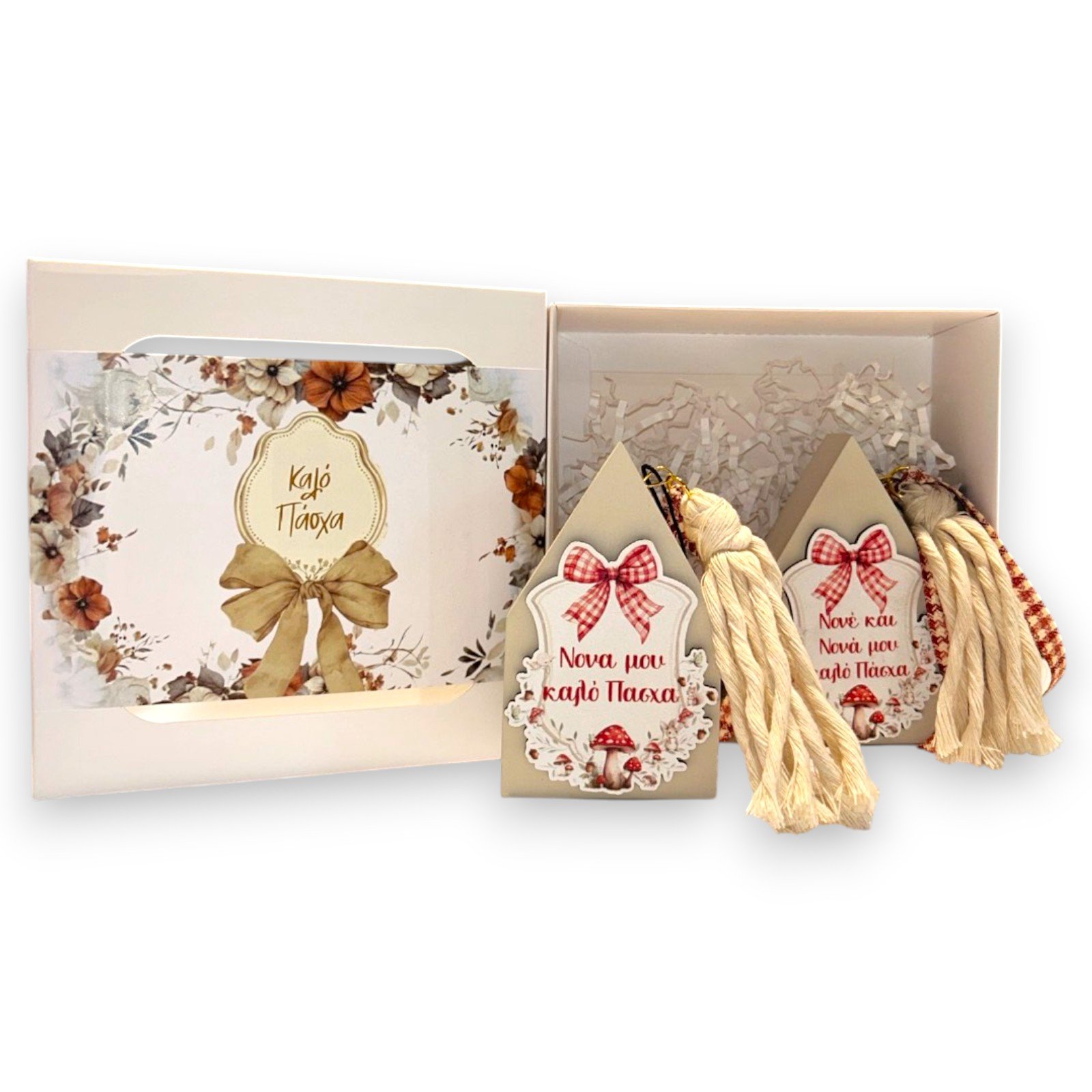Συσκευασία: Κουτί δώρου με floral σχέδιο, παράθυρα προβολής και επιγραφή “Καλό Πάσχα”