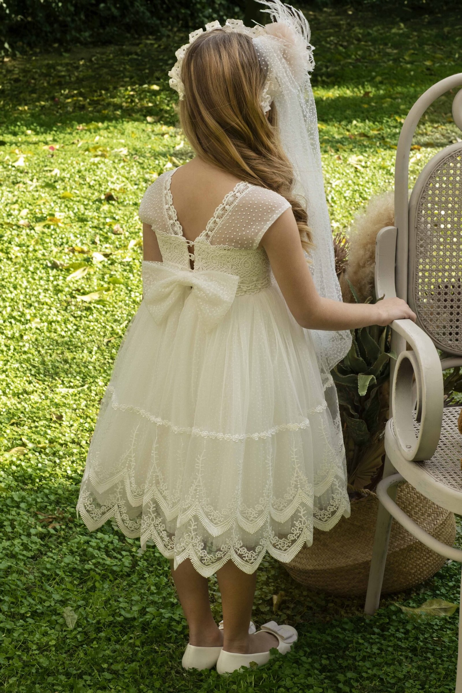 Eντυπωσιακό φόρεμα υψηλής ραπτικής ,μικρό νυφικό , από κεντητό πουά τούλι σε off white απόχρωση με εσωτερική επένδυση από μαλακό βαμβακερό ύφασμα. Διπλή απλικέ δανδέλα στο τελείωμα του φορέματος. Το εκπληκτικό αυτό αποτέλεσμα συμπληρώνει μια ανάγλυφη δανδέλα στο μπούστο. Ασορτί κορδέλα με το ίδιο λουλούδι του φορέματος ή κατ’ επιλογή μπαντάνα ή τουρμπάνι.