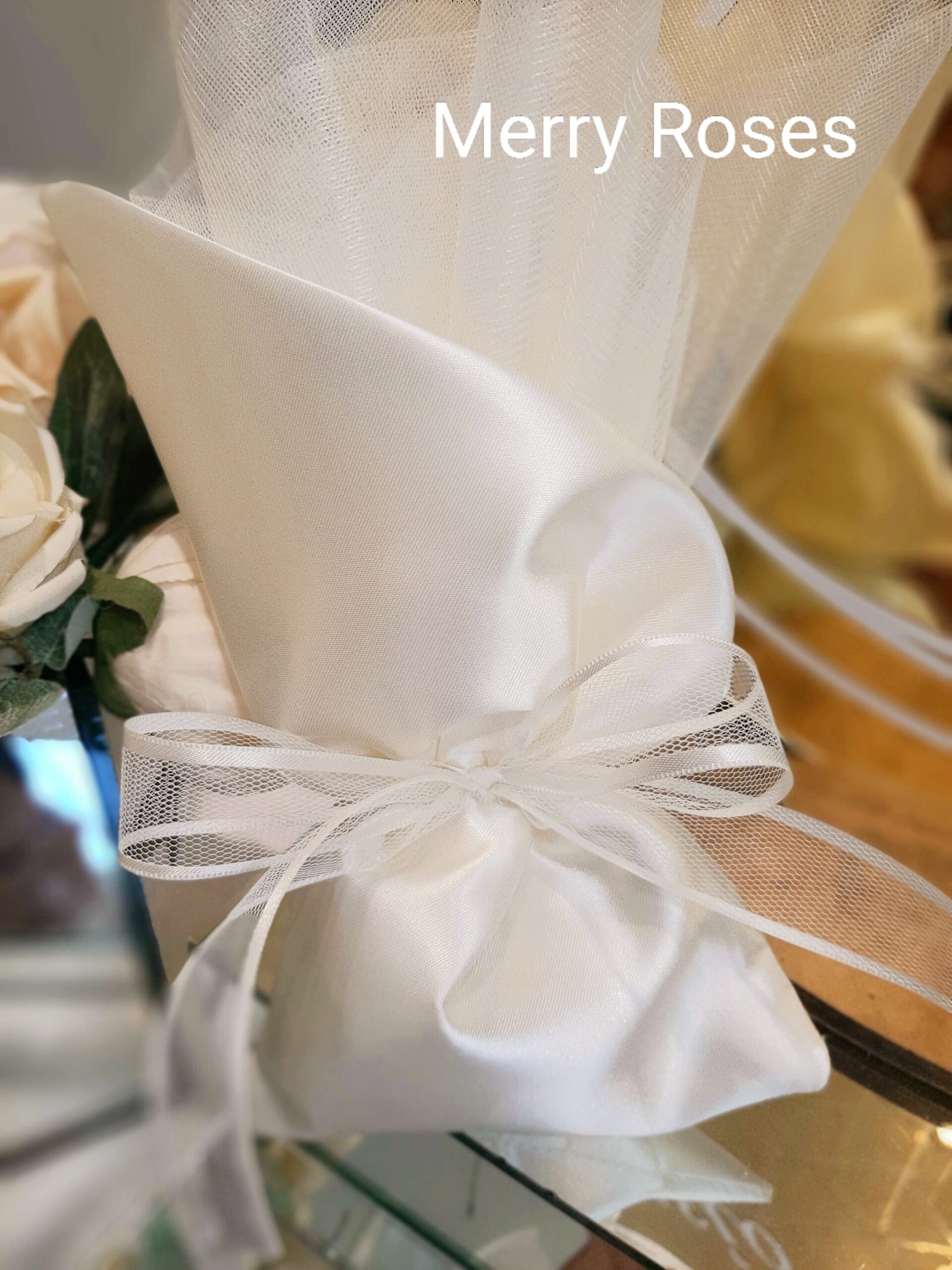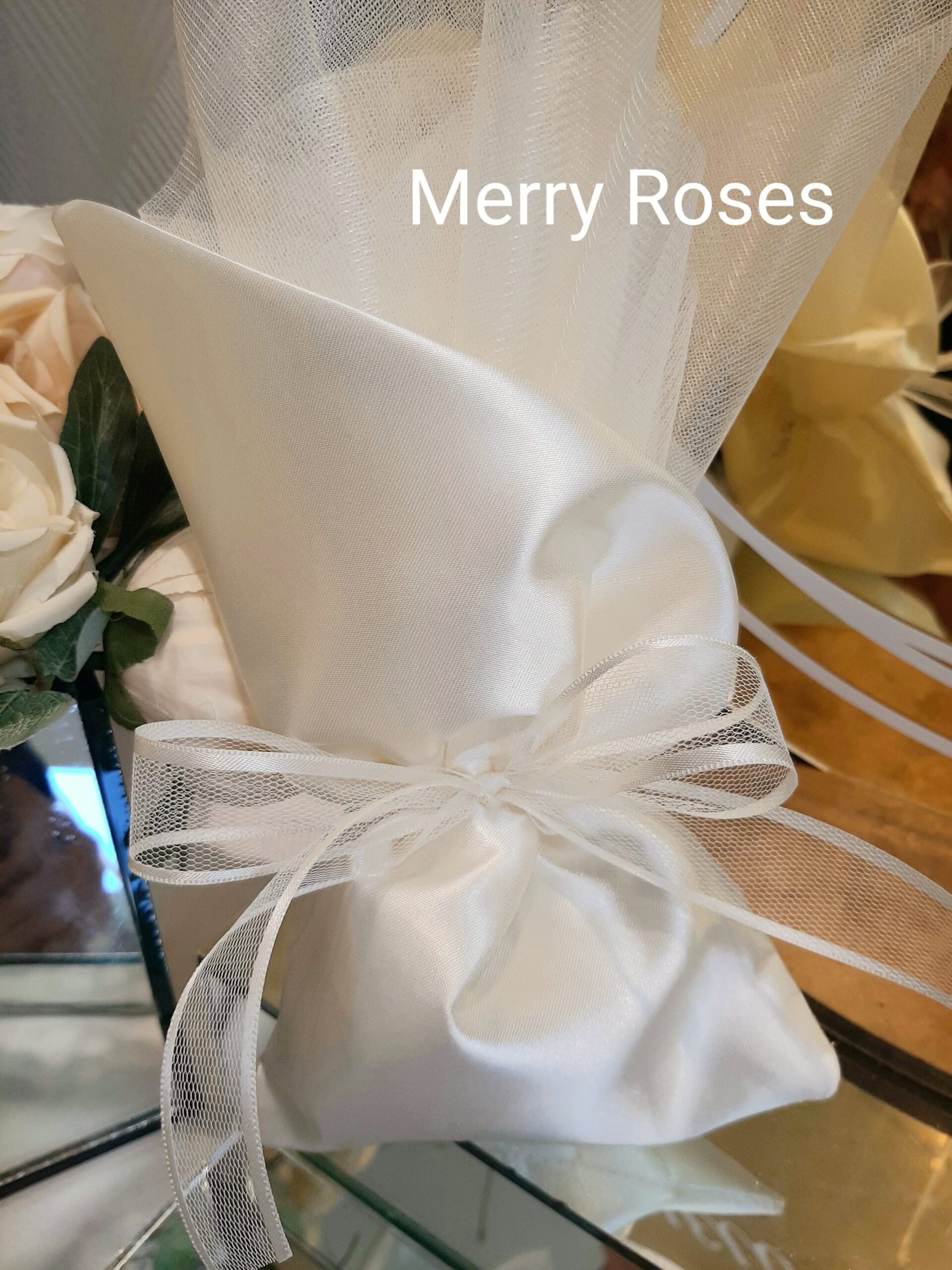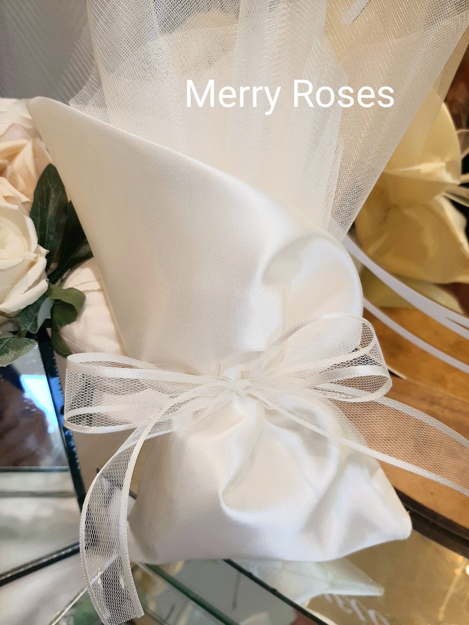 Ιδιαίτερο πουγκί σατέν εκρού λοξό,μπομπονιέρα γάμου 14×26 εκ με τούλι ,δεμένο με ξεχωριστή τούλινη κορδέλα με φινίρισμα ιβουάρ σατέν.