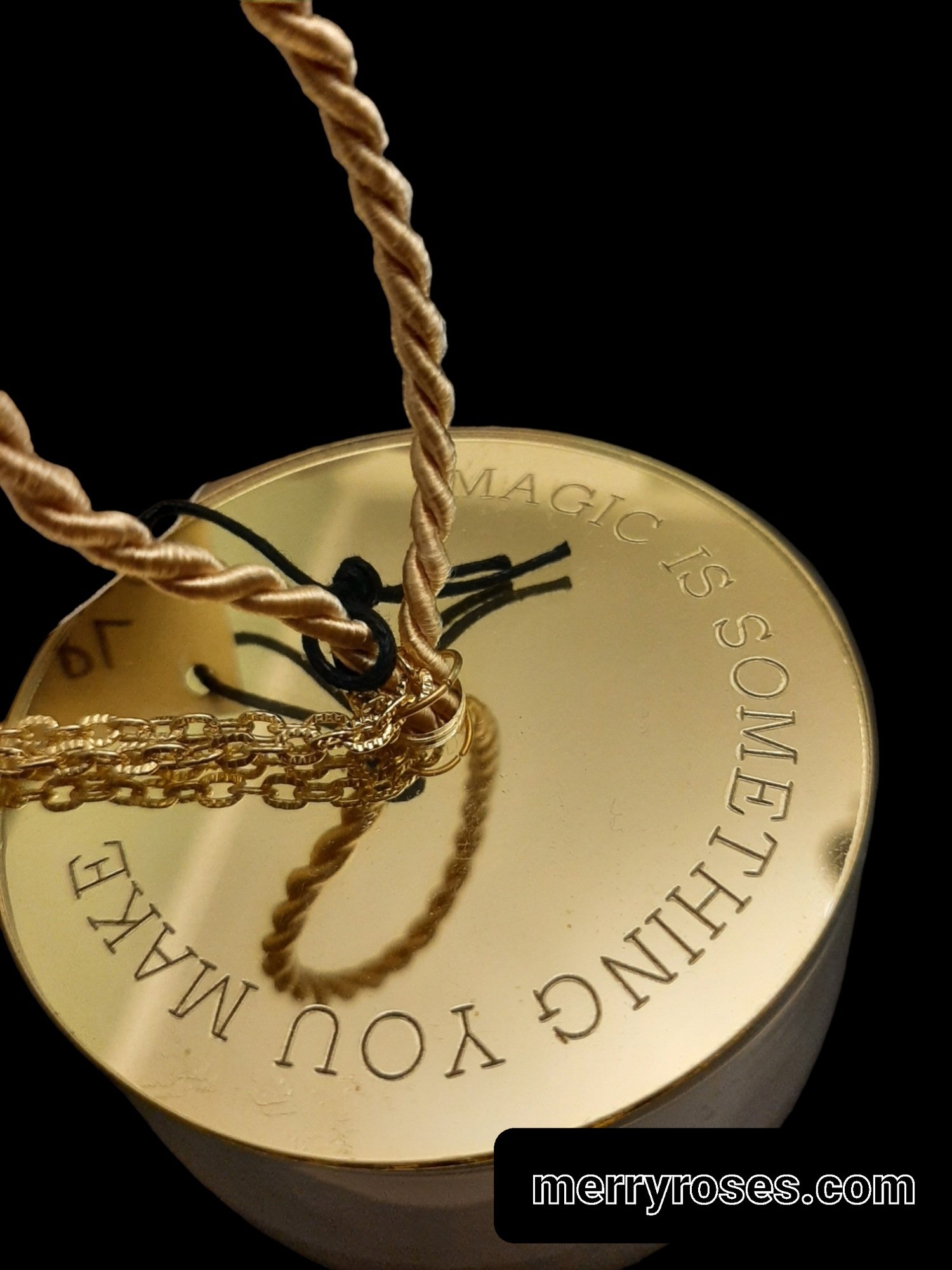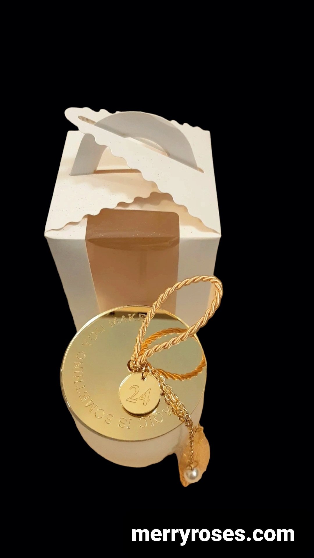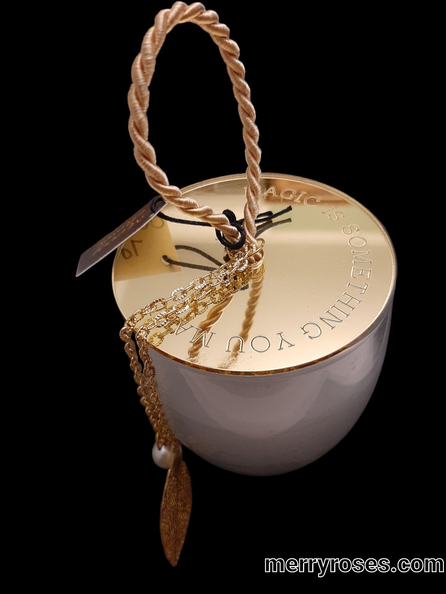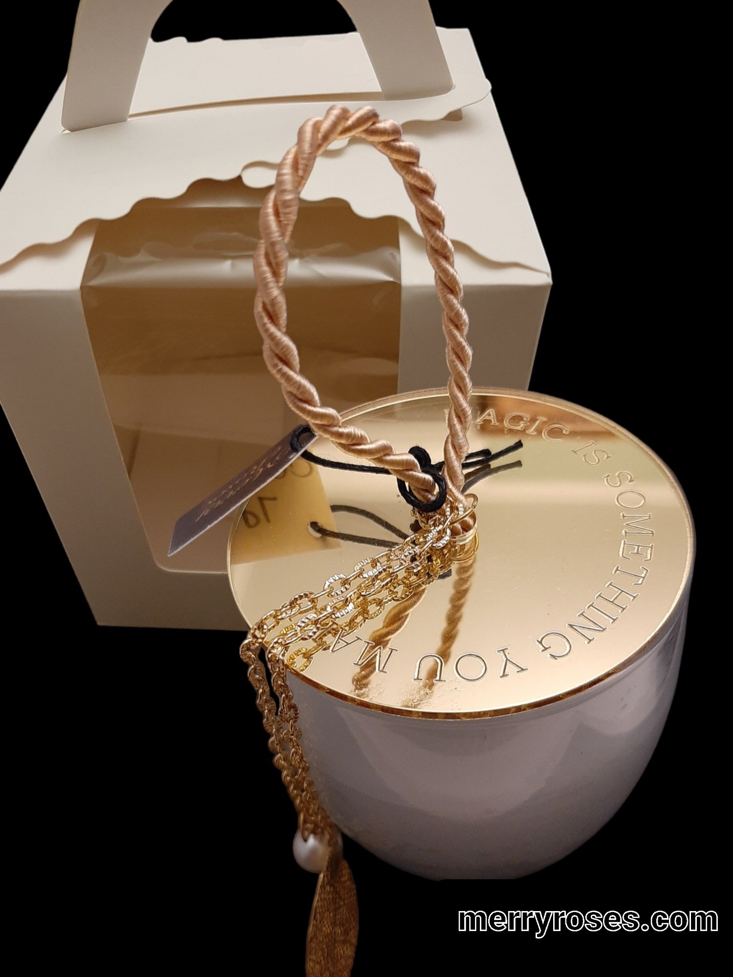 Κερί γυάλινο με χρυσό καπάκι Magic is Something you Make,με χρυσή αλυσίδα κόσμημα και χρυσό 24.