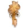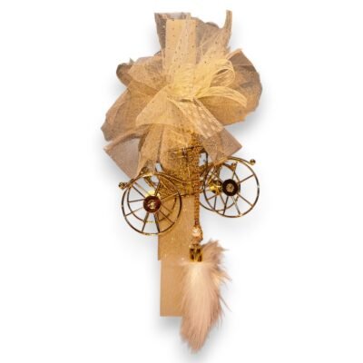 Διακόσμηση: Μεταλλική χρυσή άμαξα/καροτσάκι (cinderella style), τούλι σε χρυσό/μπεζ, φτερό σε nude/ροζ χρώμα, χάντρες και κρεμαστό στολίδι