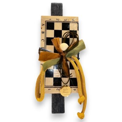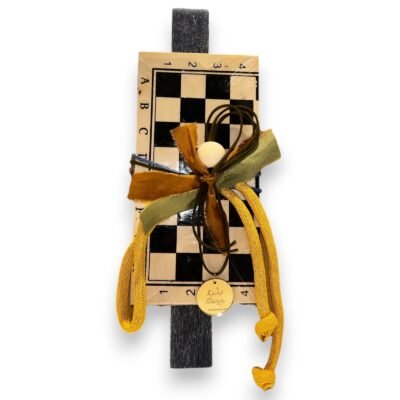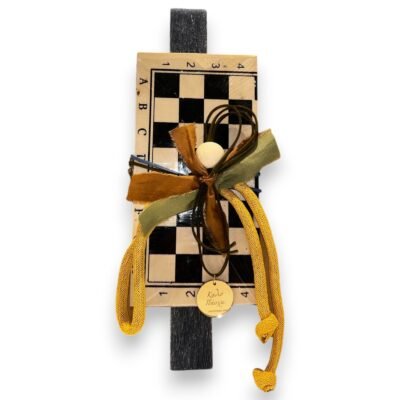 Διακόσμηση: Ξύλινη σκακιέρα (μίνι επιτραπέζιο σκάκι) με καρέ μαύρο-μπεζ και αριθμοποίηση, κορδέλες βελούδινες σε μουσταρδί, χακί και καφέ, μεταλλικοί κρίκοι, ξύλινη χάντρα, μενταγιόν “Καλό Πάσχα”
