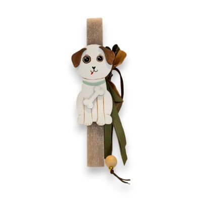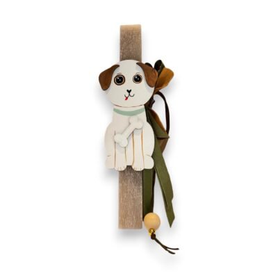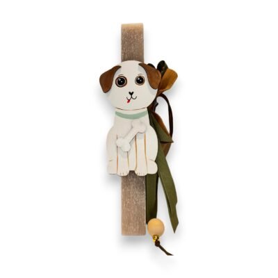 Διακόσμηση: Ξύλινο σκυλάκι (dog face), κορδέλες βελούδινες σε πράσινο/χακί, ξύλινες χάντρες, μεταλλικό μενταγιόν “Καλό Πάσχα”