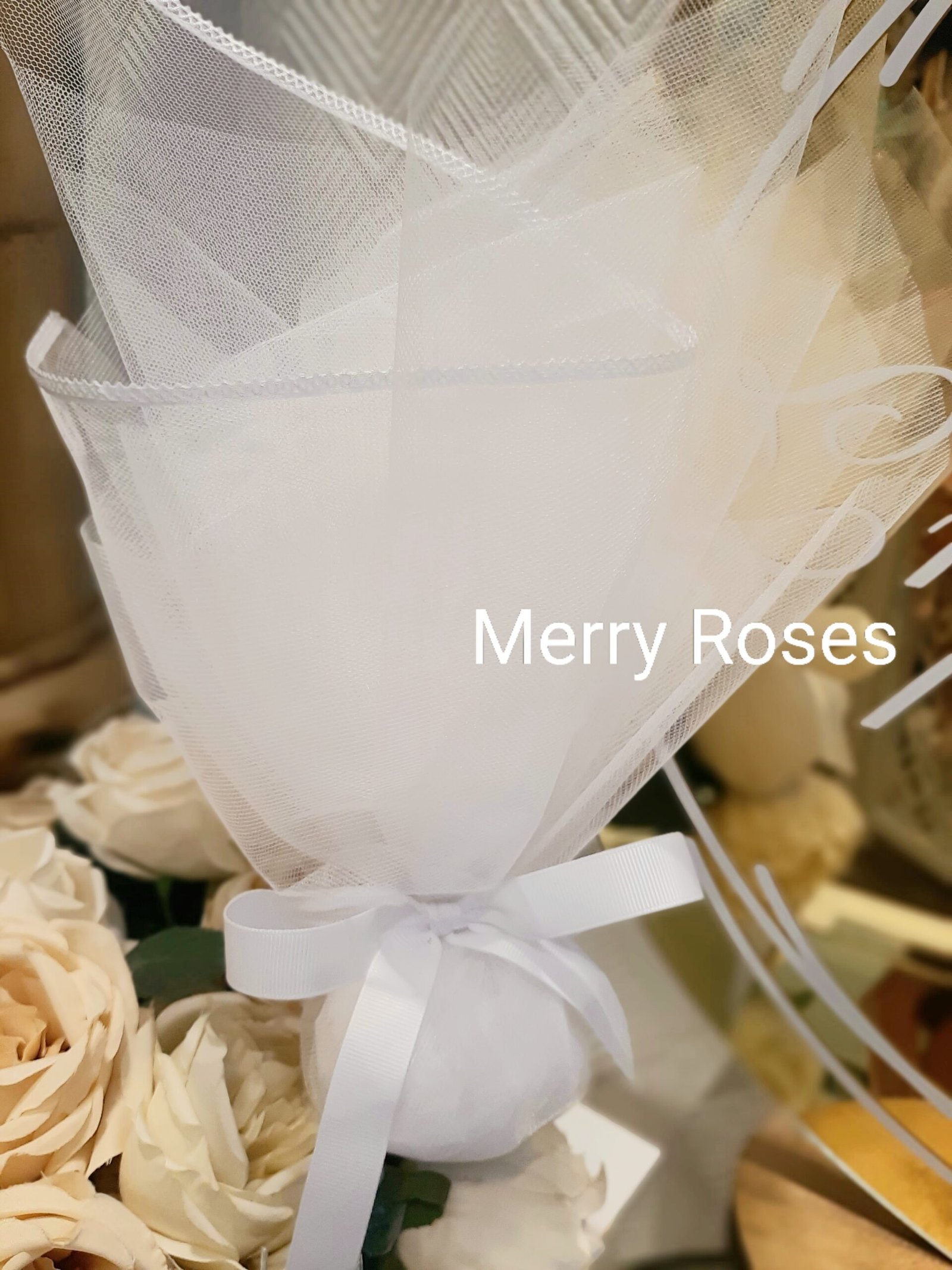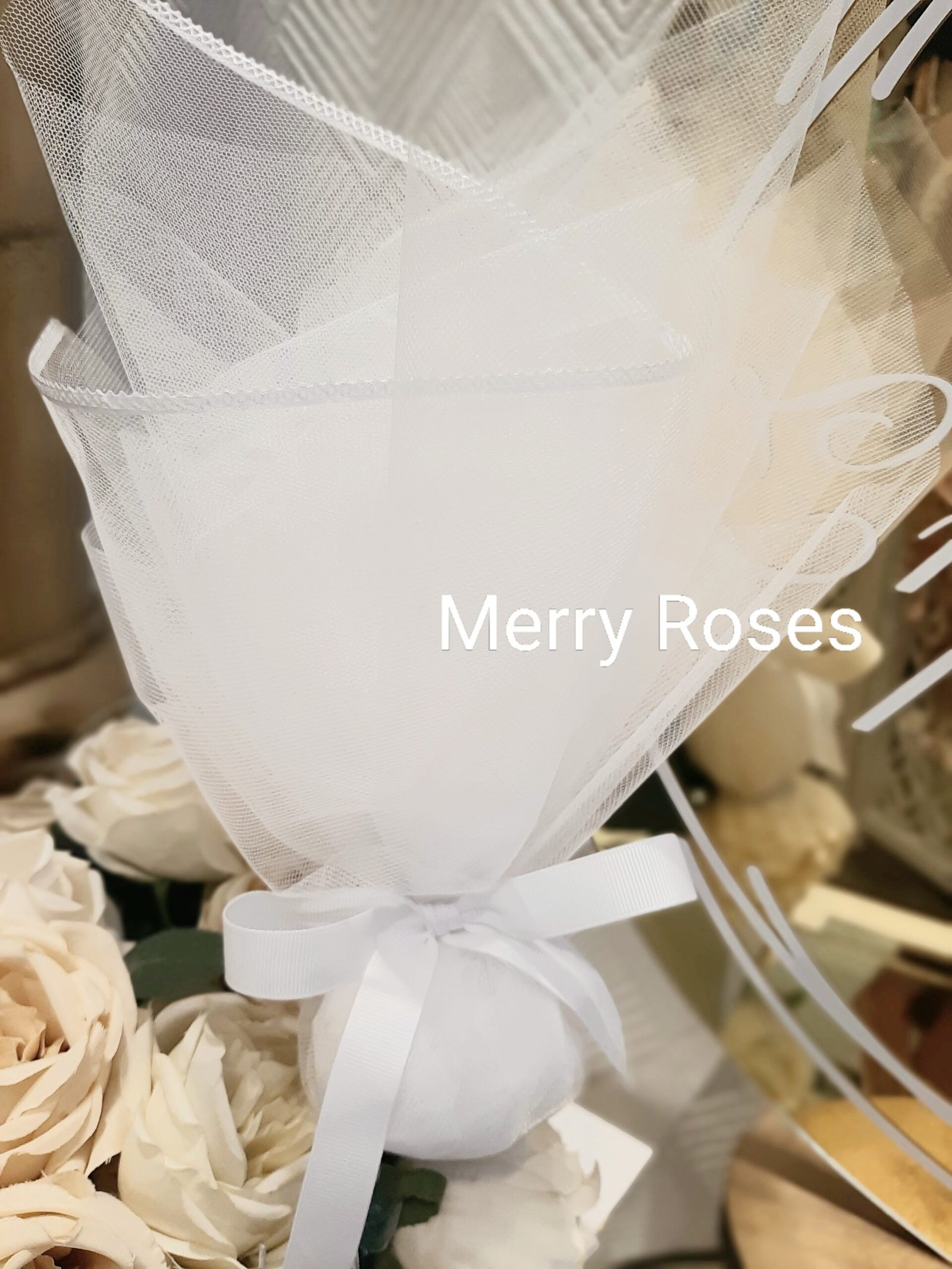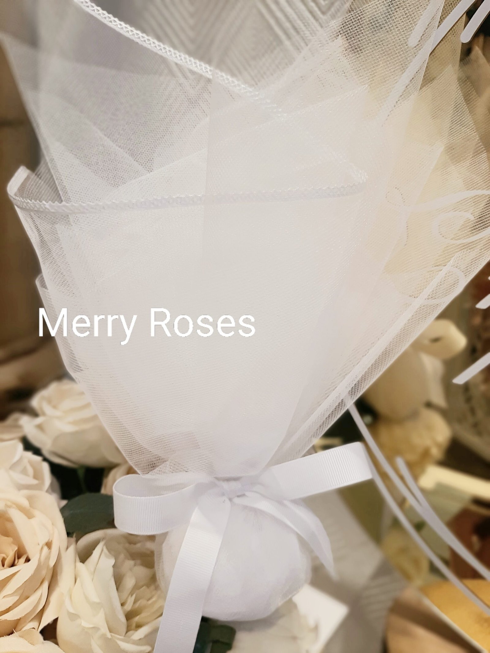 Τούλινη μπομπονιέρα γάμου με λευκό φινίρισμα σατέν και λευκό φιόγκο απο γκρό κορδέλα.