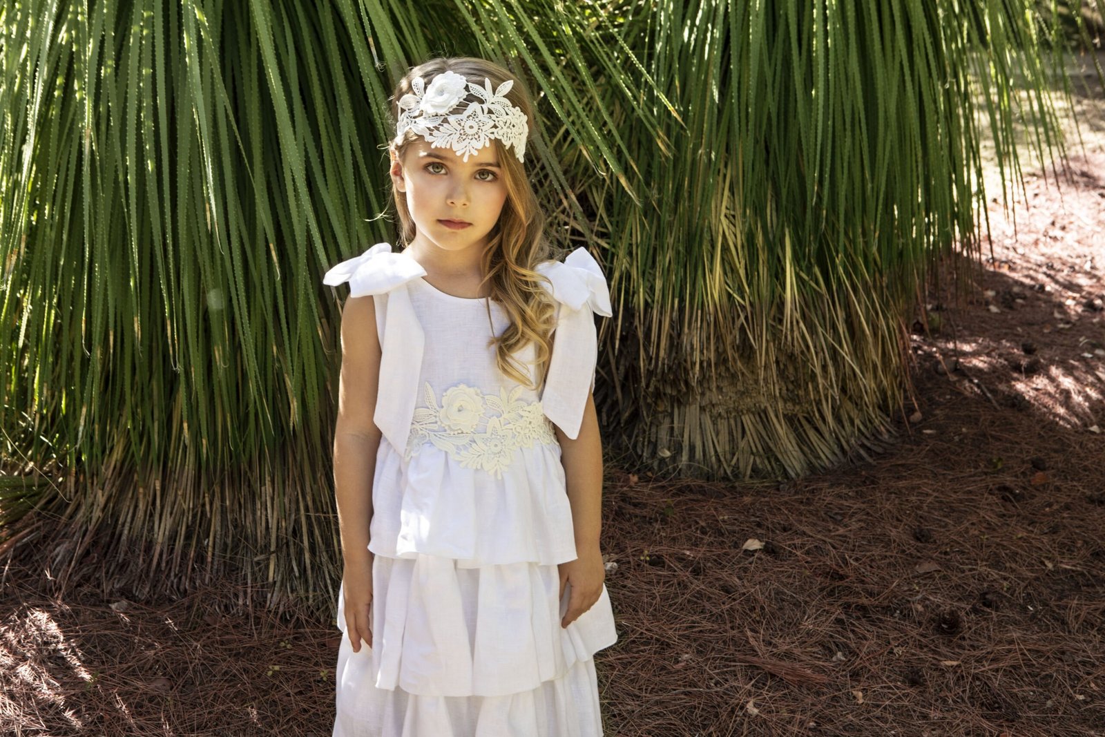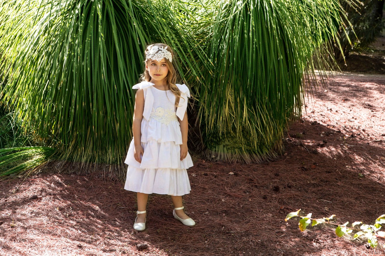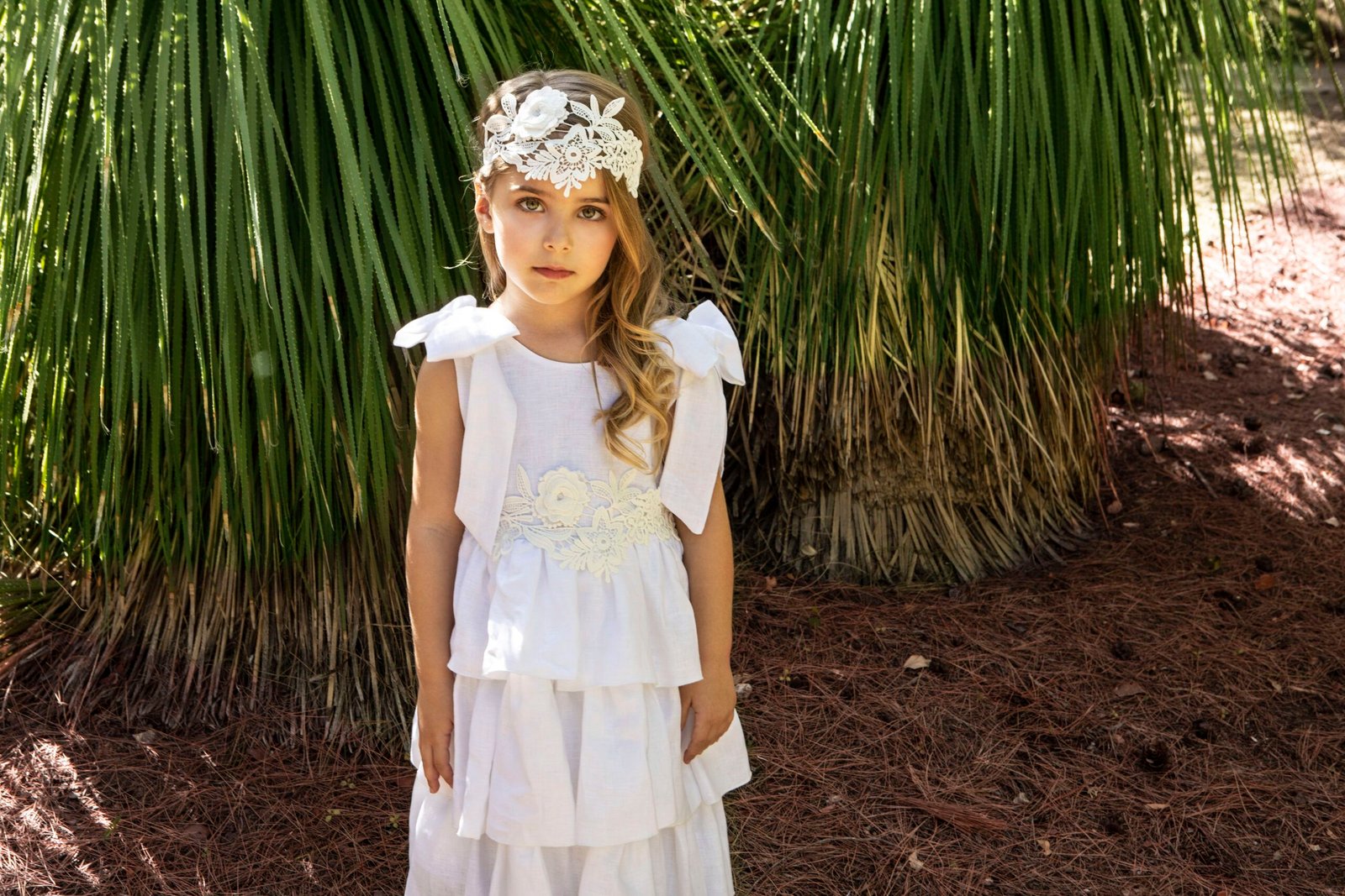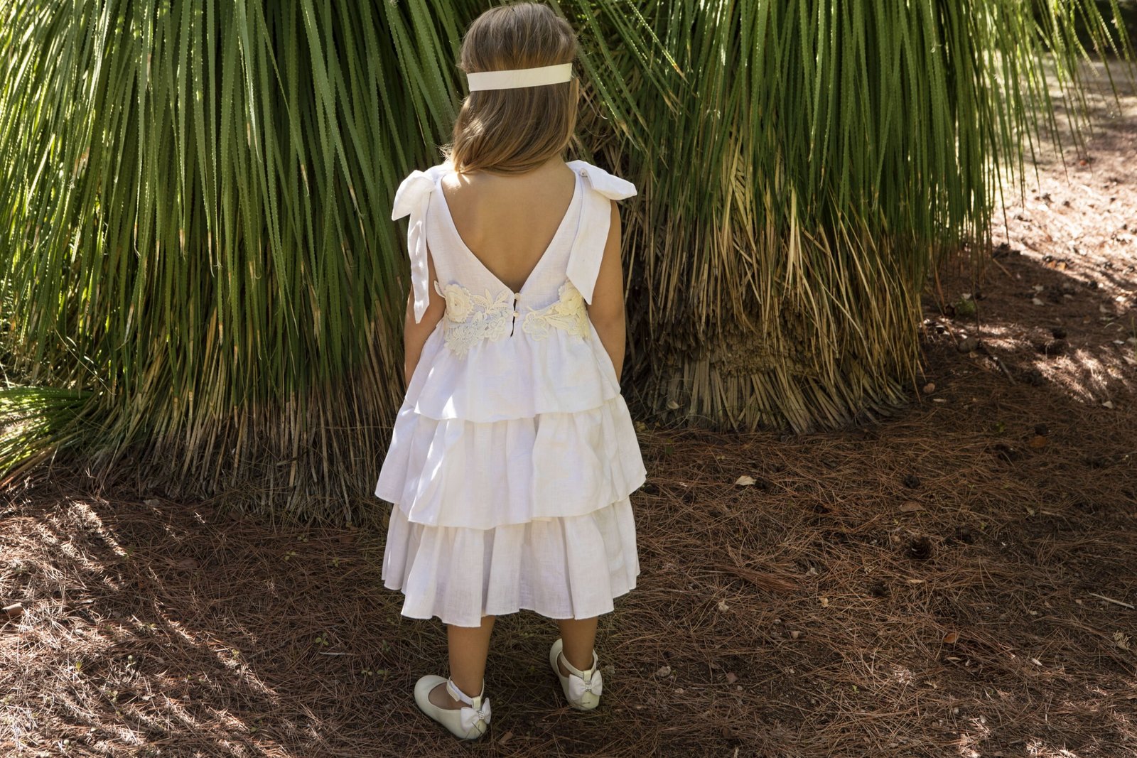 Minimal φόρεμα Βάπτισης , σε λευκή απόχρωση . Η κομψότητα του λινού σε συνδυασμό με βαμβακερές τρέσες δημιουργούν ένα chic αποτέλεσμα. Φιόγκους στους ώμους και βολάν στη φούστα ολοκληρώνουν αυτό το εκπληκτικό φόρεμα . Ασορτί κορδέλα με το ίδιο λουλούδι του φορέματος κατ’ επιλογή μπαντάνα ή τουρμπάνι .