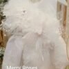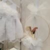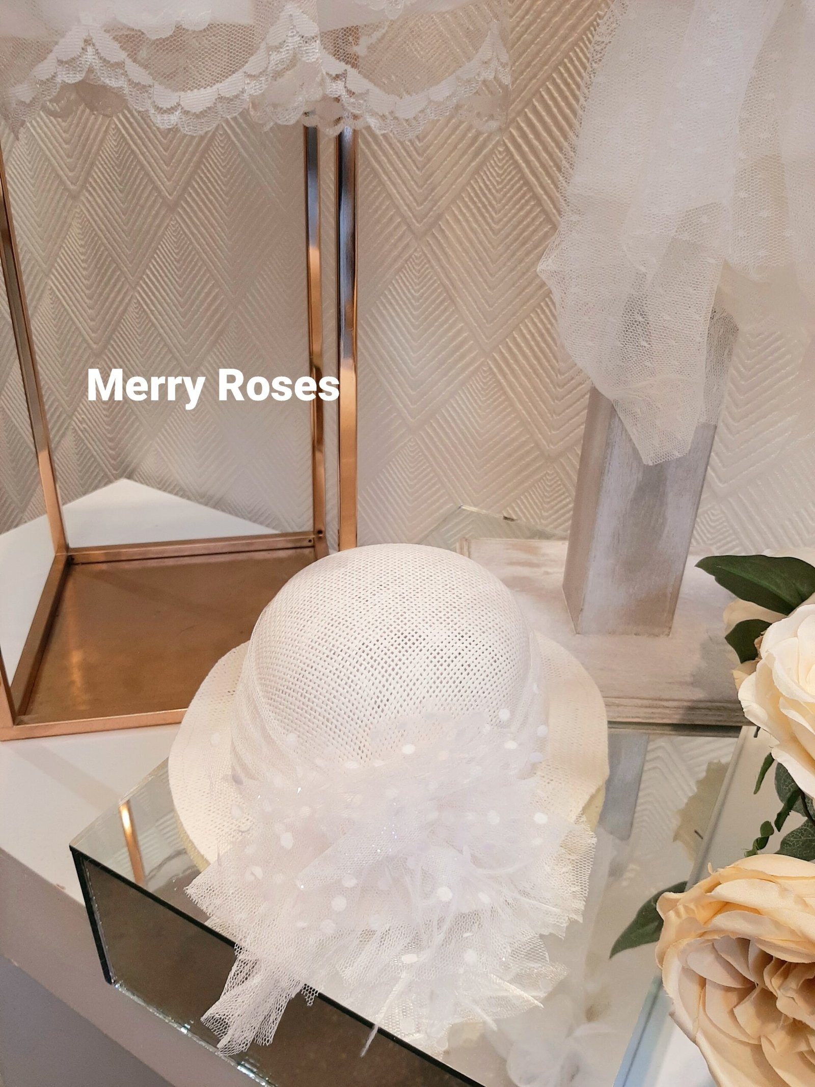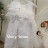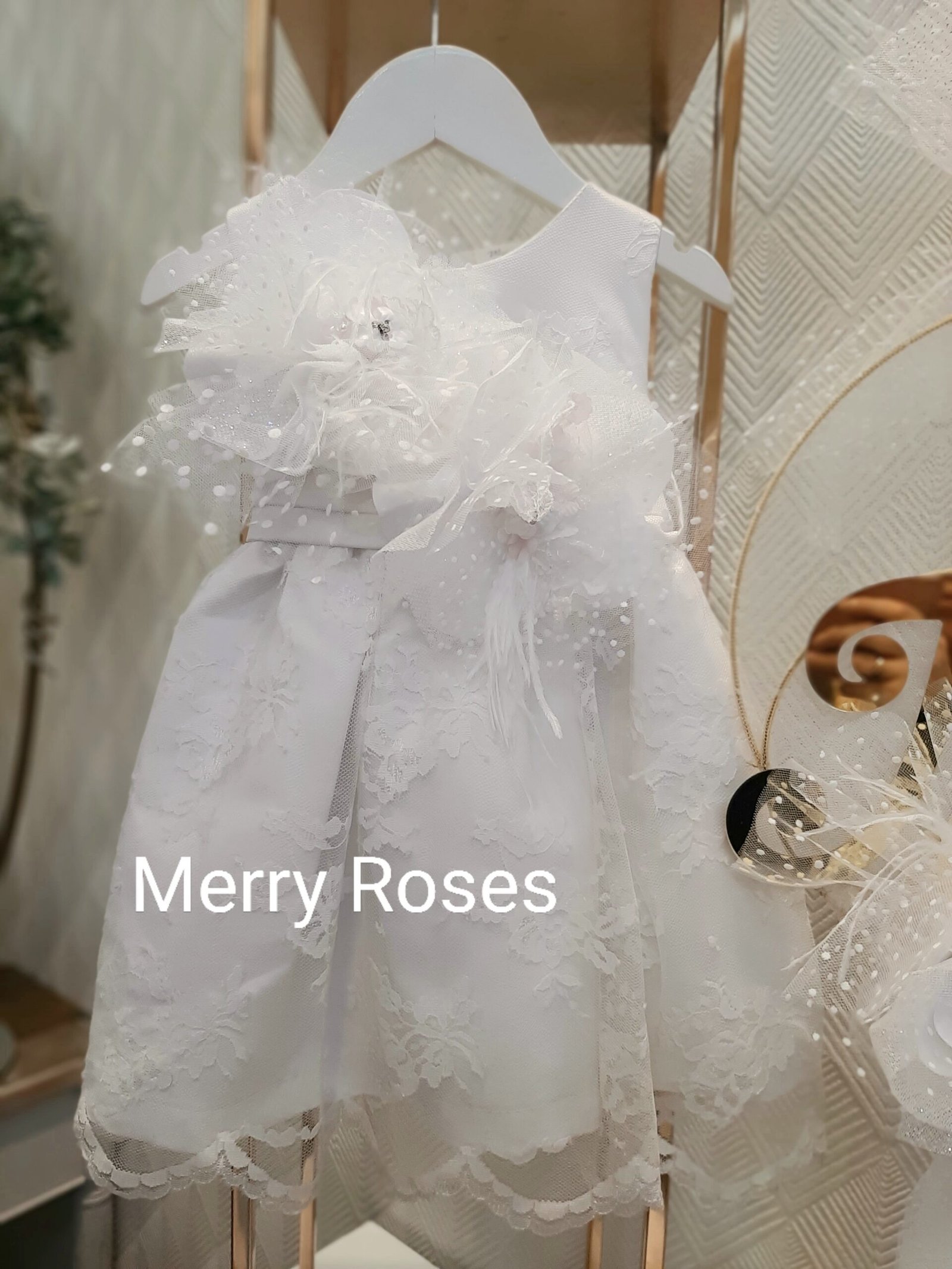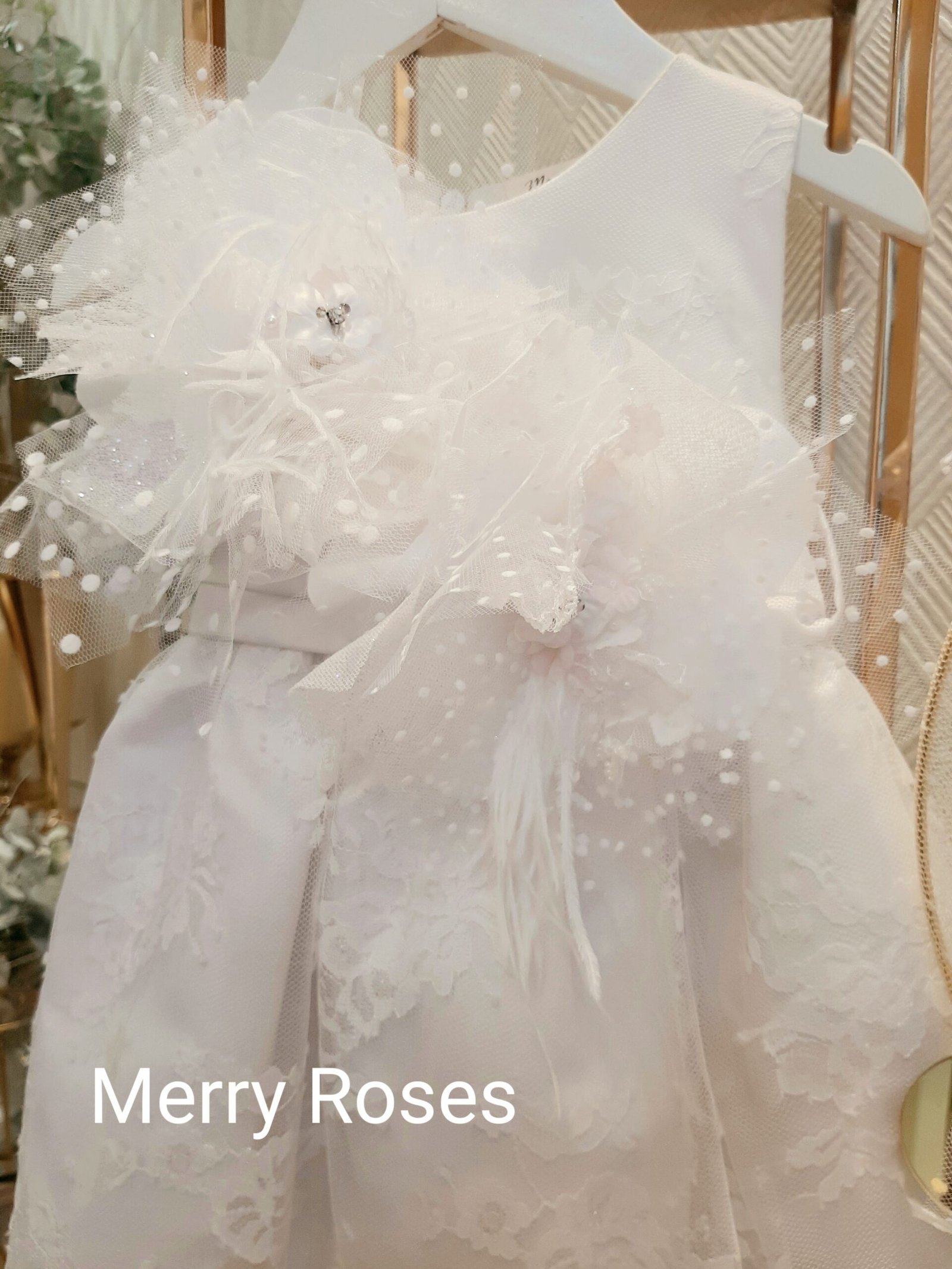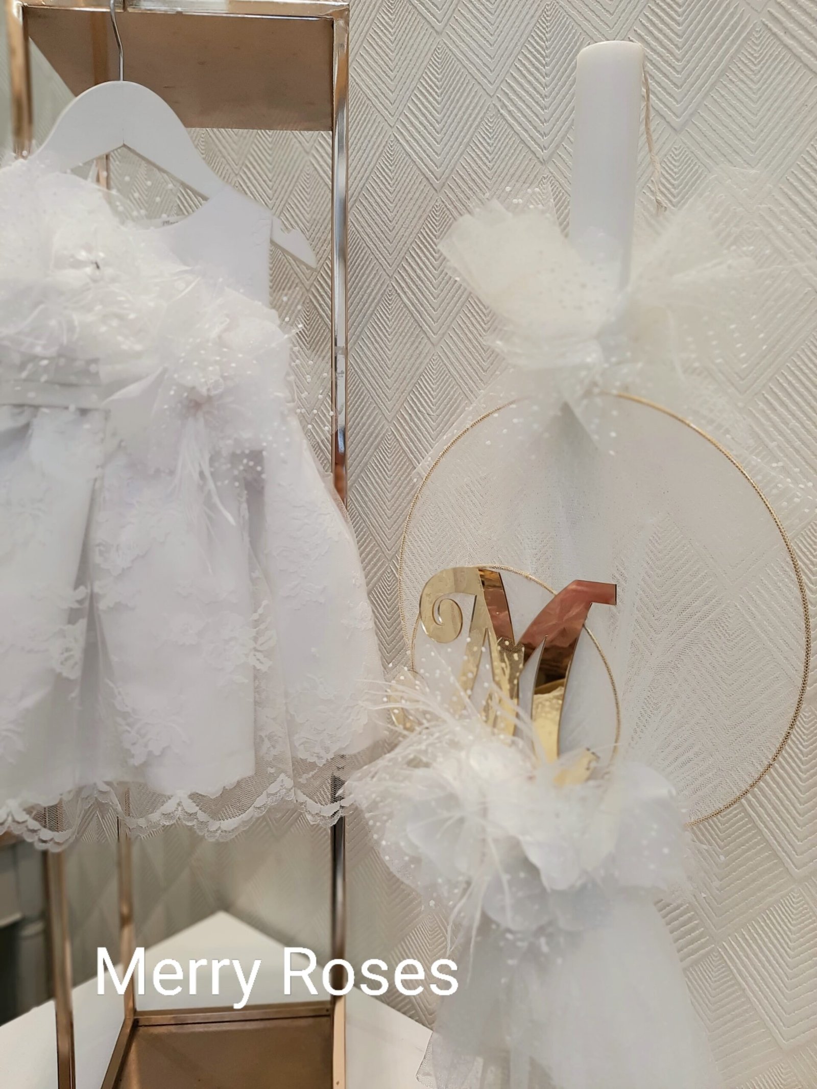 Λευκό βαπτιστικό φόρεμα με δαντέλα και μπουτονιέρα λουλούδι με φτερά και swarovski,μαζί με καπέλο.