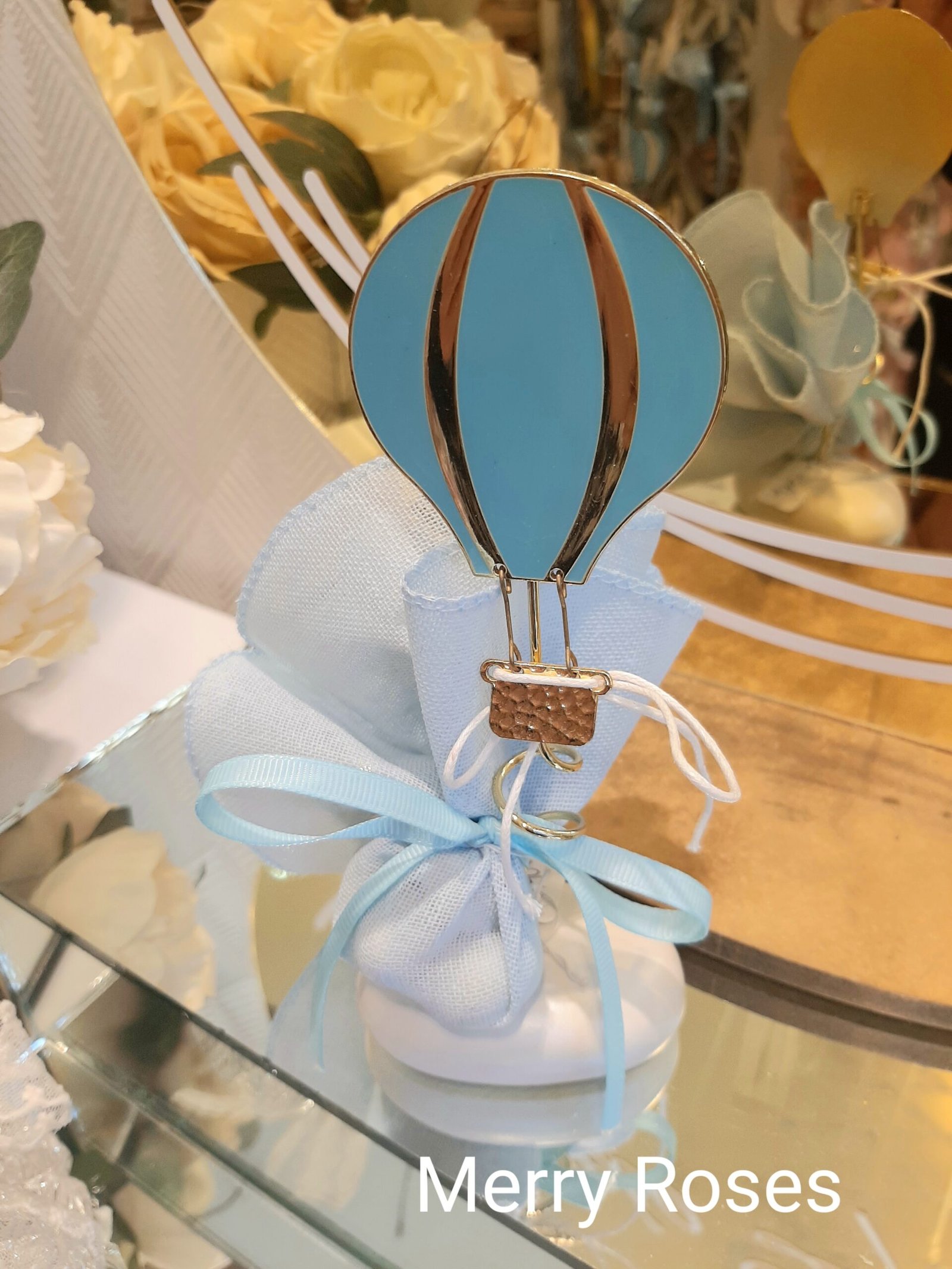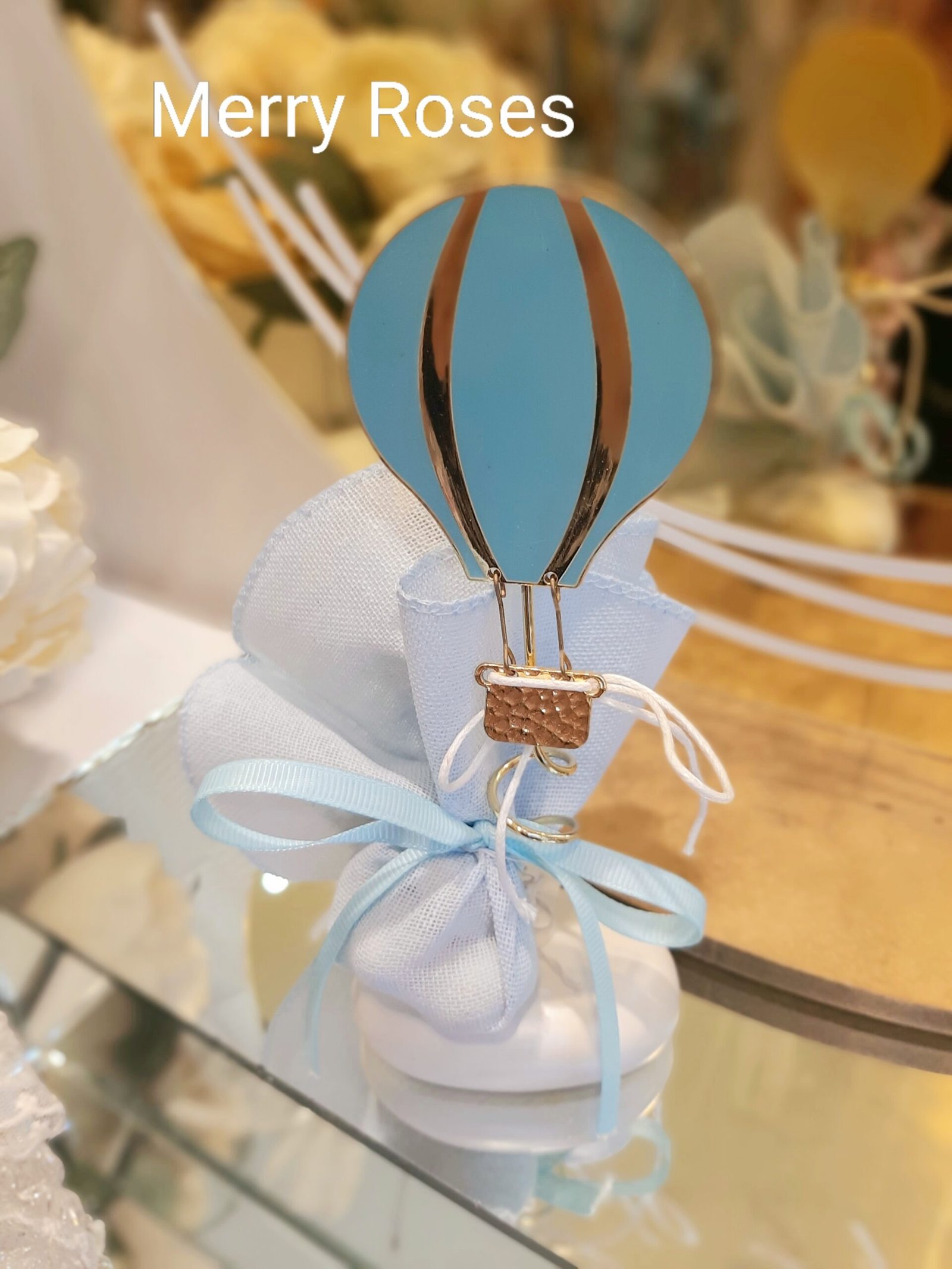 Μπομπονιέρα βάπτισης μεταλλικό χρυσό αερόστατο με σμάλτο.