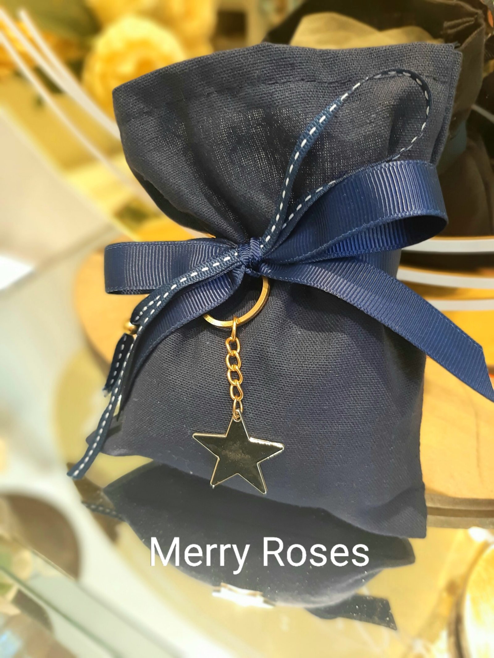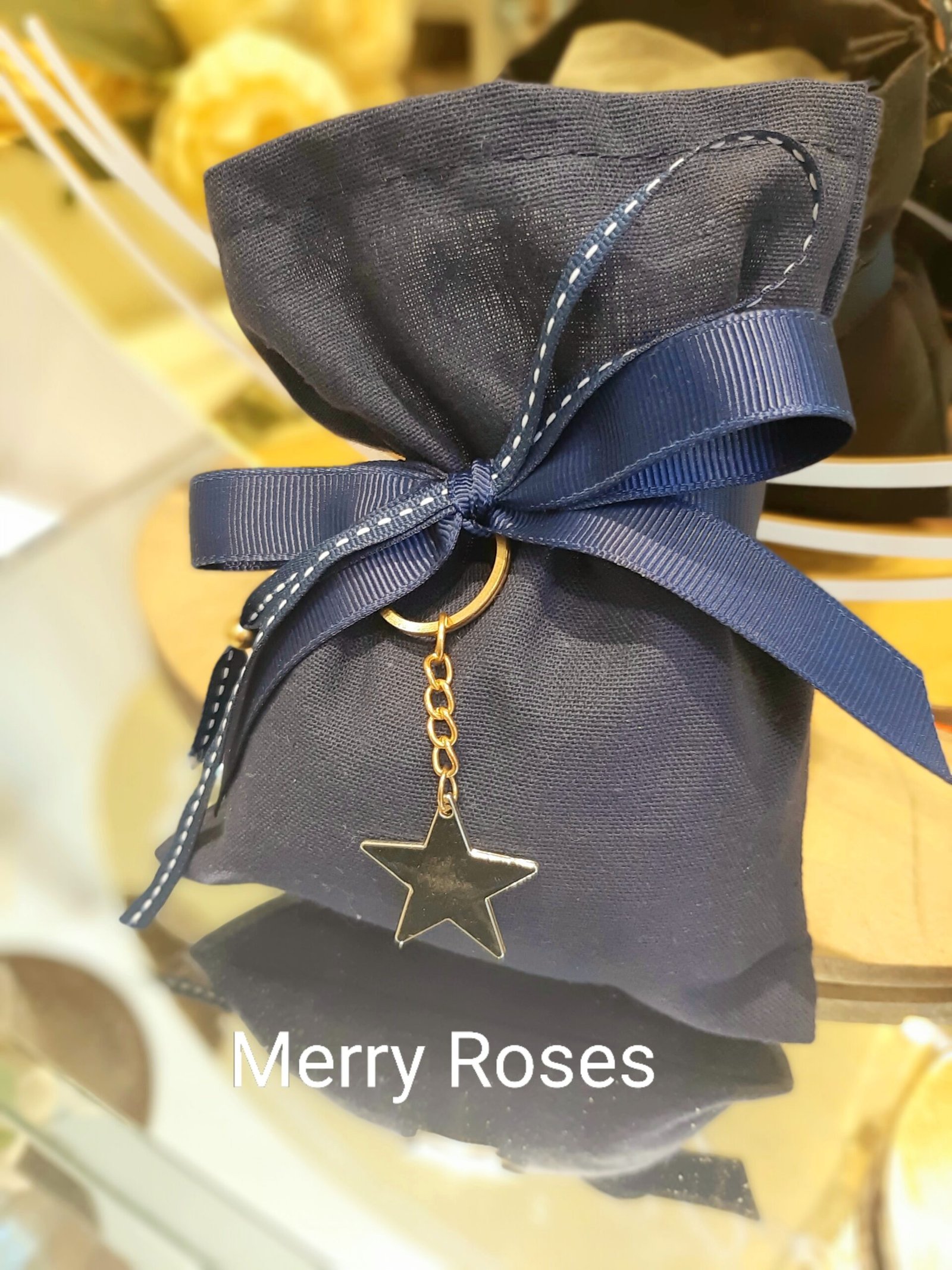 Μπομπονιέρα βάπτισης μεταλλικό χρυσό αστέρι μπρελόκ σε μπλέ σκουρο πουγκί,δεμένο με 2 κορδέλες.
