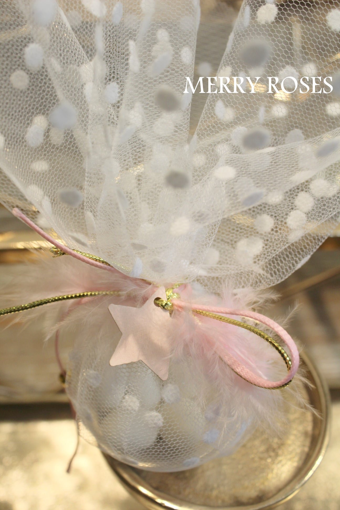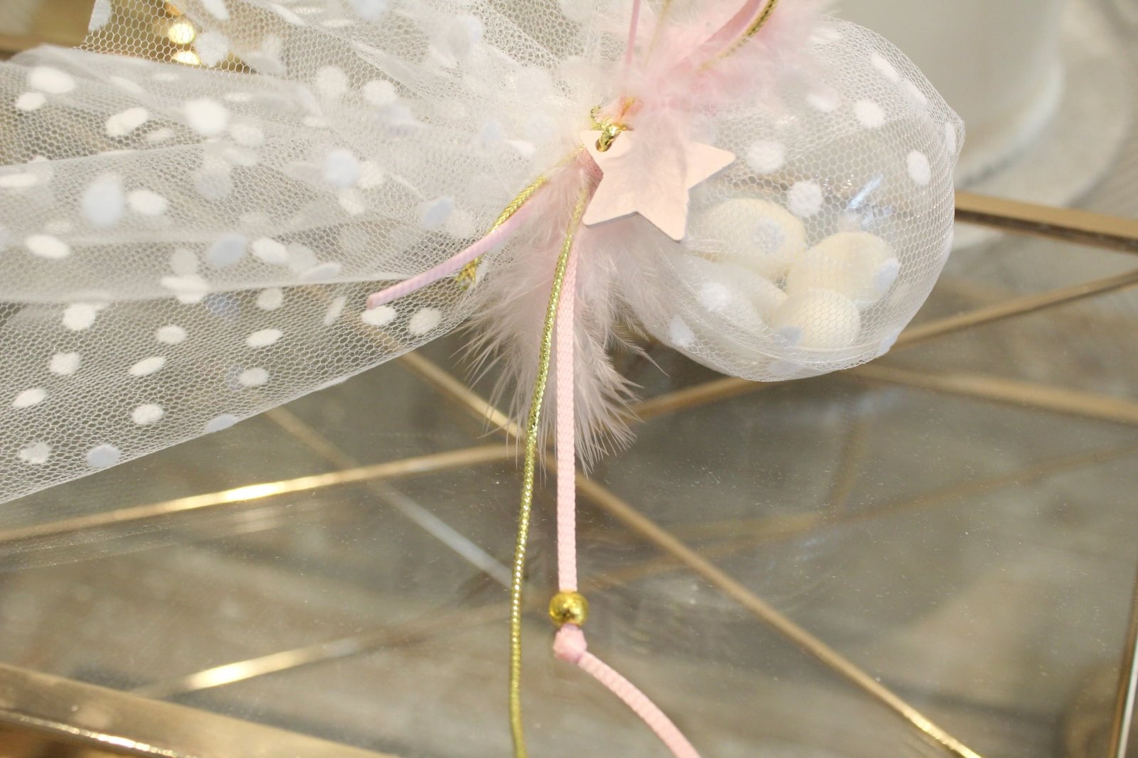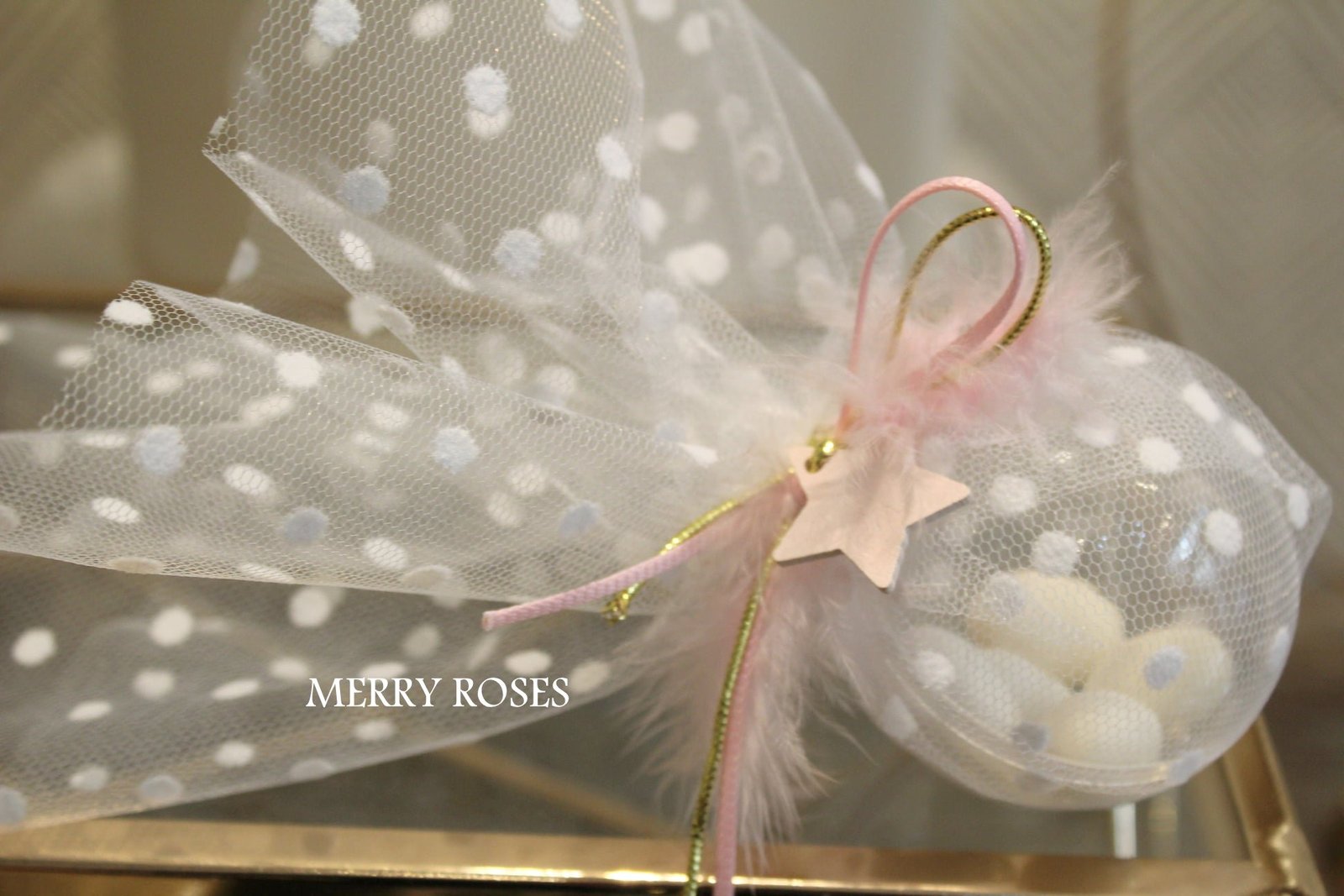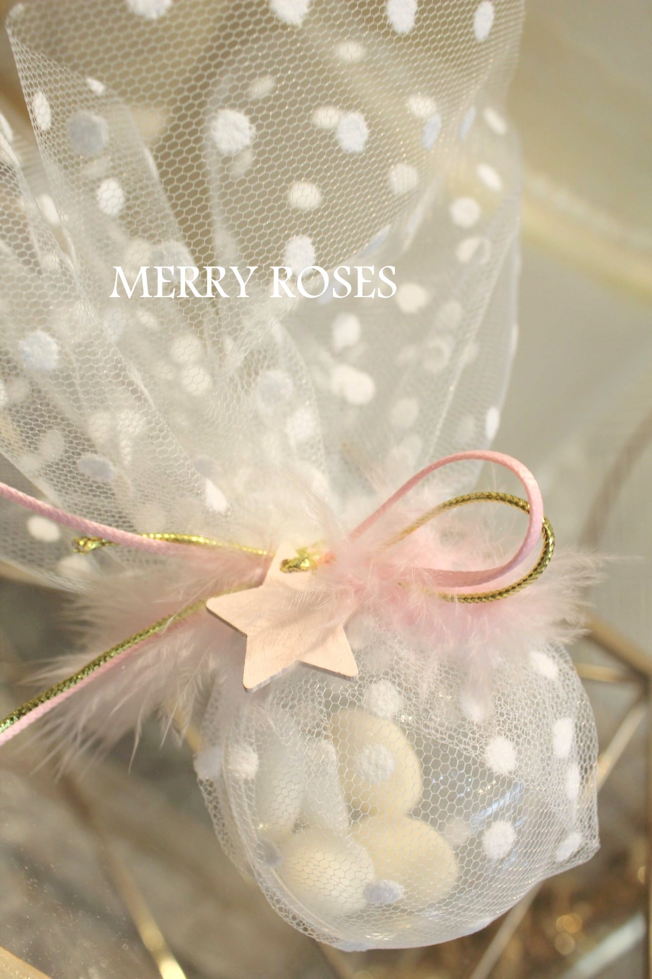 Μπομπονιέρα βάπτισης με μπαλίτσα 8εκ ,μαζί με πουά τούλι και δέσιμο με 2 τμχ κορδέλες ροζ ,χρυσή ,μαζί αστεράκι ροζ , φτερο και χρυσή χάντρα.