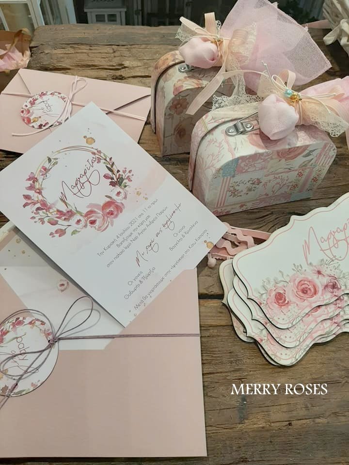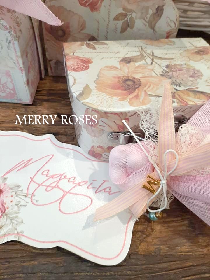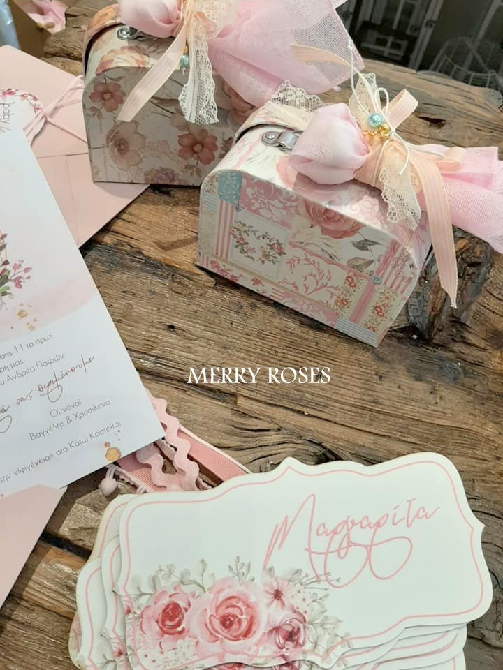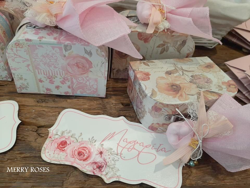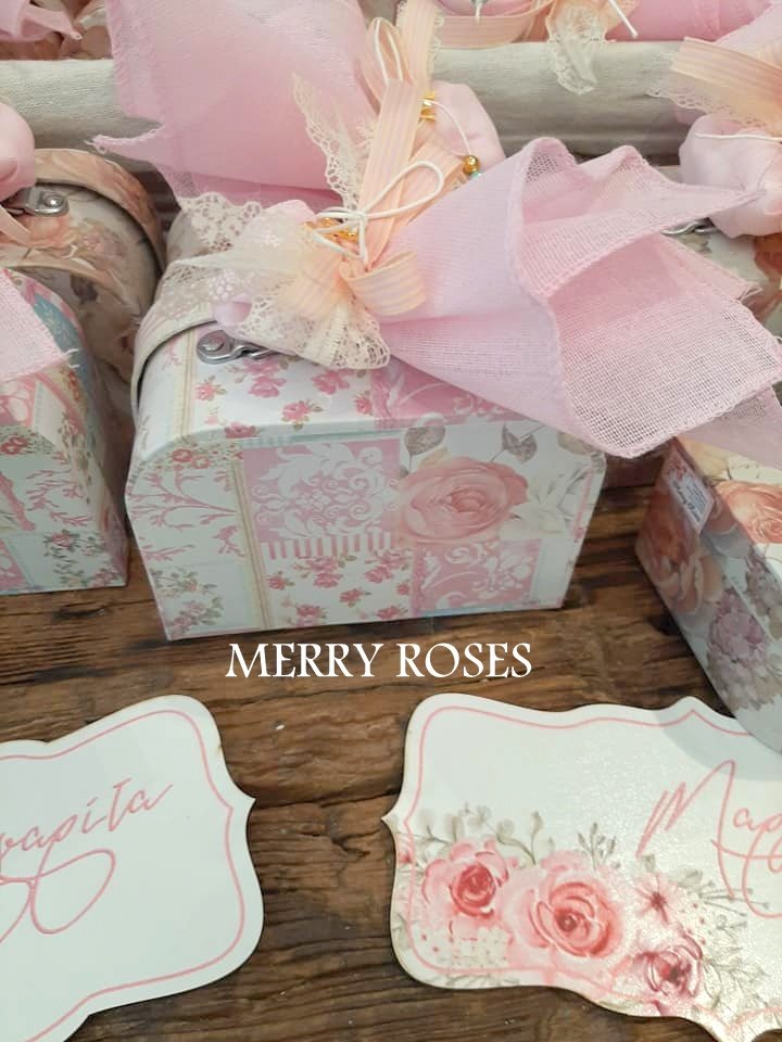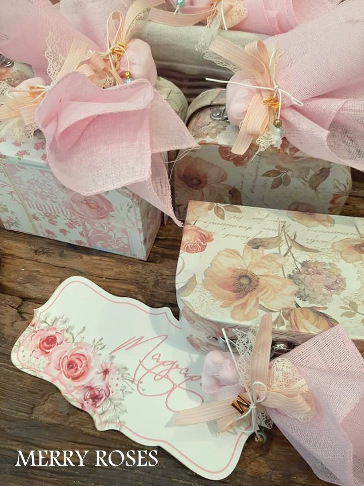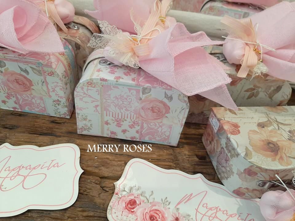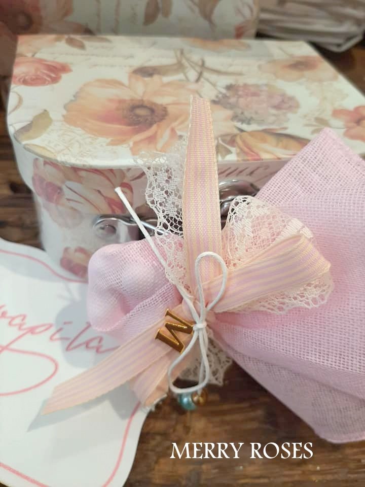 Μπομπονιέρα βάπτισης βαλιτσάκια floral σε 2 σχέδια δεμένα με γαζούλα και ποικιλία απο κορδέλες με 5 κουφέτα κλασικά αμυγδάλου