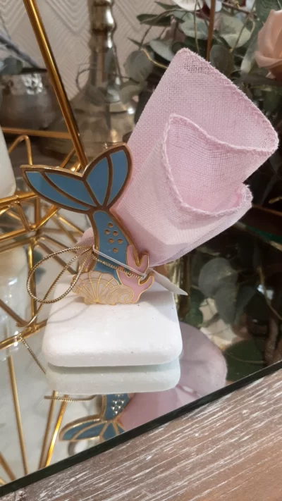 Πέτρινη βάση 5,5 εκ με μεταλλική διακοσμητική ουρά γοργόνας απο σμάλτο. Ύψος 10 εκ Περιλαμβάνει 5 κουφέτα κλασσικά Παραγγελία 30 μέρες Ελάχιστη ποσότητα 50 τμχ