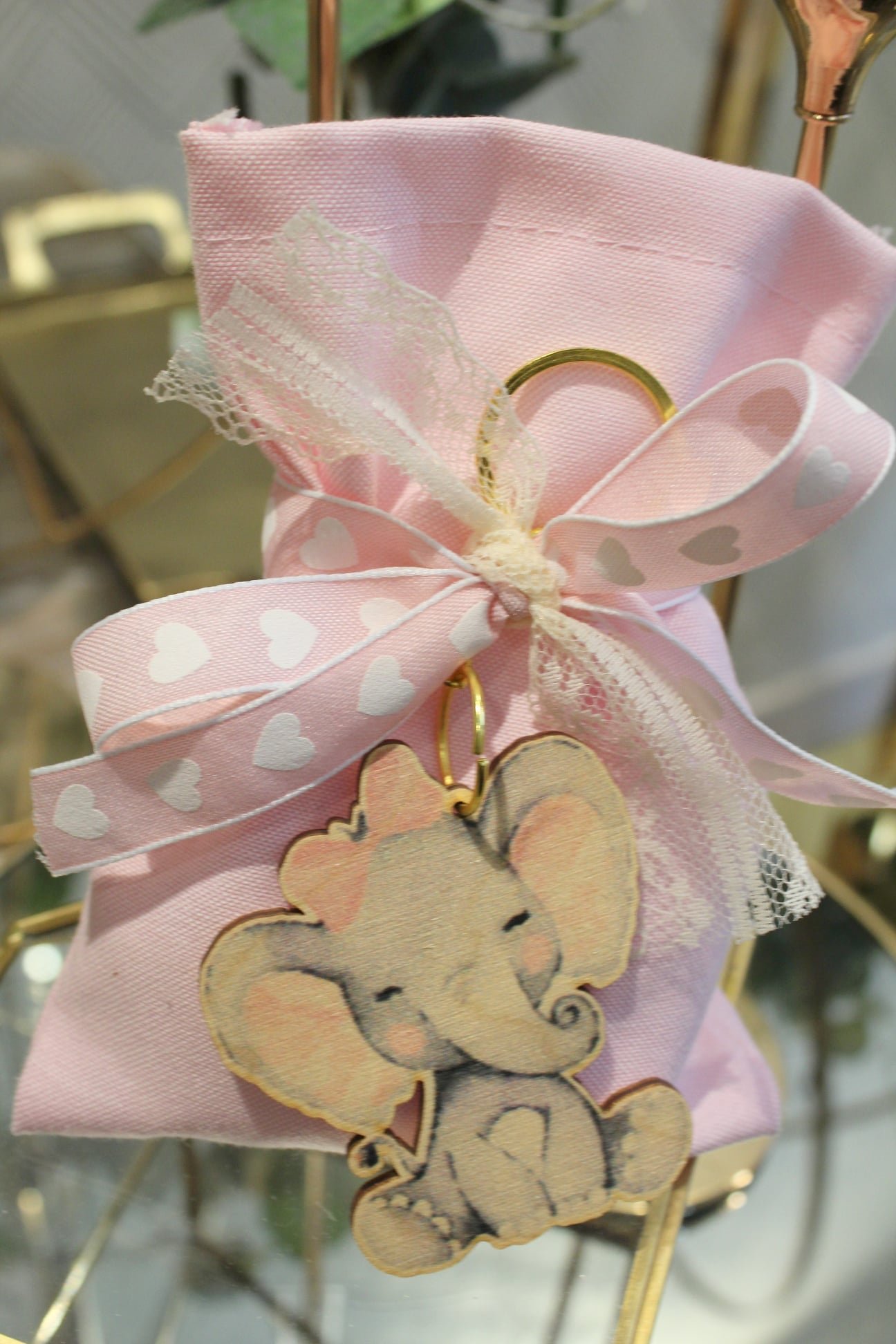 Ρόζ βαμβακερό πουγκί με κορδέλες και ελεφαντάκι μπρελόκ