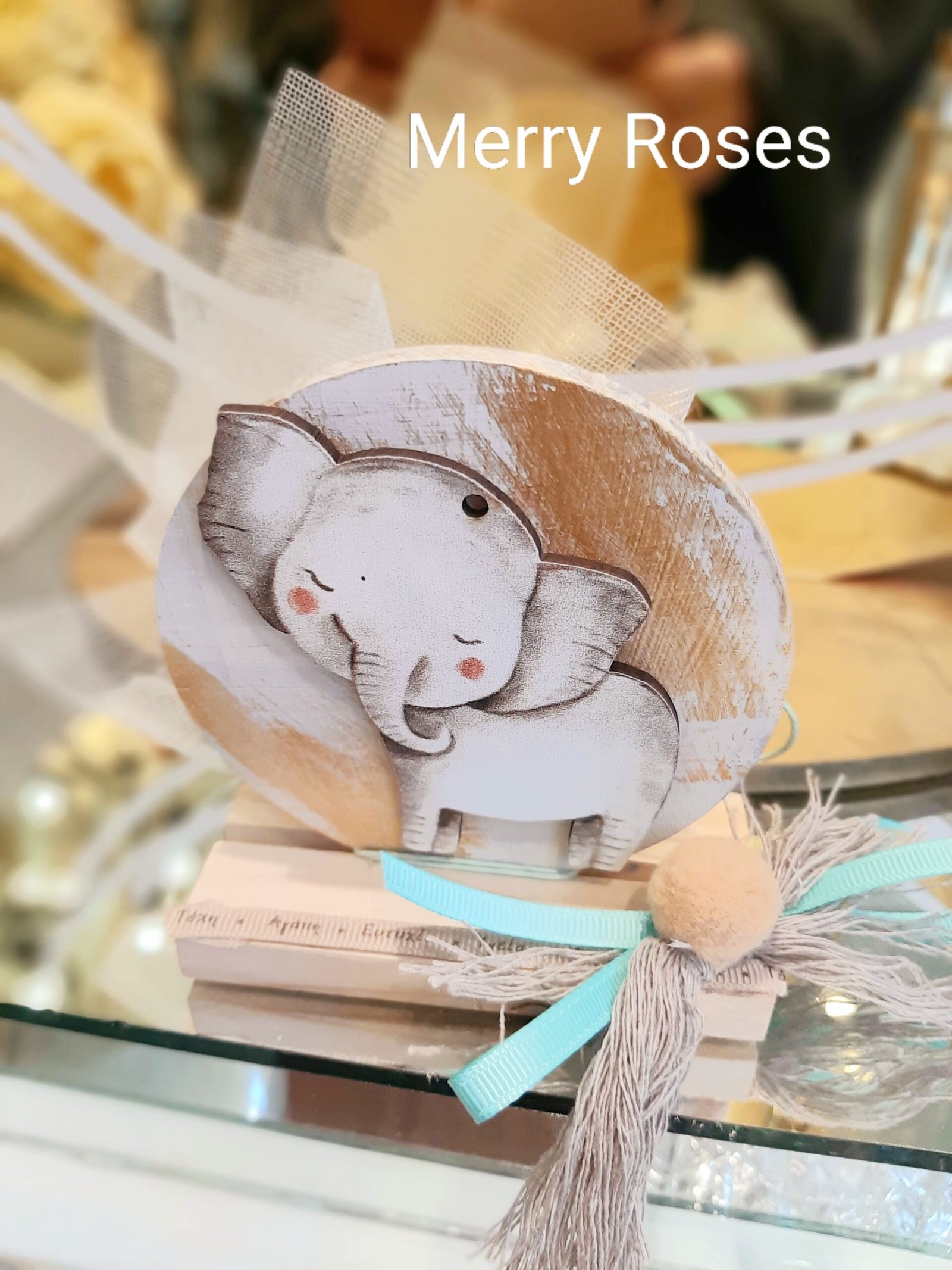 Μπομπονιέρα βάπτισης ελεφαντάκι σε ξύλινη βάση σταντ.