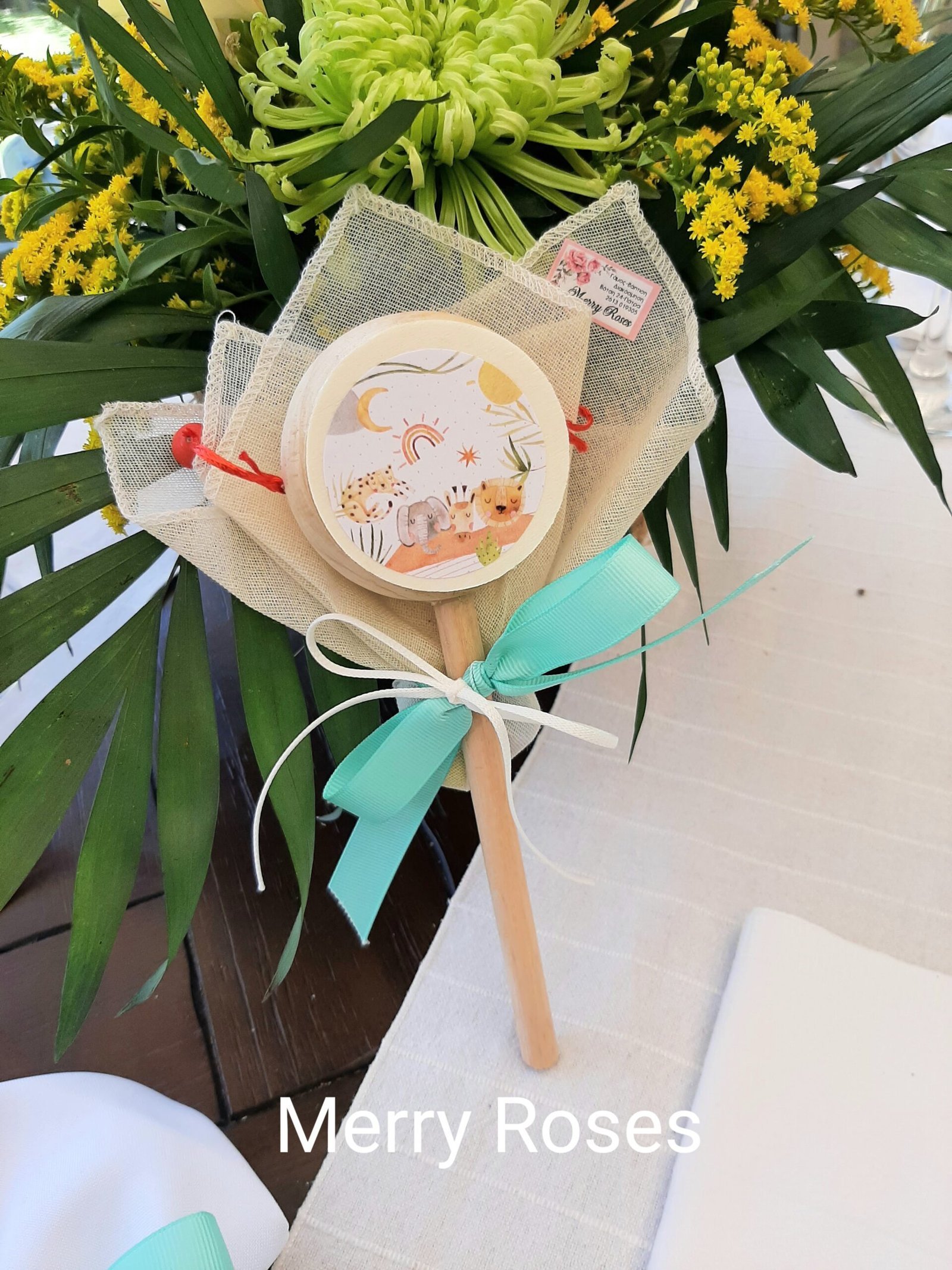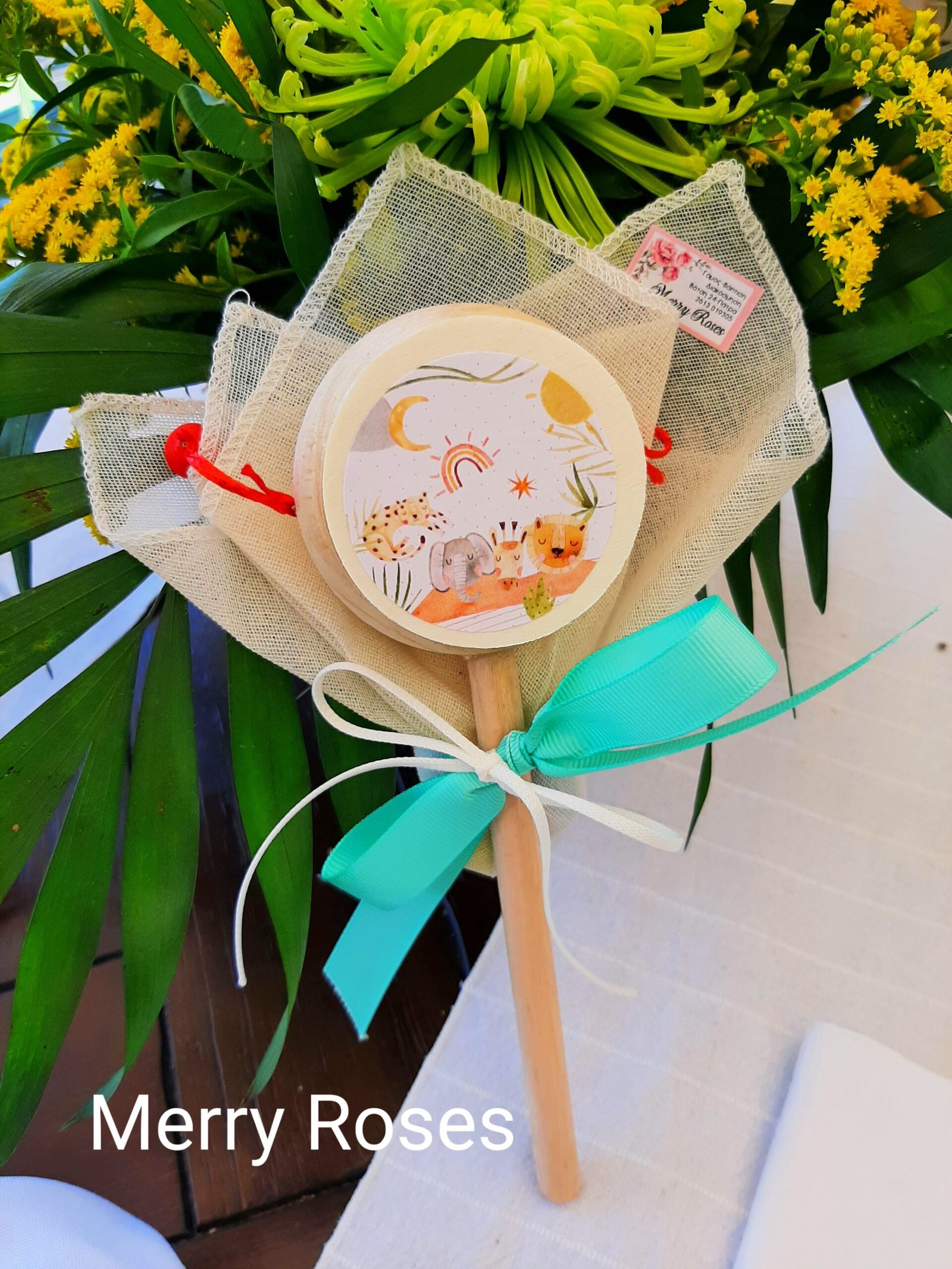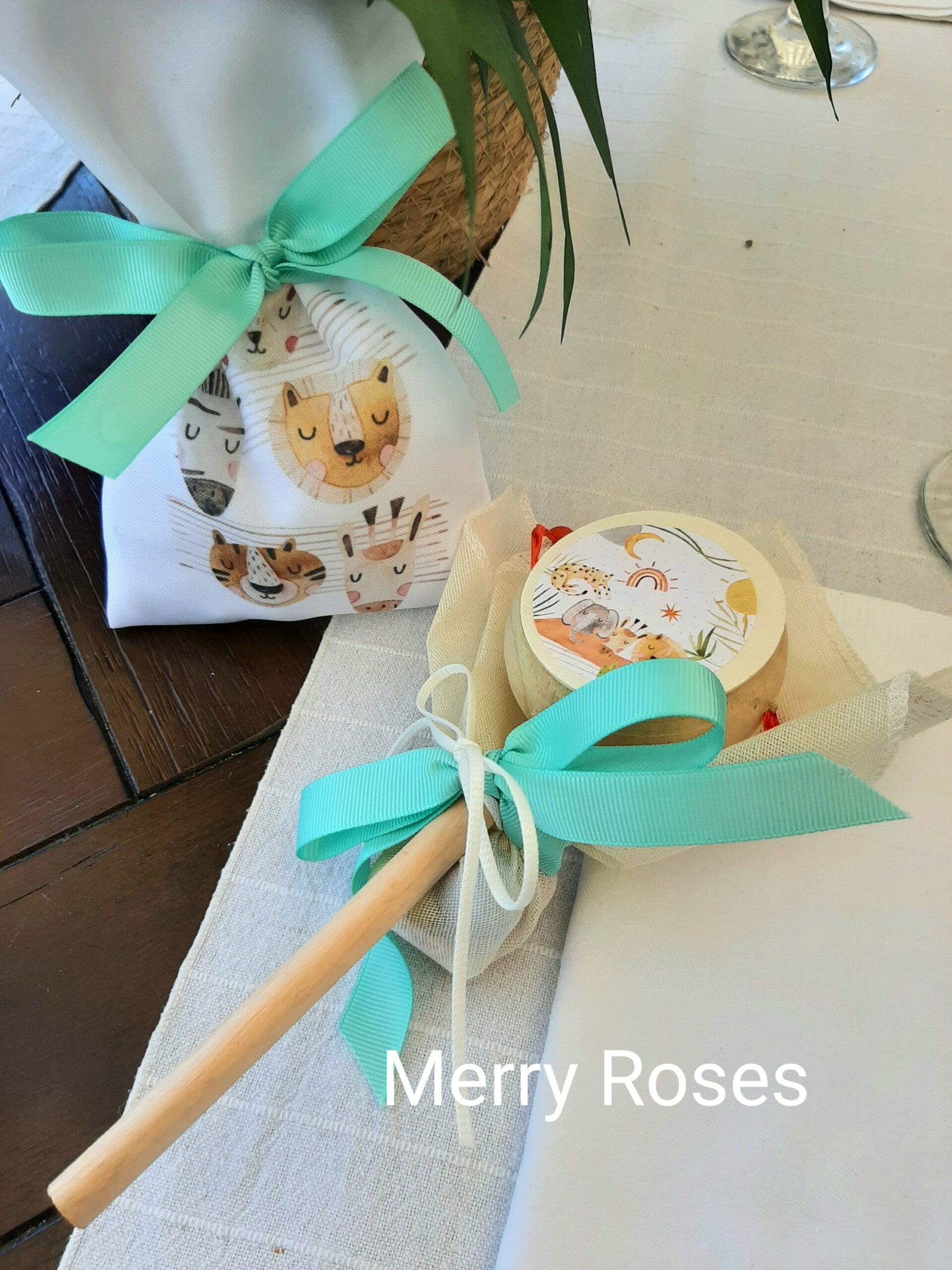 Μπομπονιέρα Βάπτισης ,ξύλινο τυμπανάκι παιχνίδι με τα ζωάκια της ζούγκλας σαφάρι.