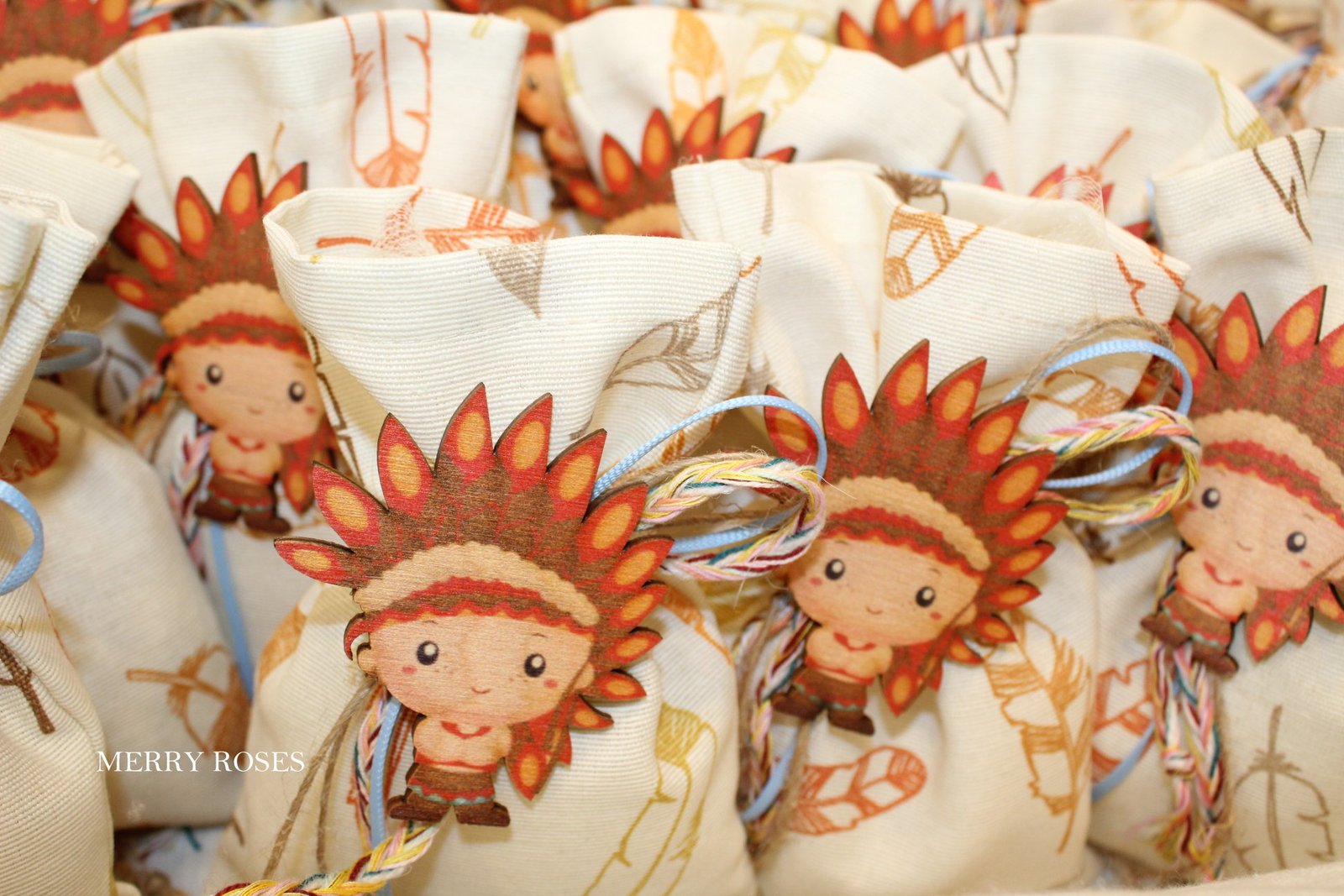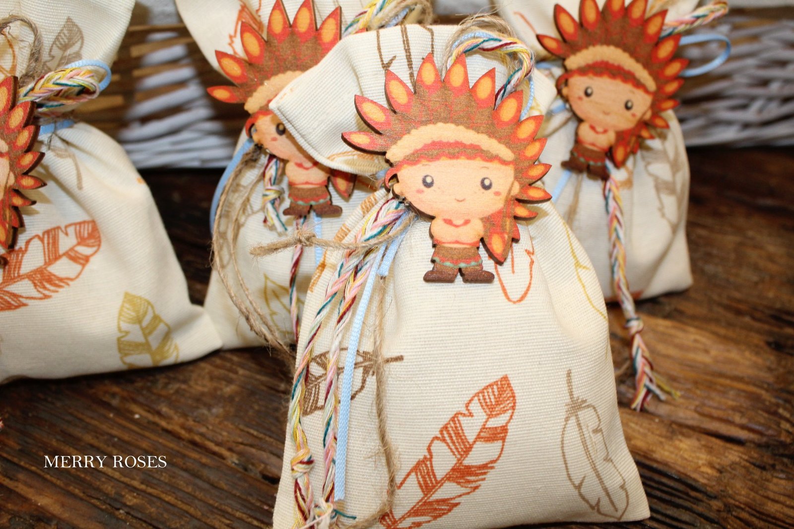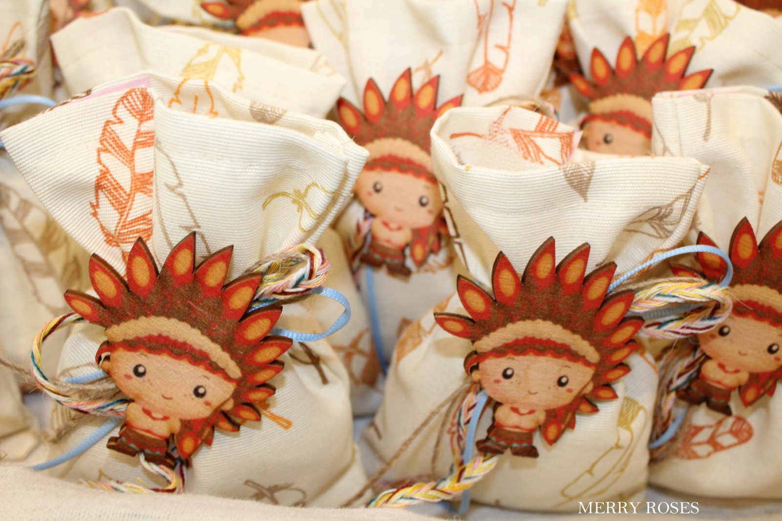 Μπομπονιέρα Βάπτισης πουγκί υφασμάτινο ινδιάνικου στύλ με ξύλινο διακοσμητικό ινδιάνο.