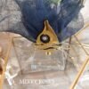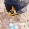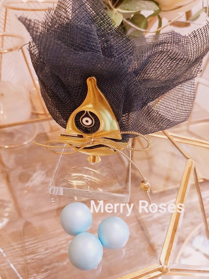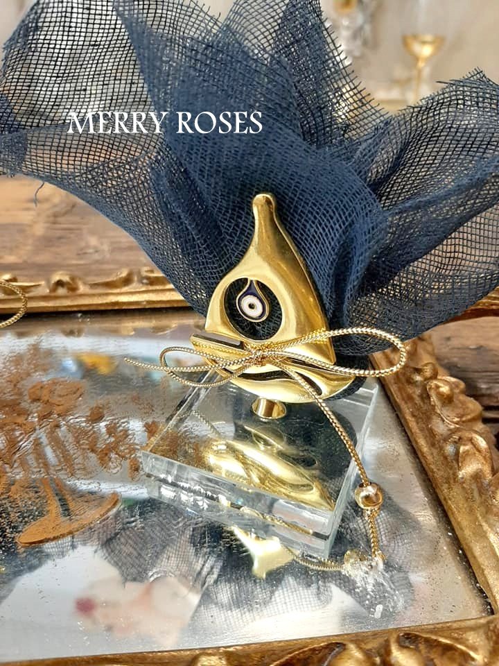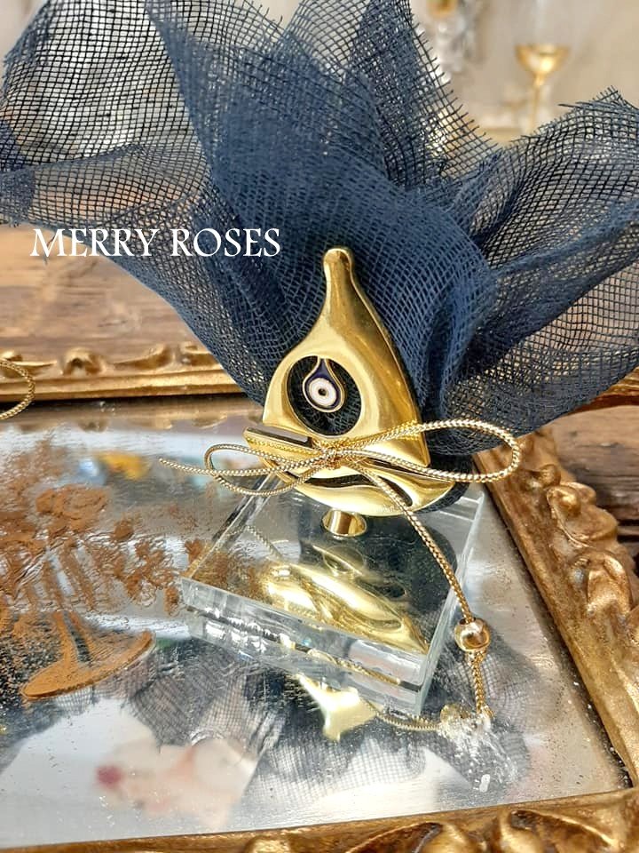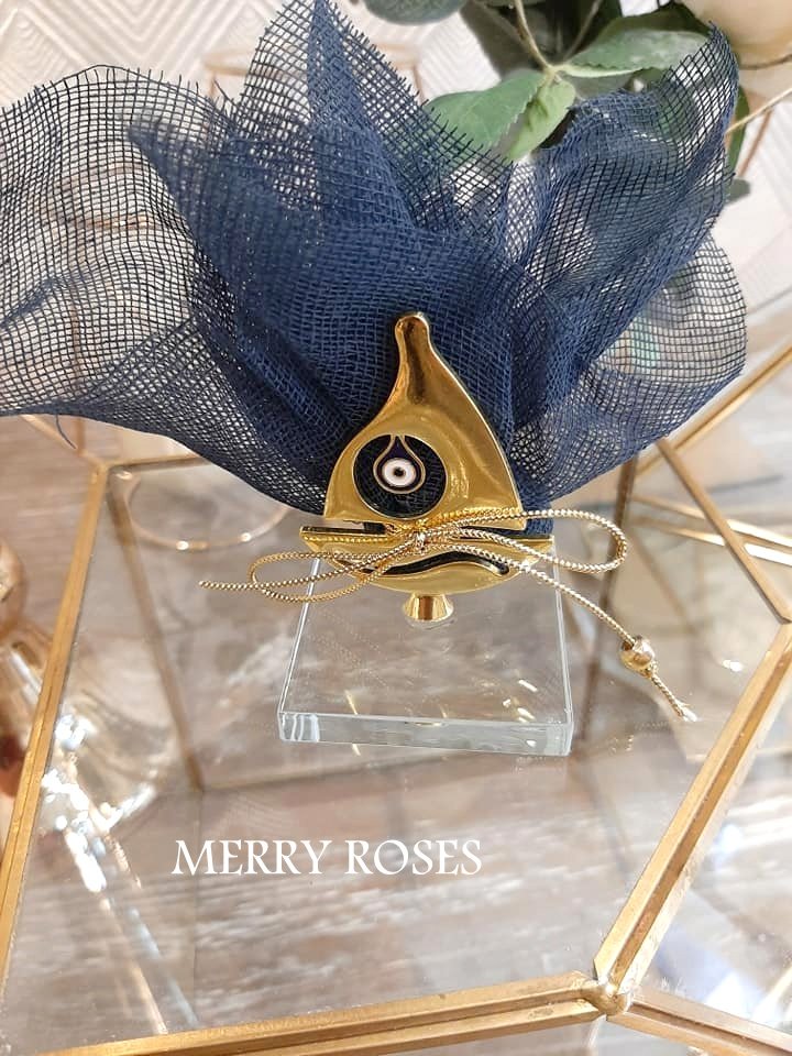 Μπομπονιέρα βάπτισης χρυσό καραβάκι με ματάκι ,πάνω σε γυάλινη βάση δεμένο με γάζα ,γκρό κορδελάκι και χρυσή χάντρα.