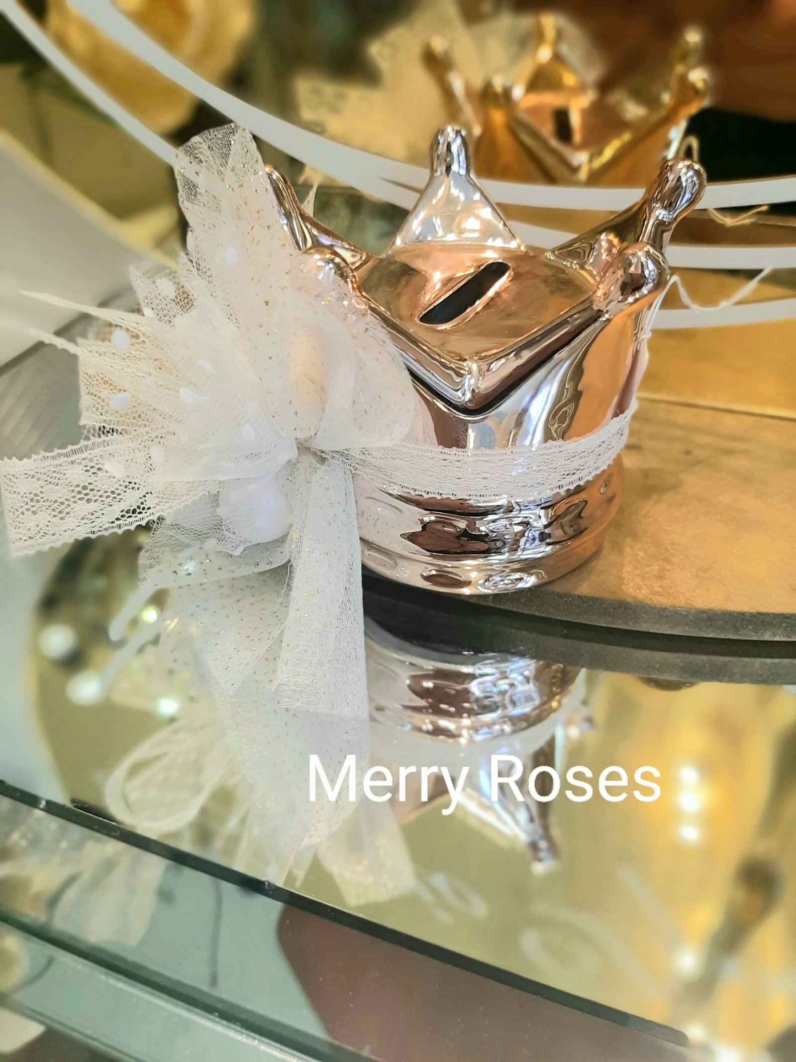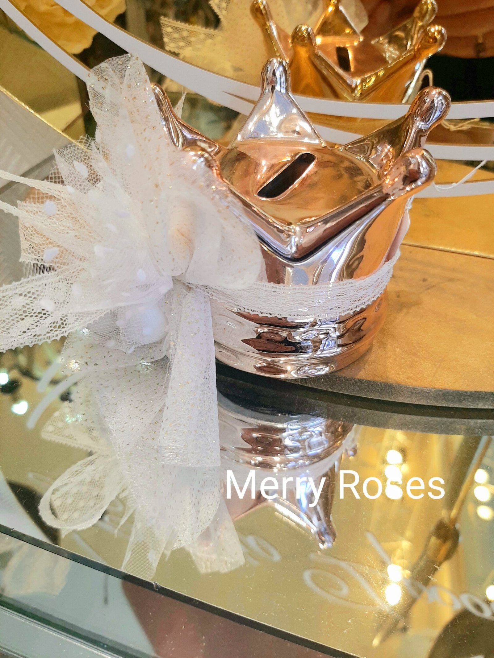 Μπομπονιέρα βάπτισης κορώνα κουμπαράς 8 *8 εκ σε 2 χρώματα ροζ χρυσό και χρυσό.