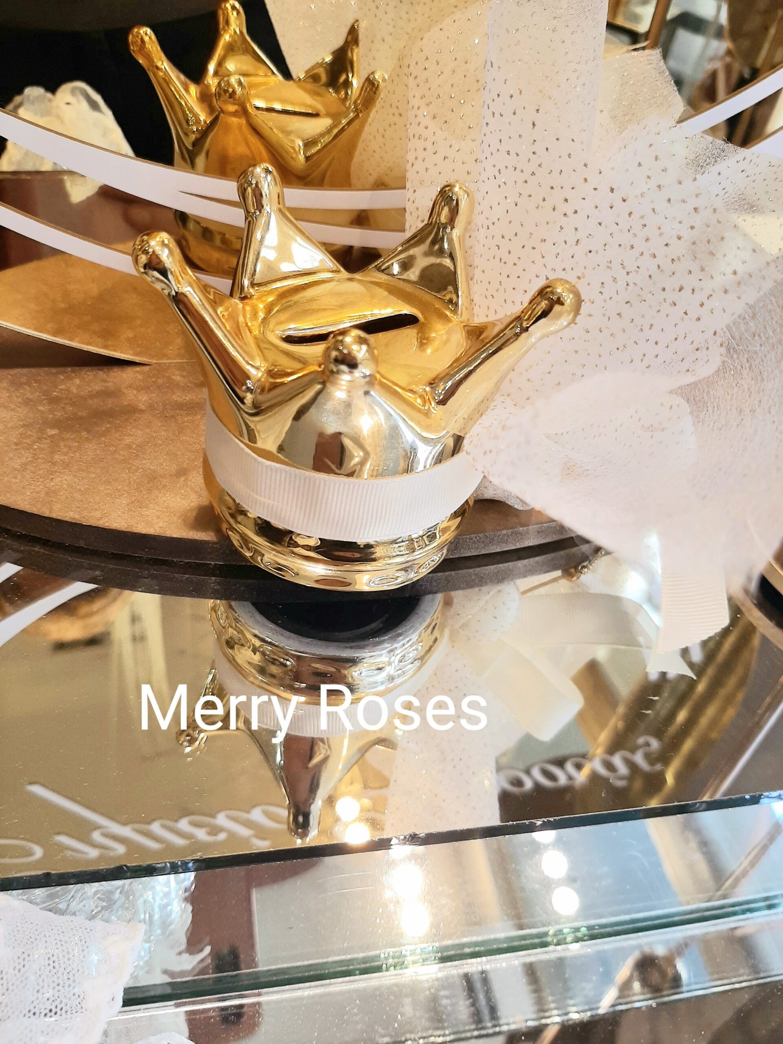 Δεμένη με γκρό ιβουάρ κορδέλα ,χρυσό τούλι γκλίτερ και χρυσό κορδόνι με χρυσές πέτρες.