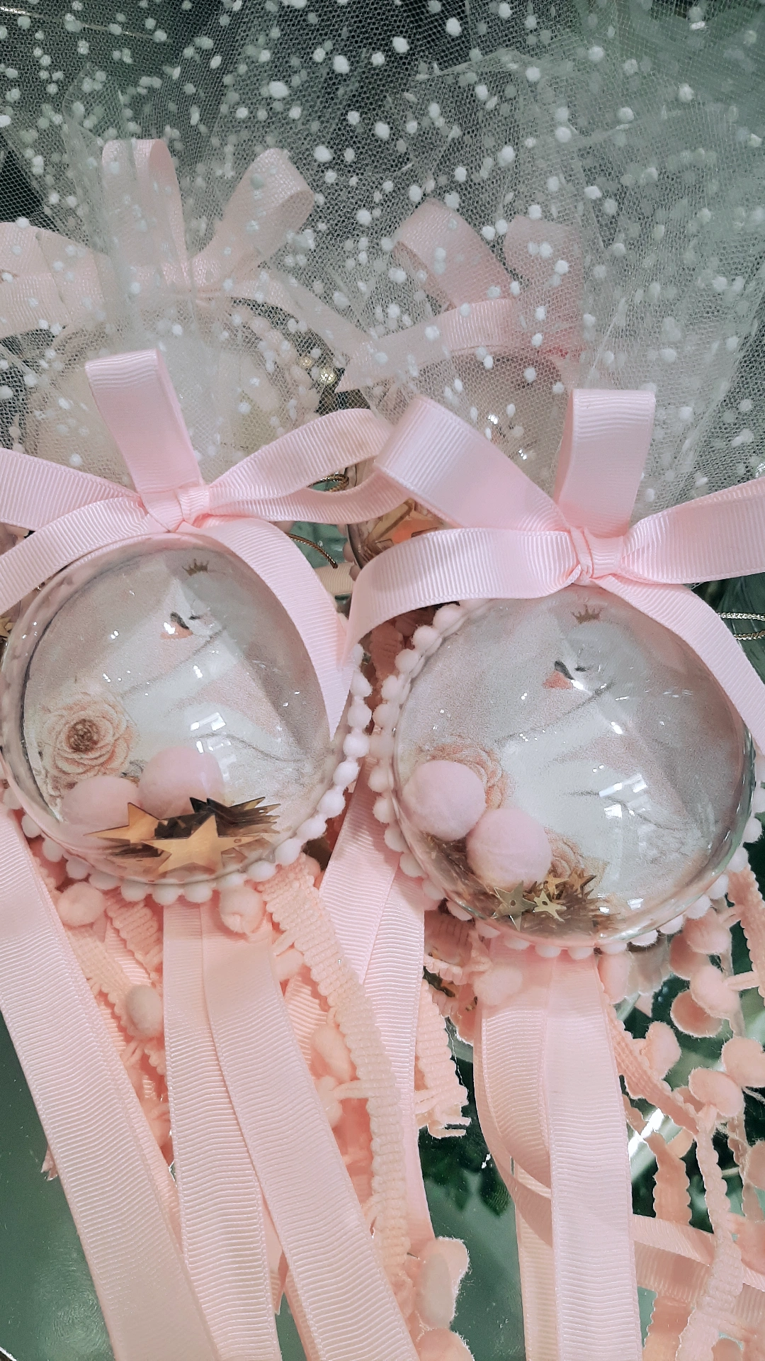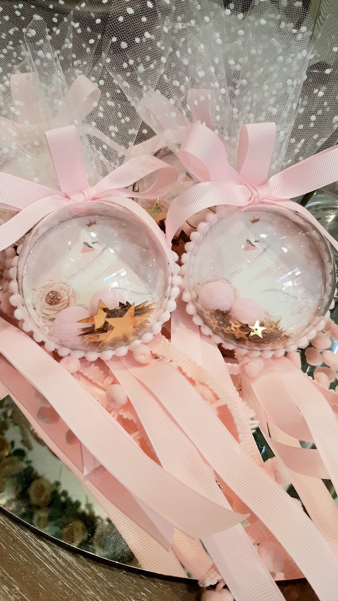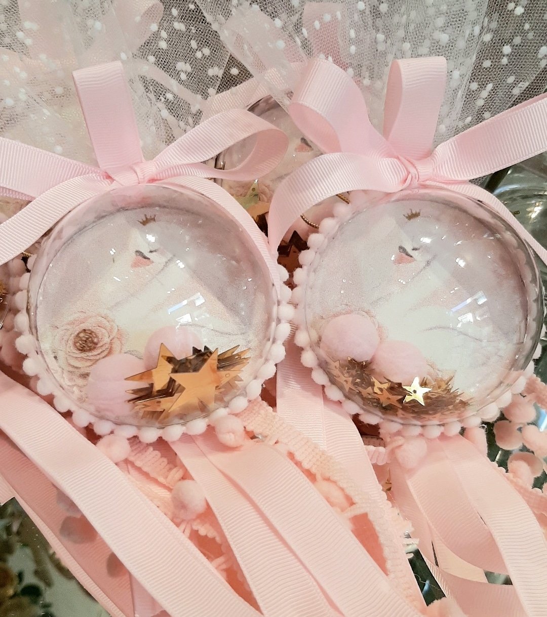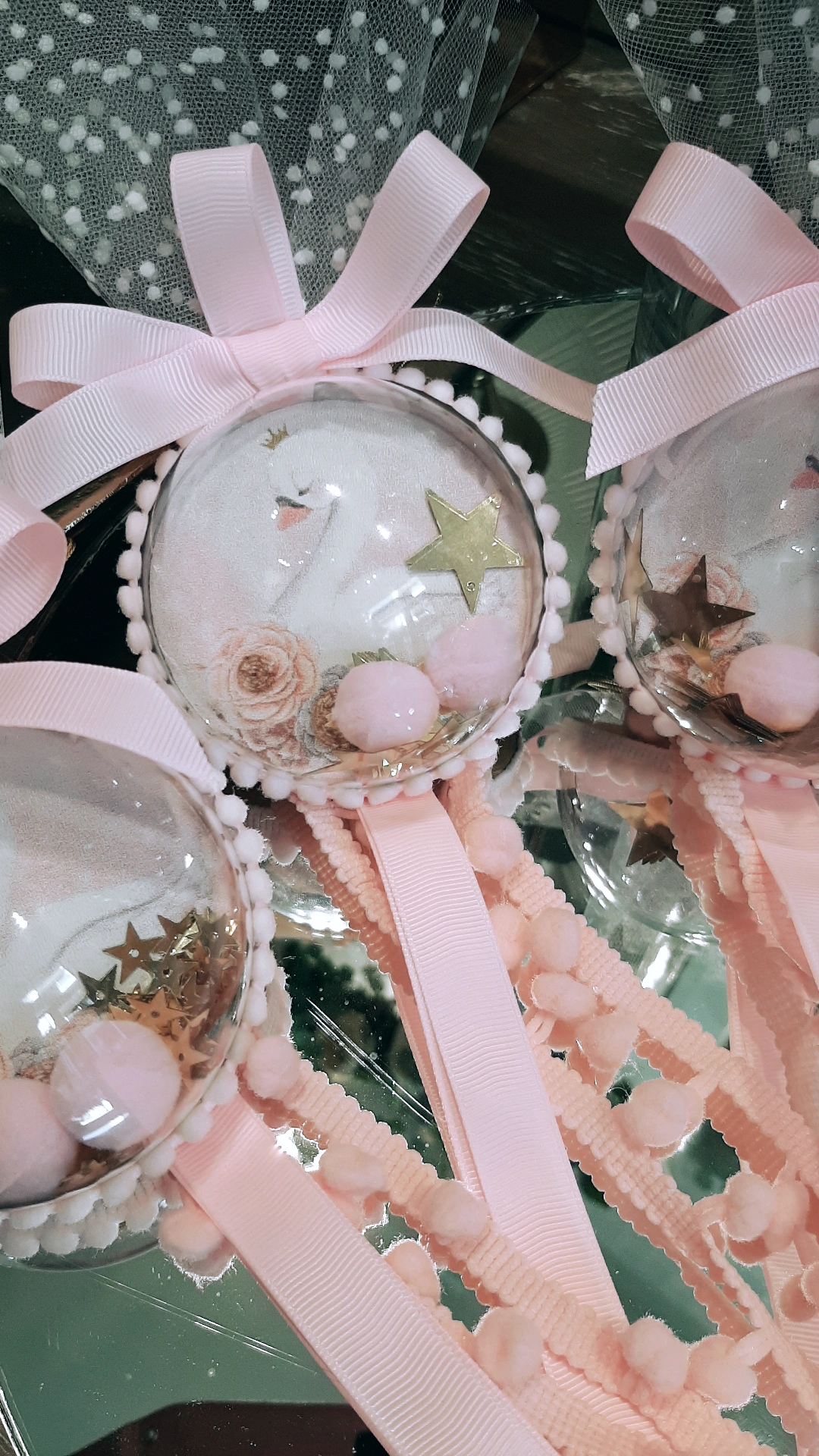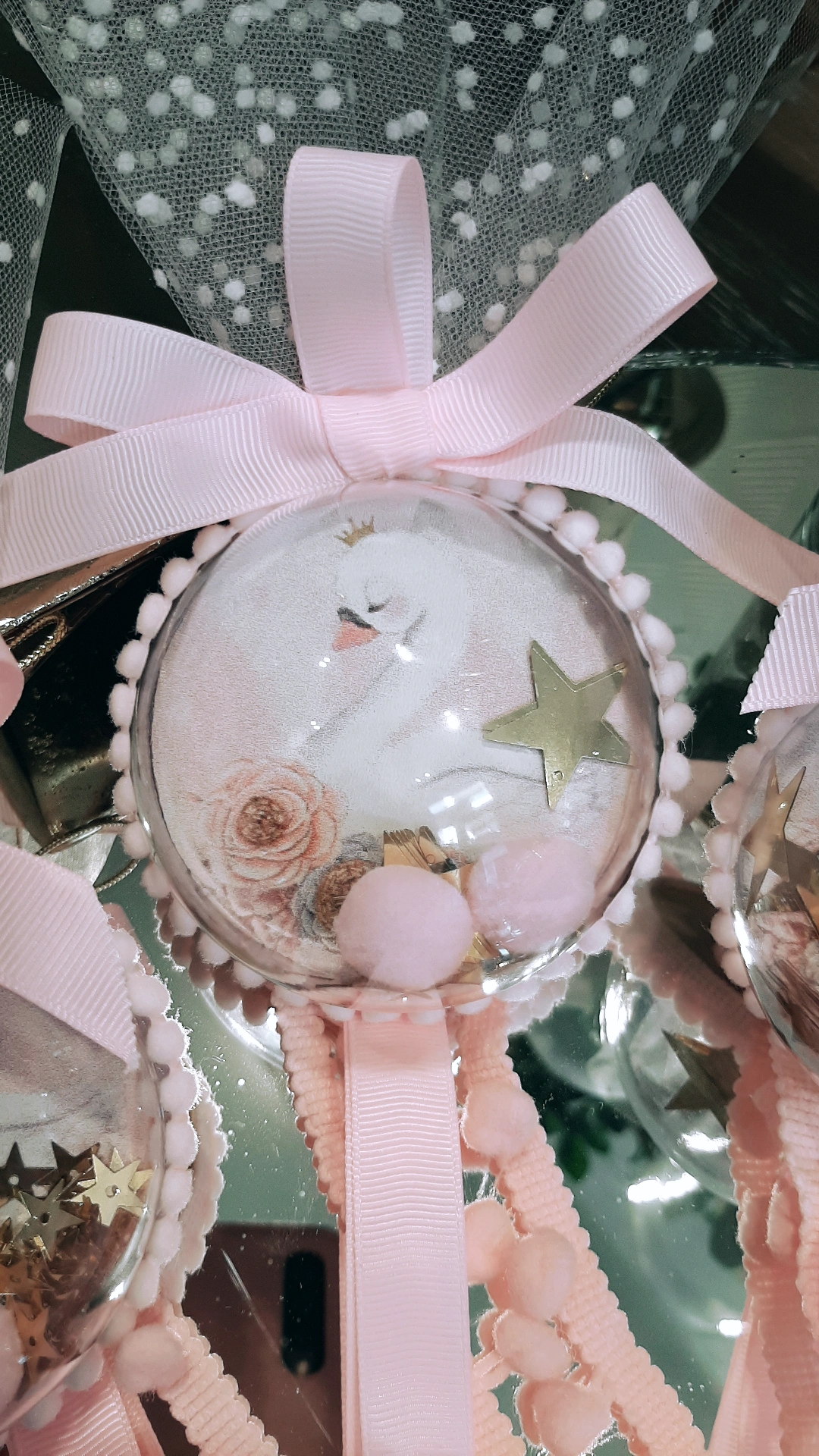 Μπομπονιέρα Κύκνος ,διακοσμητική μπαλίτσα κρεμαστή μαζί με πον -πον και χρυσά αστεράκια.