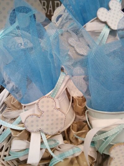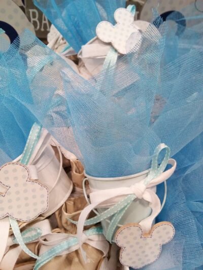 Μπομπονιέρα βάπτισης Μίκυ με μεταλλικό διακοσμητικό κρεμαστό κουβαδάκι με ξύλινη λεπτομέρεια στο μεταλλικό χερούλι.