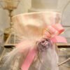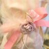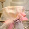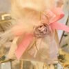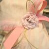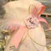 Μπομπονιέρα βάπτισης πουγκί ριγέ 14 *17 εκ με λουλούδι σάπιο μήλο και πούπουλο.