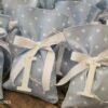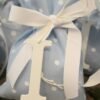 Μπομπονιέρα πουγκί σιελ με πουα και ξύλινο λευκό μονόγραμμα