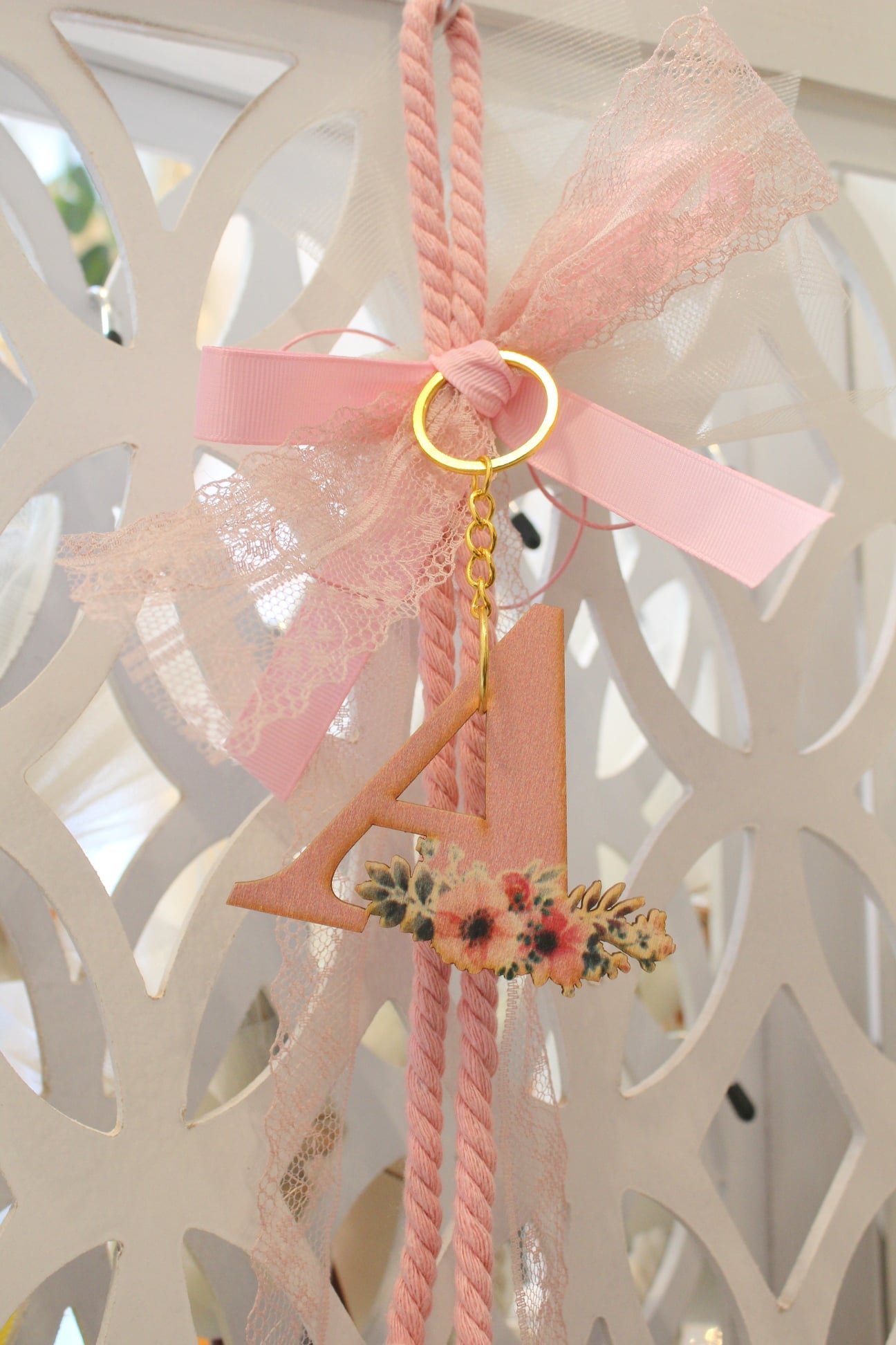 Διακοσμητική κρεμαστή μπομπονιέρα με ξύλινο μονόγραμμα με λουλούδια