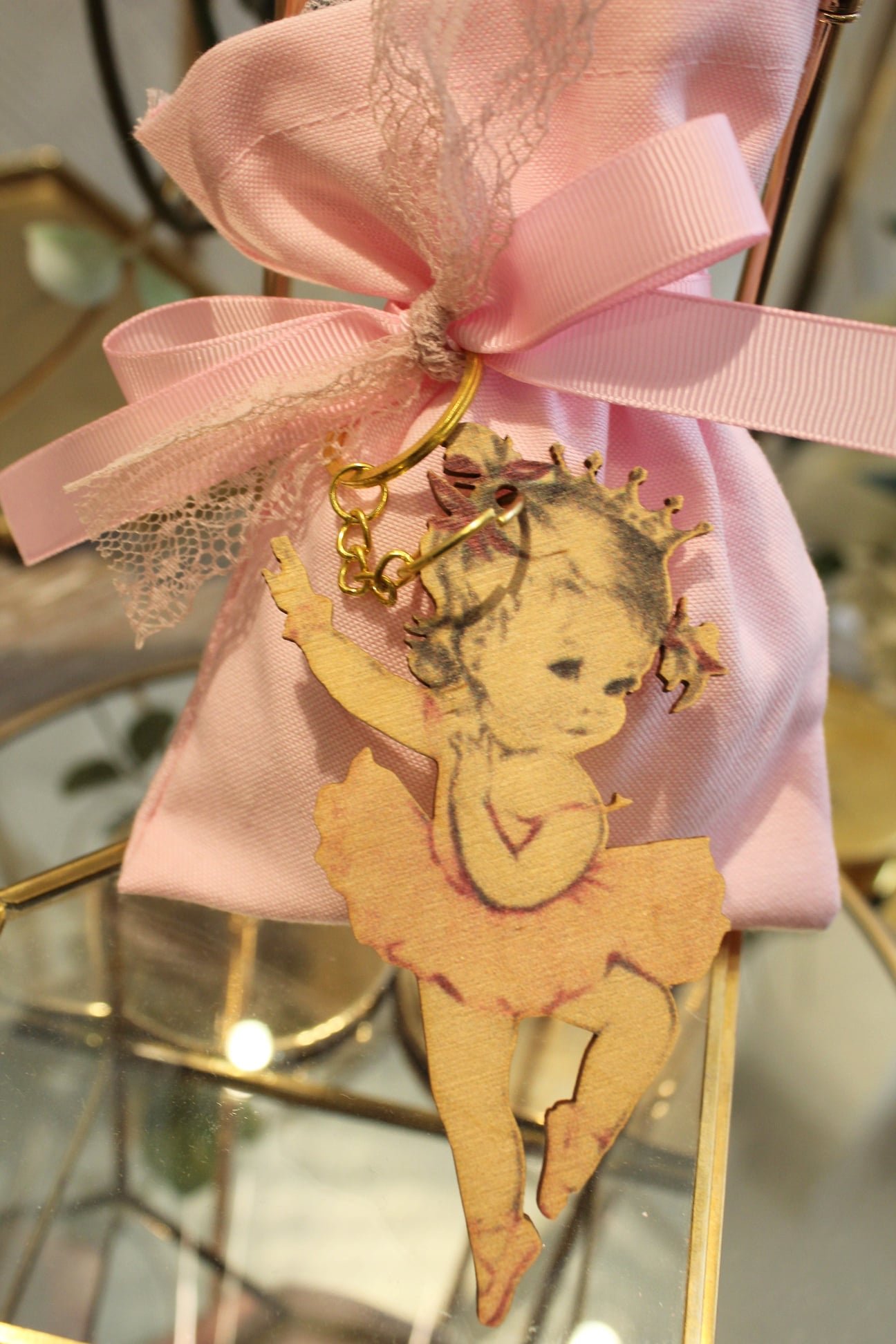 Μπομπονιέρα βάπτισης μπαλαρίνα μπρελόκ σε ρόζ πουγκί 12*17