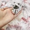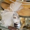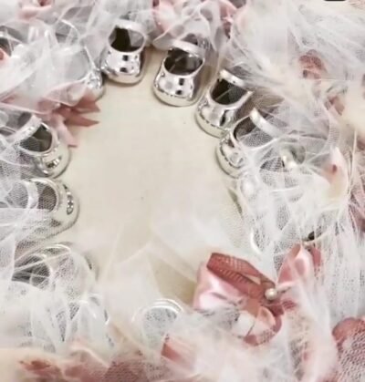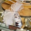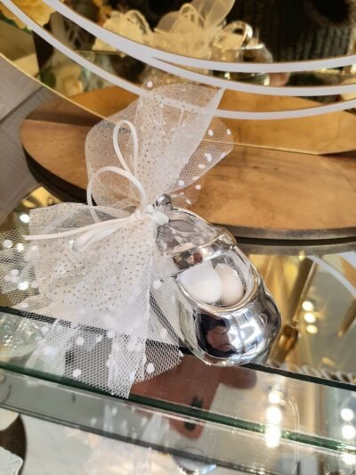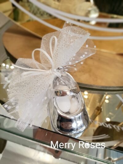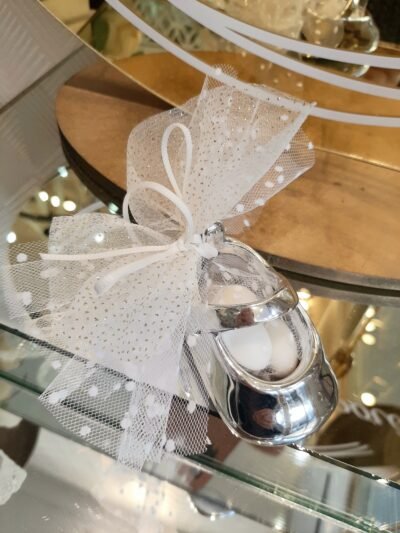 Μπομπονιέρα βάπτισης παπουτσάκι ασημένιο πορσελάνης με πουα φιόγκο και τούλι γκλιτερ.