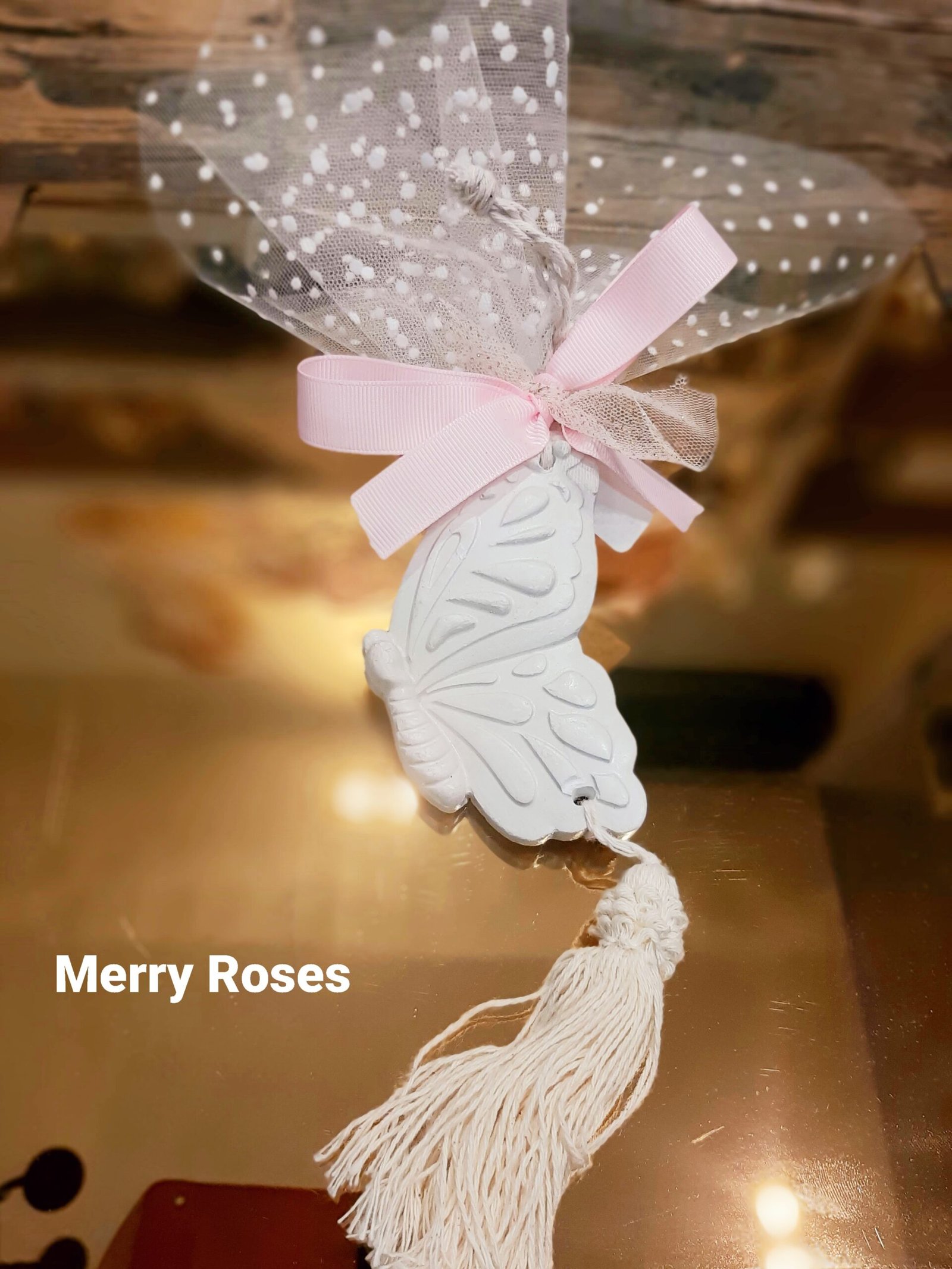 Μπομπονιέρα βάπτισης διακοσμητική γύψινη πεταλούδα 10×5εκ κρεμαστή μαζί με φούντα ,συνολικο υψος 27 εκ.