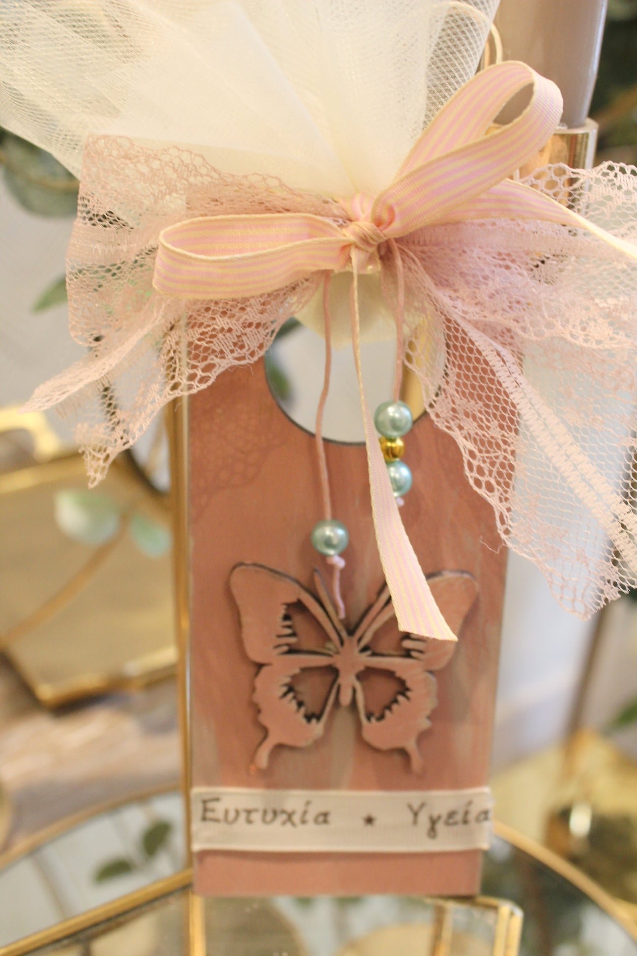 Μπομπονιέρα Βάπτισης Πεταλούδα,ξύλινο διακοσμητικό πόρτας με πέρλες και κορδέλες