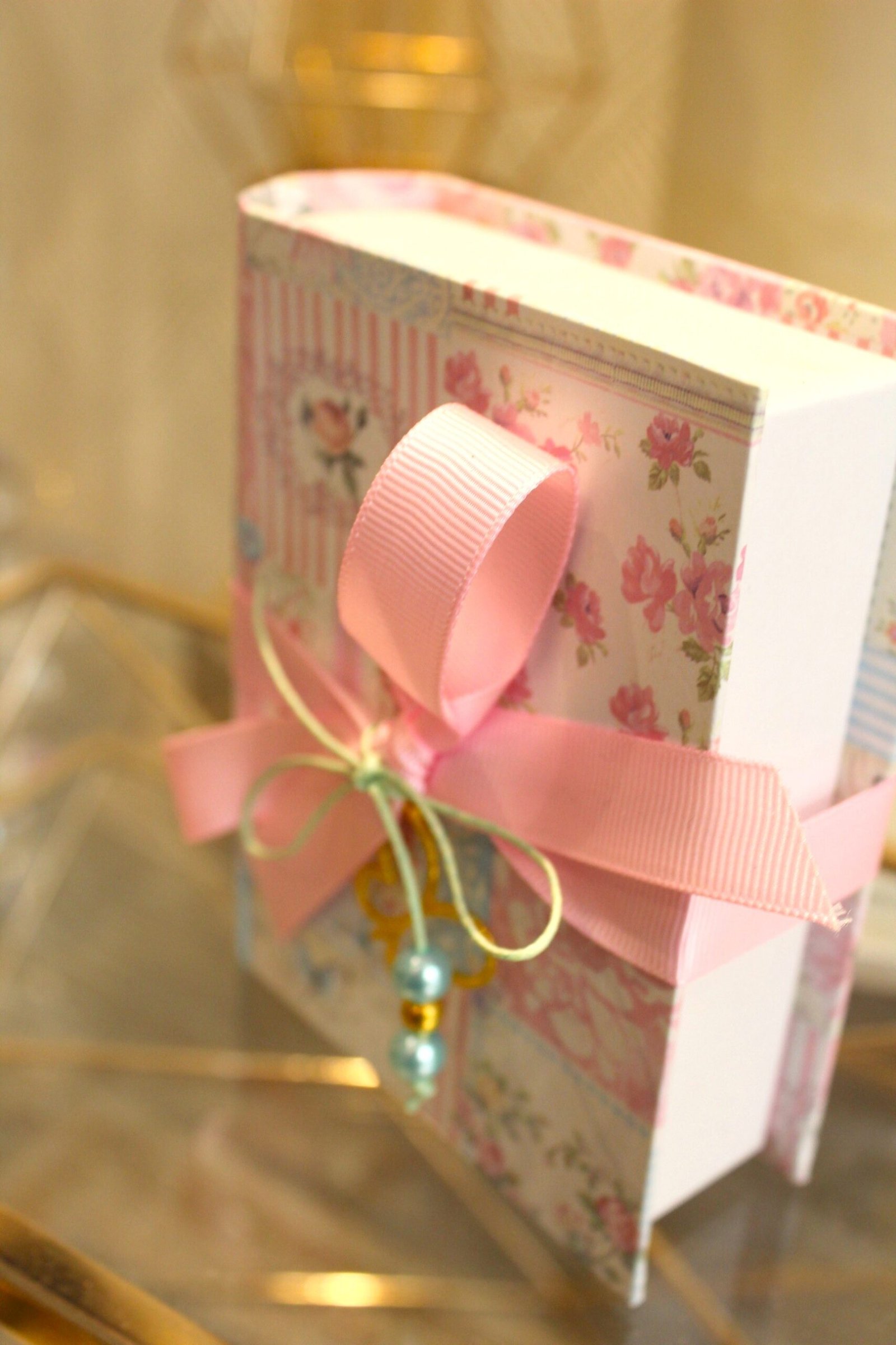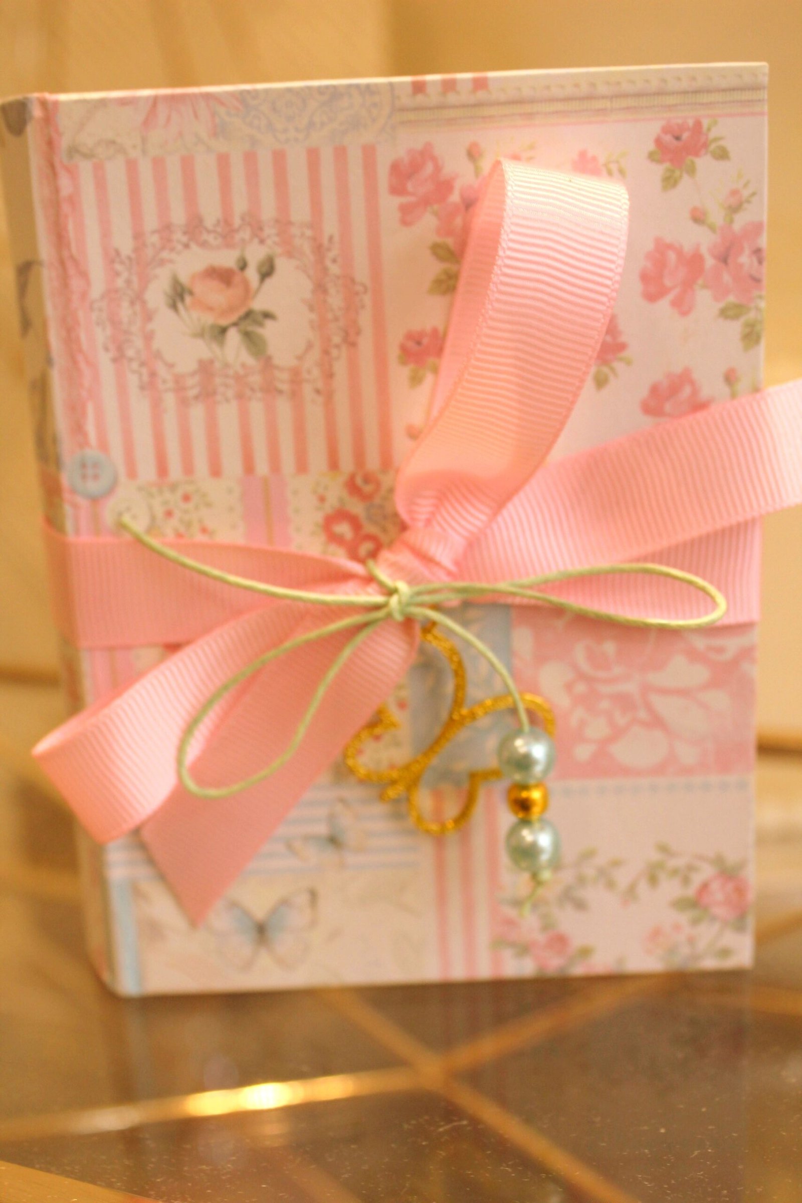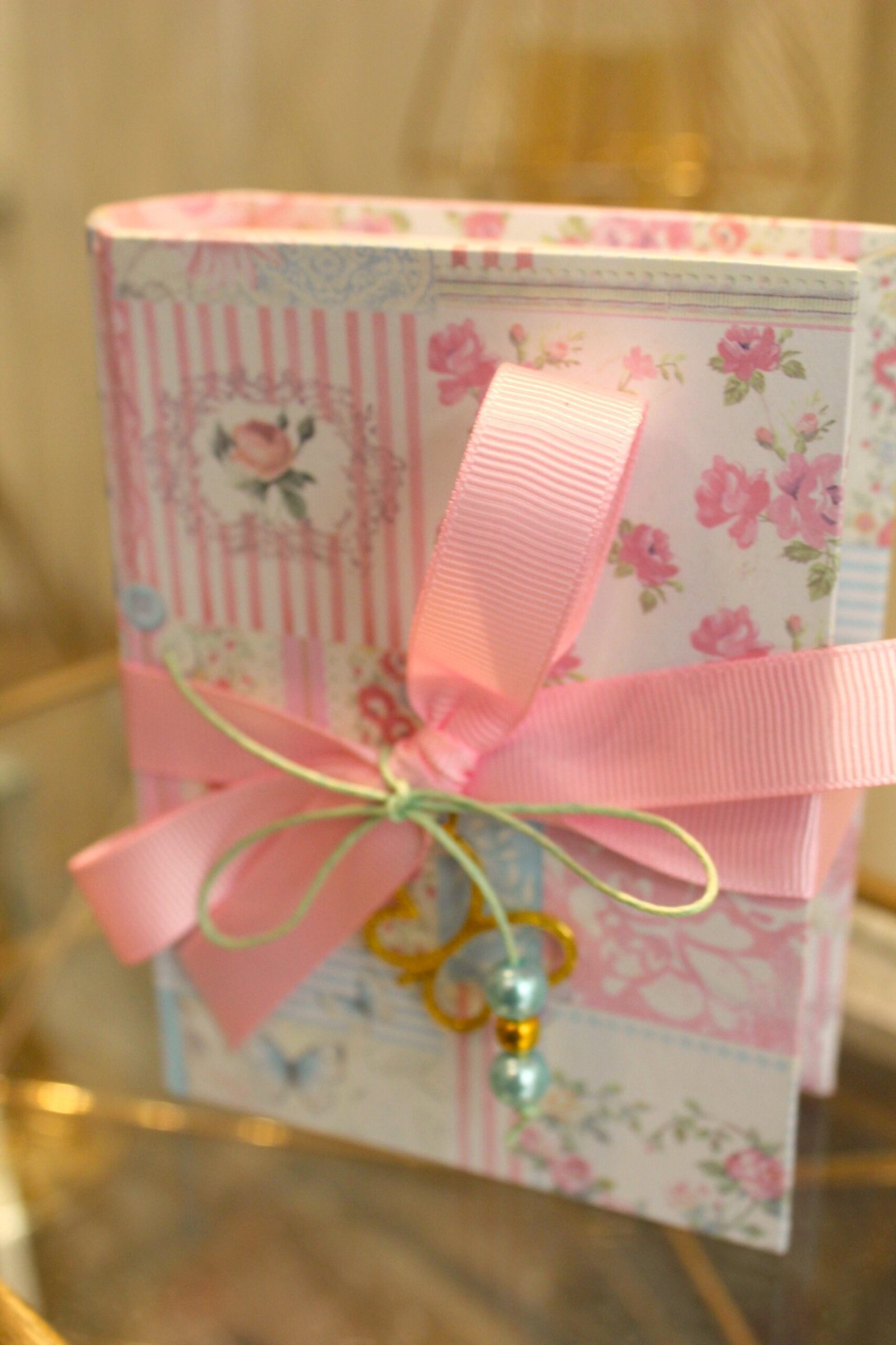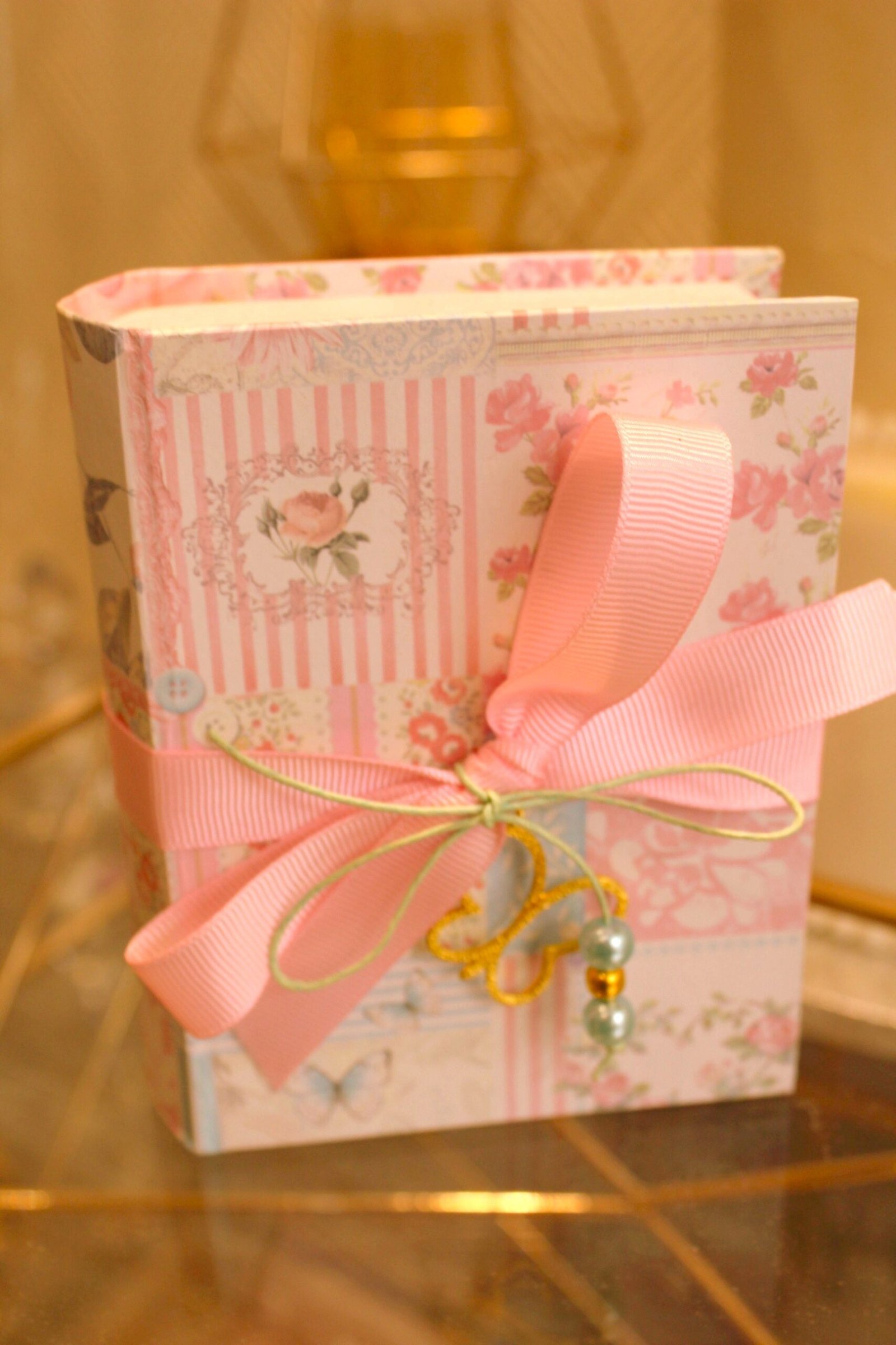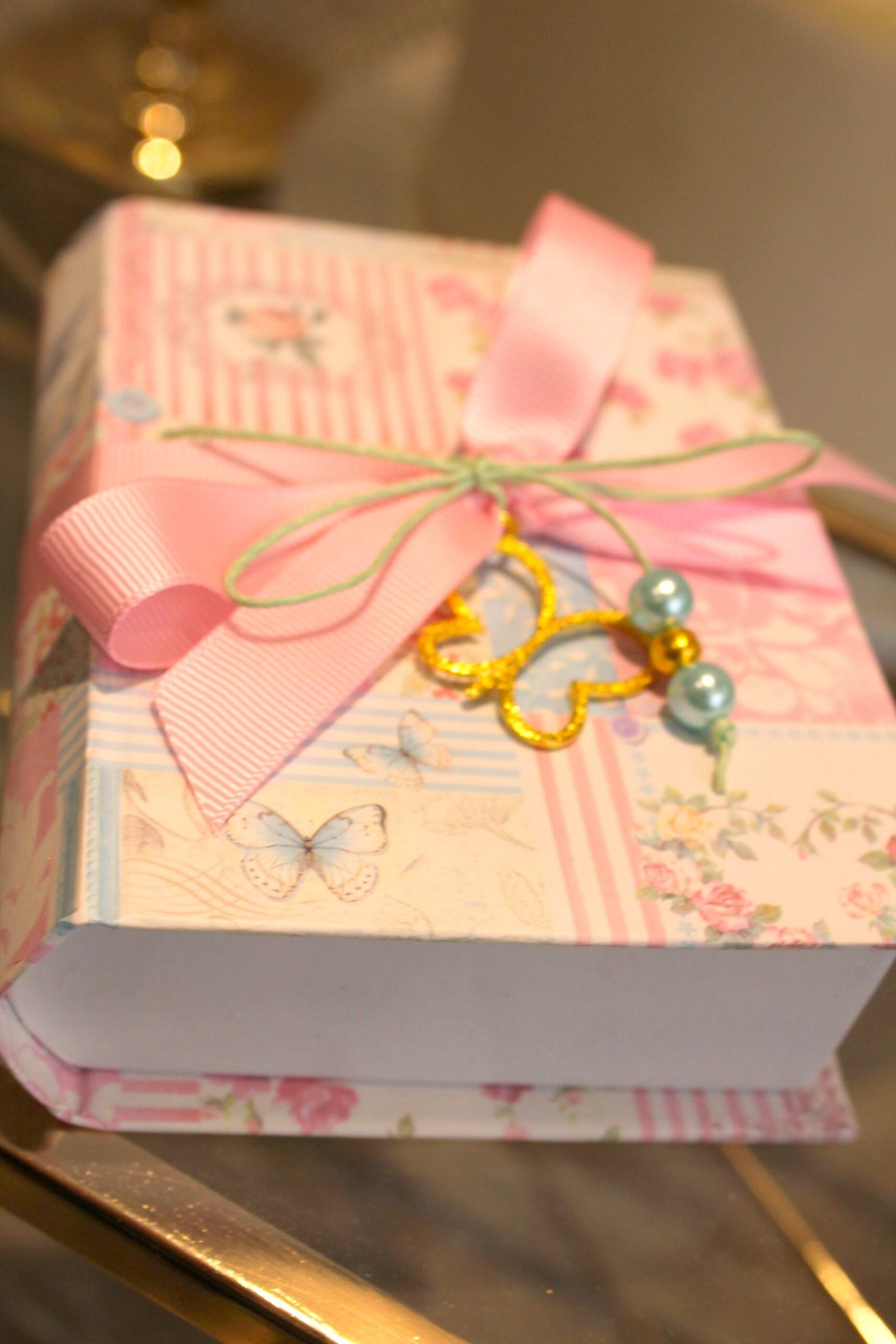 Μπομπονιέρα βάπτισης χρυσή πεταλούδα κόσμημα σε  κουτί κασετίνα floral δεμένο με κορδέλες και πέρλες