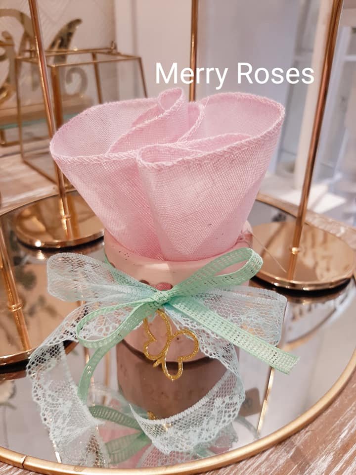Μπομπονιέρα βάπτισης ,διακοσμητικό ροζ βαζάκι πέτρινο με ευχές 6*7εκ, κατάλληλα για ρεσό ,δεμένο με φίογκο δαντέλας και χρυσή πεταλούδα ,