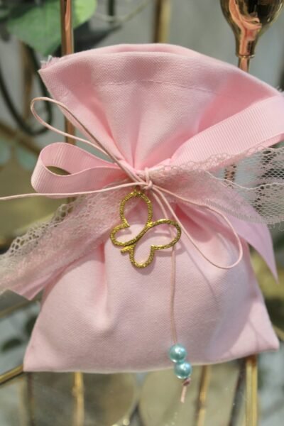 Ρόζ βαμβακερό πουγκί με κορδέλες ,πέρλες και χρυσή διακοσμητική πεταλούδα