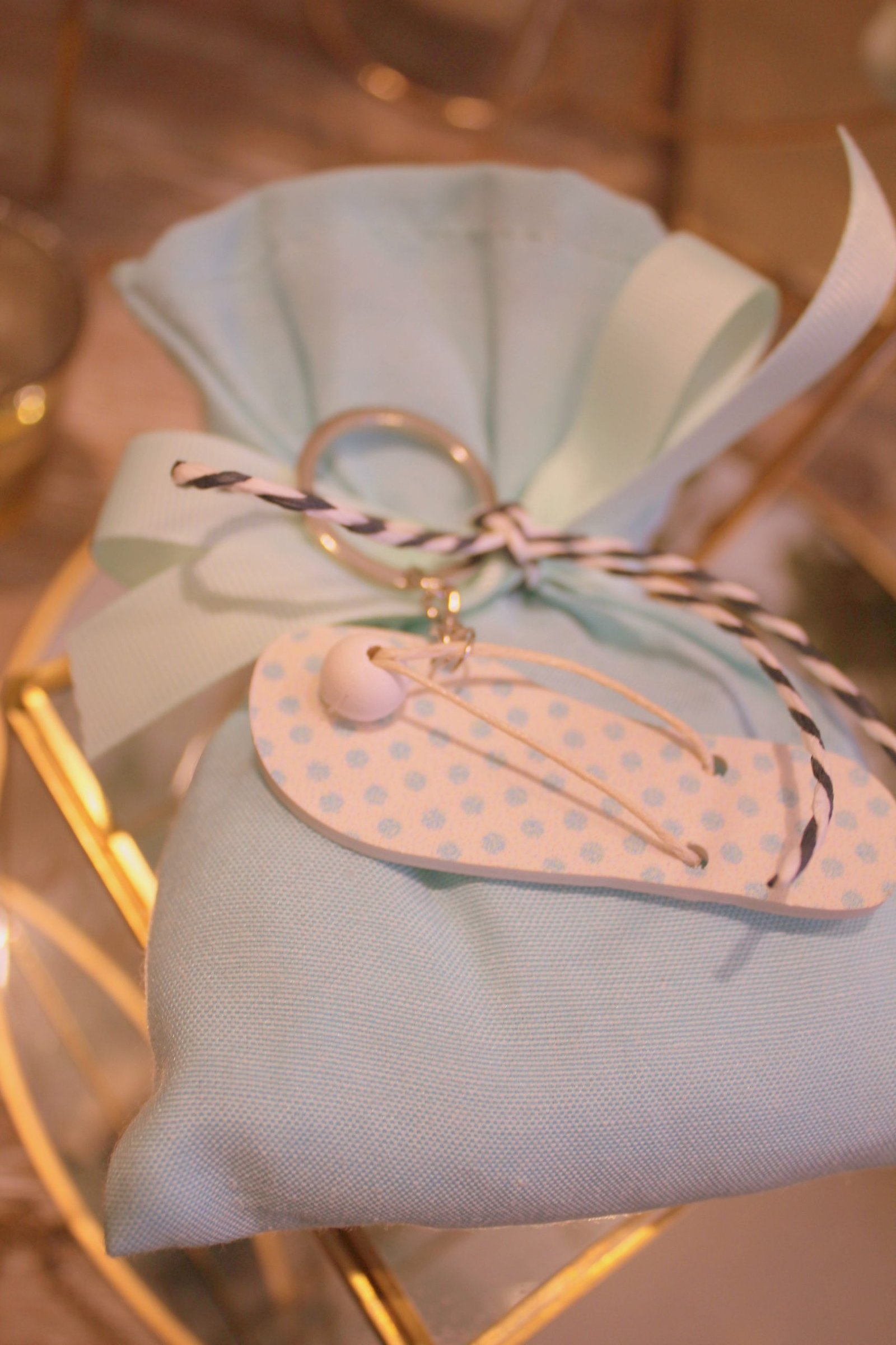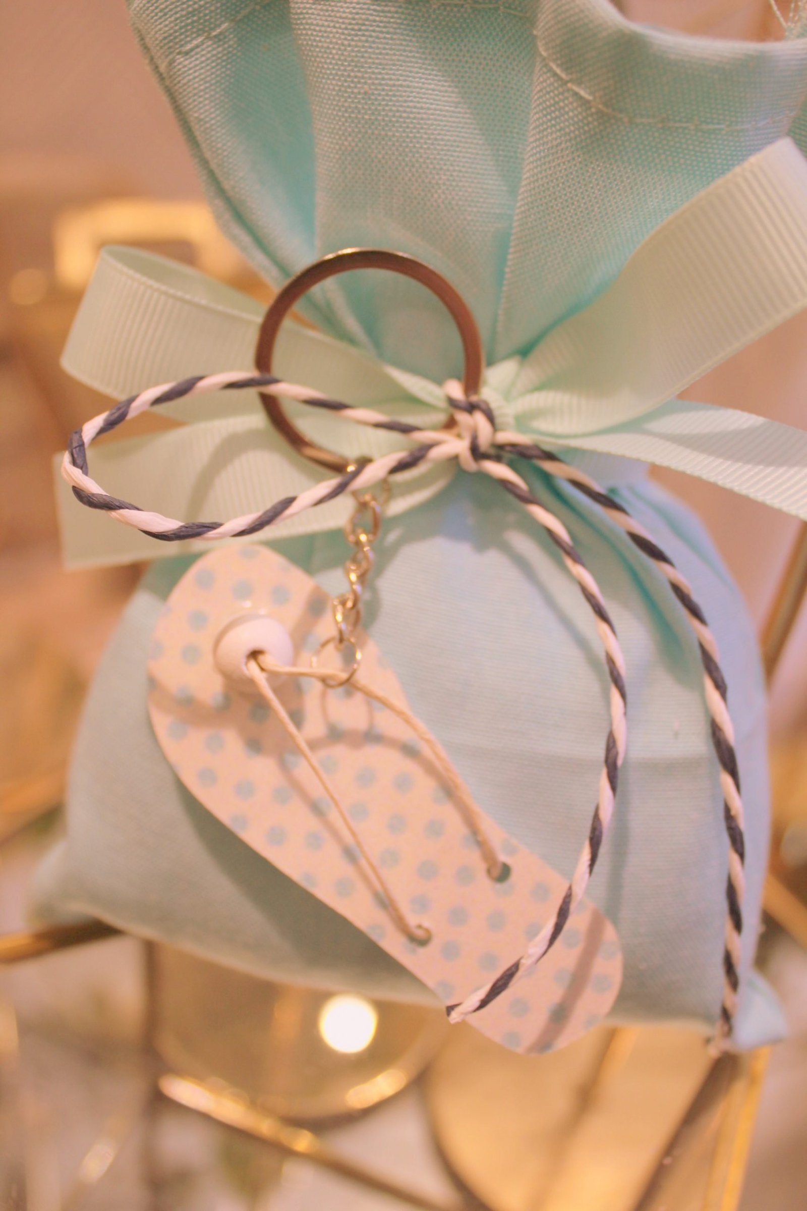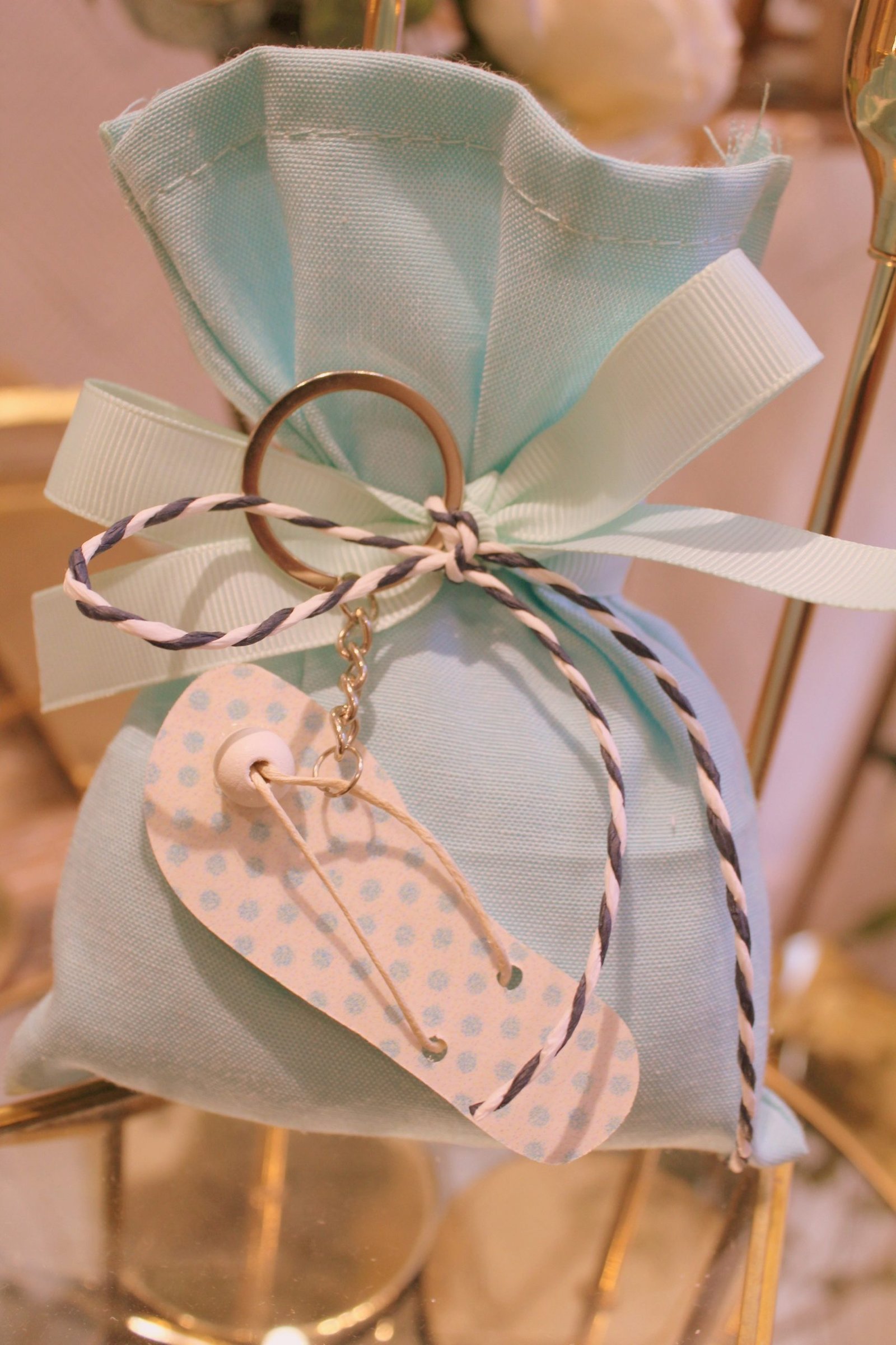 Μπομπονιέρα Βάπτισης σε καλοκαιρινό στύλ ,με πουγκάκι στο χρώμα της μέντας και διακοσμητικό μπρελόκ σαγιονάρα[πουά κίτρινο,πουά βεραμάν].