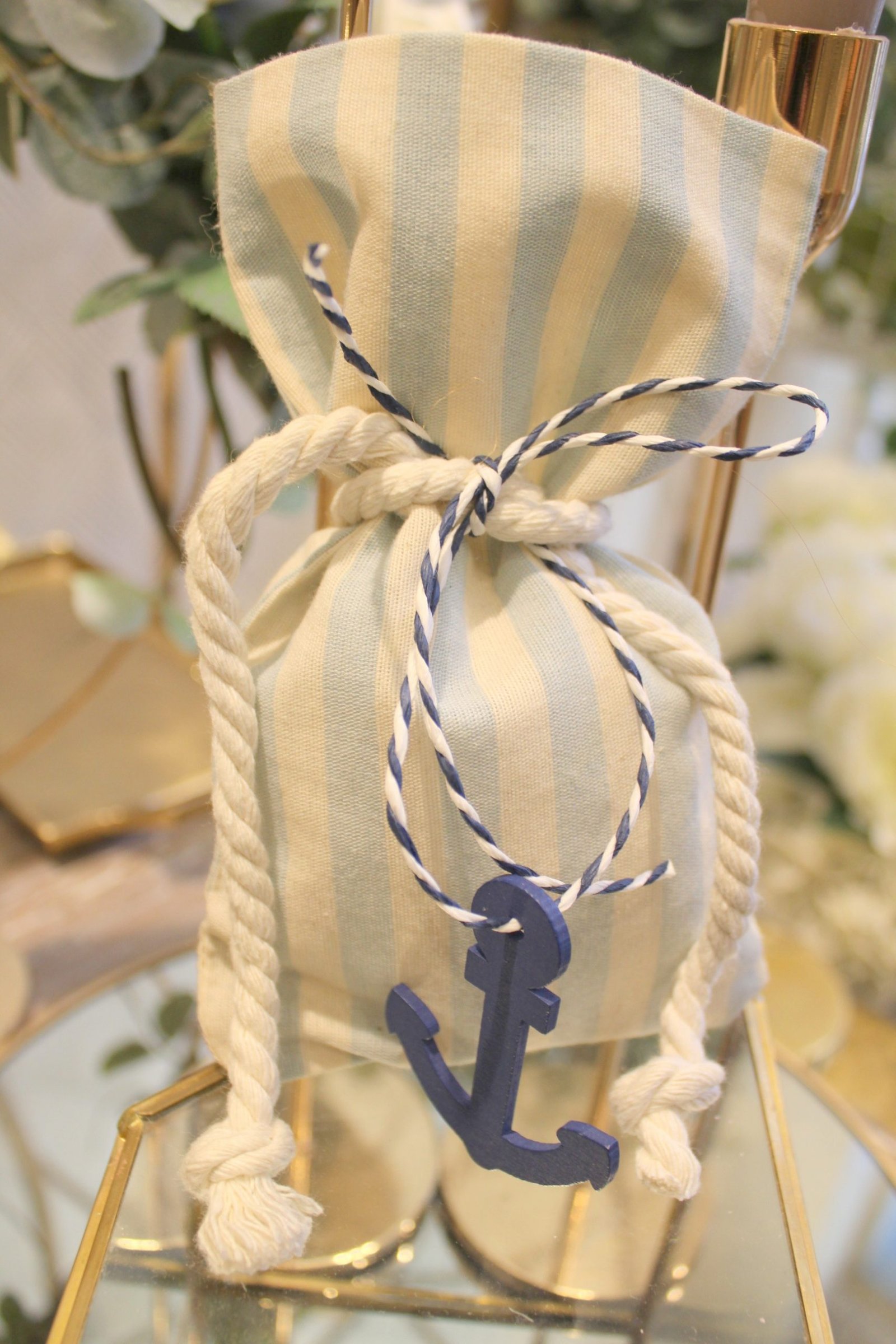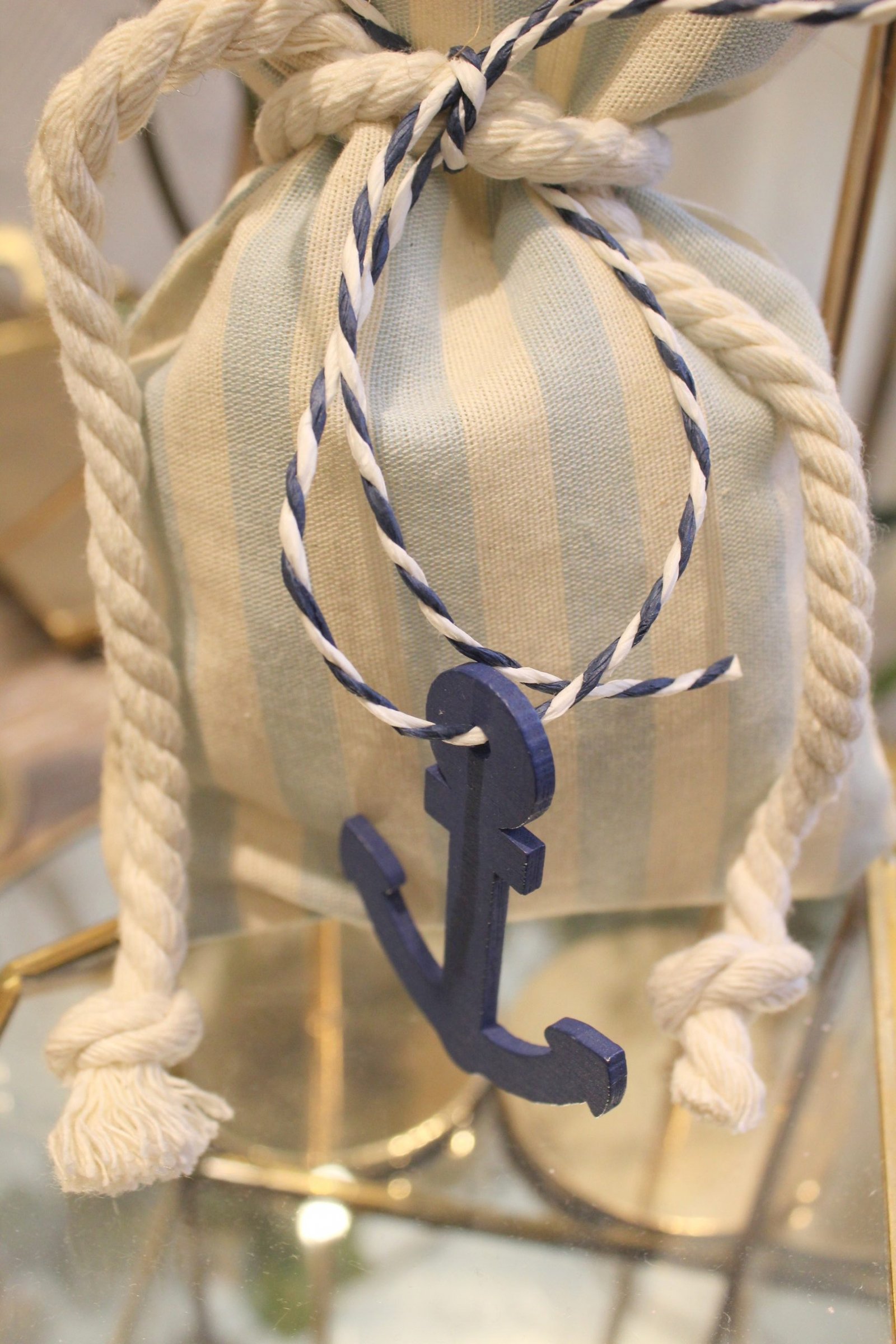Πουγκί λινό ριγέ σιέλ δεμένη με 2 κορδόνια και ξύλινη μπλέ άγκυρα.