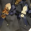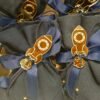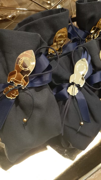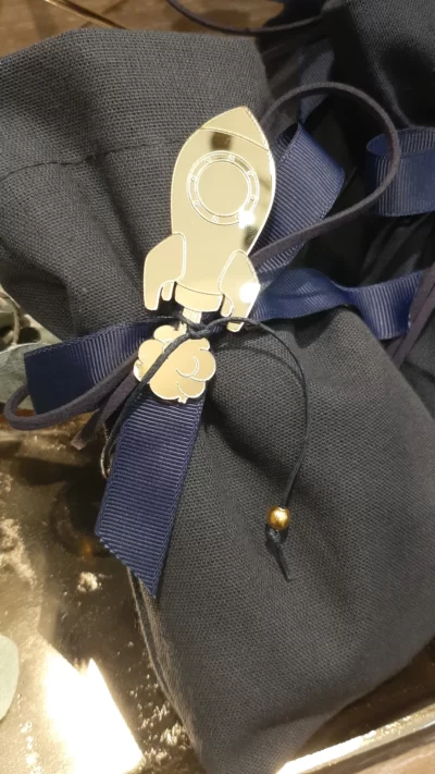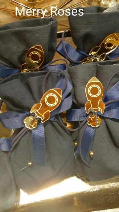 Μπομπονιέρα Βάπτισης ,πουγκί navy blue με χρυσό πλέξιγκλας πύραυλος