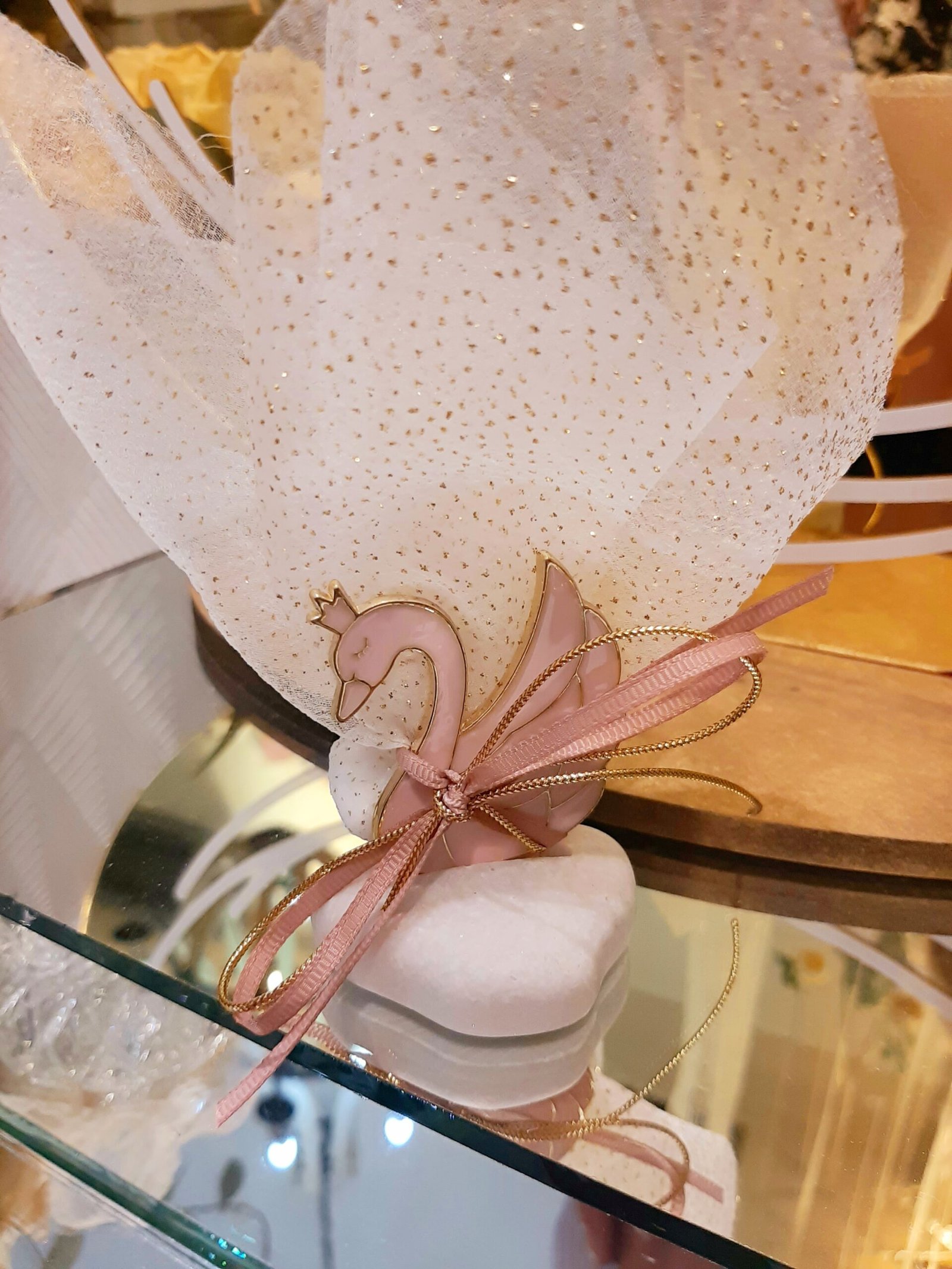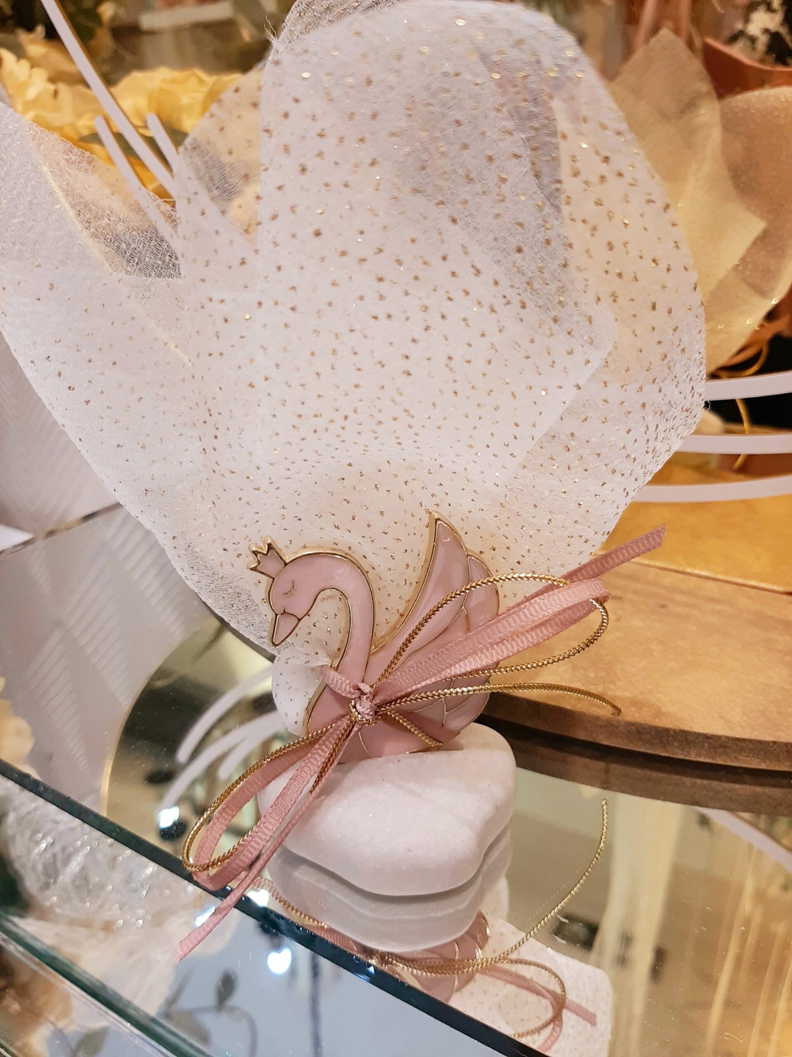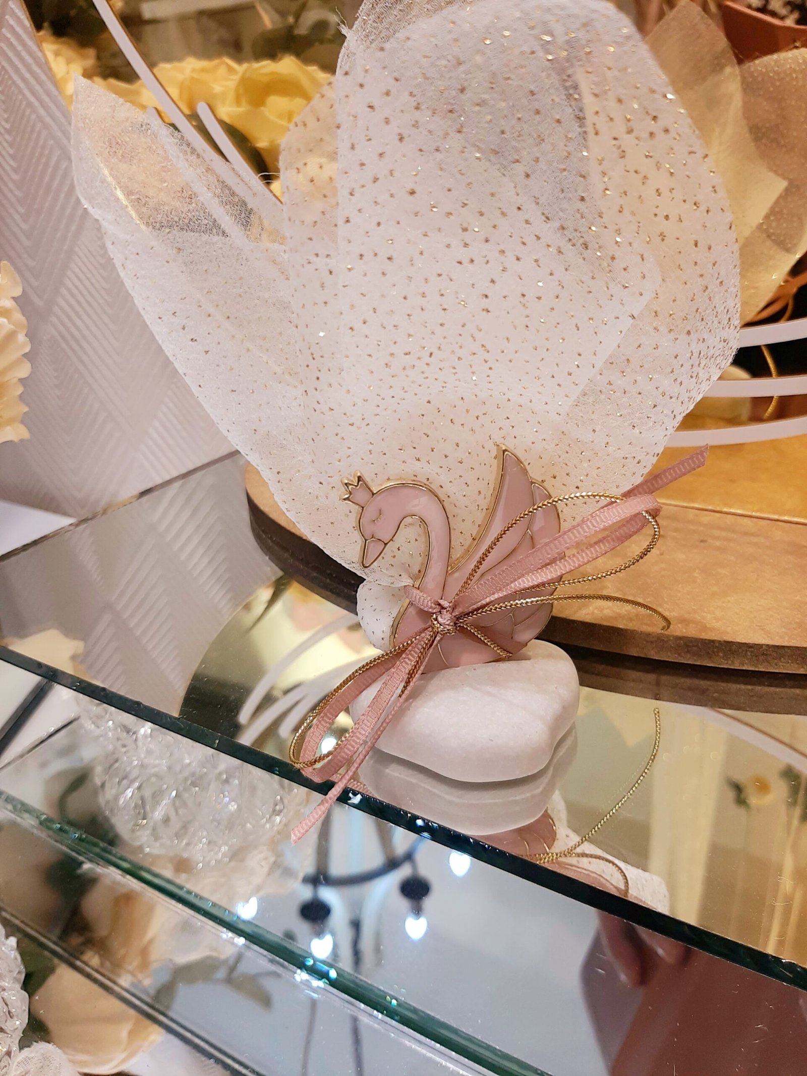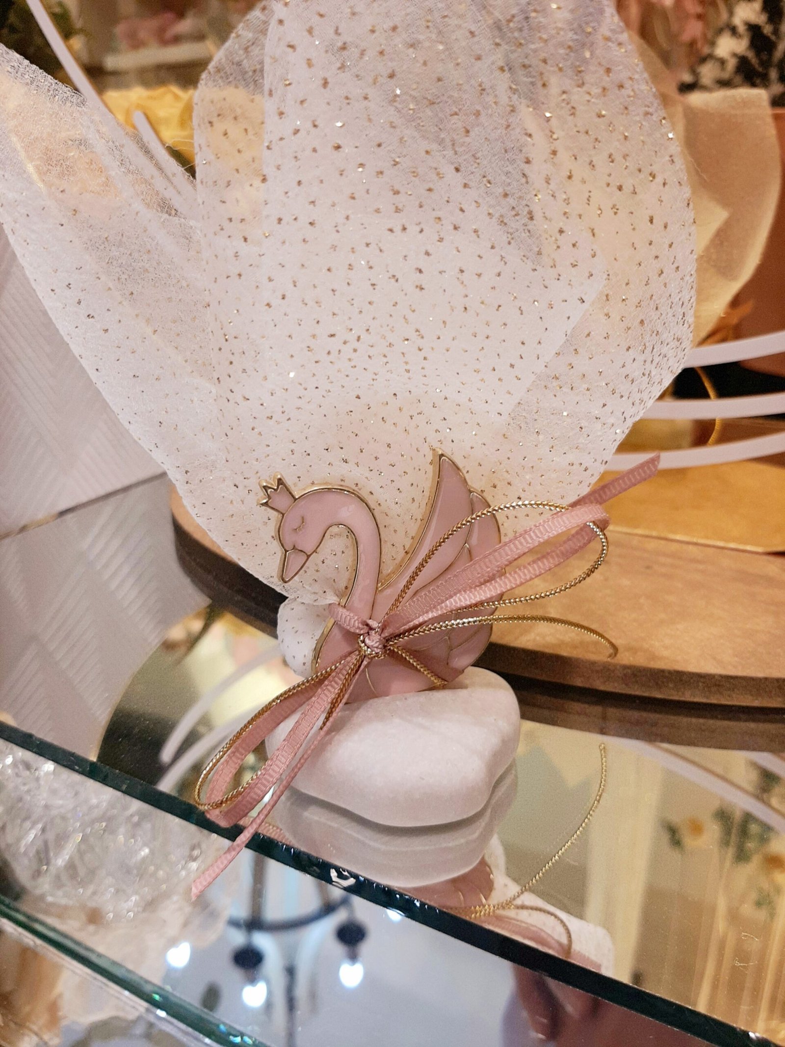 Μπομπονιέρα βάπτισης με ροζ κύκνο σε πέτρινη βάση.