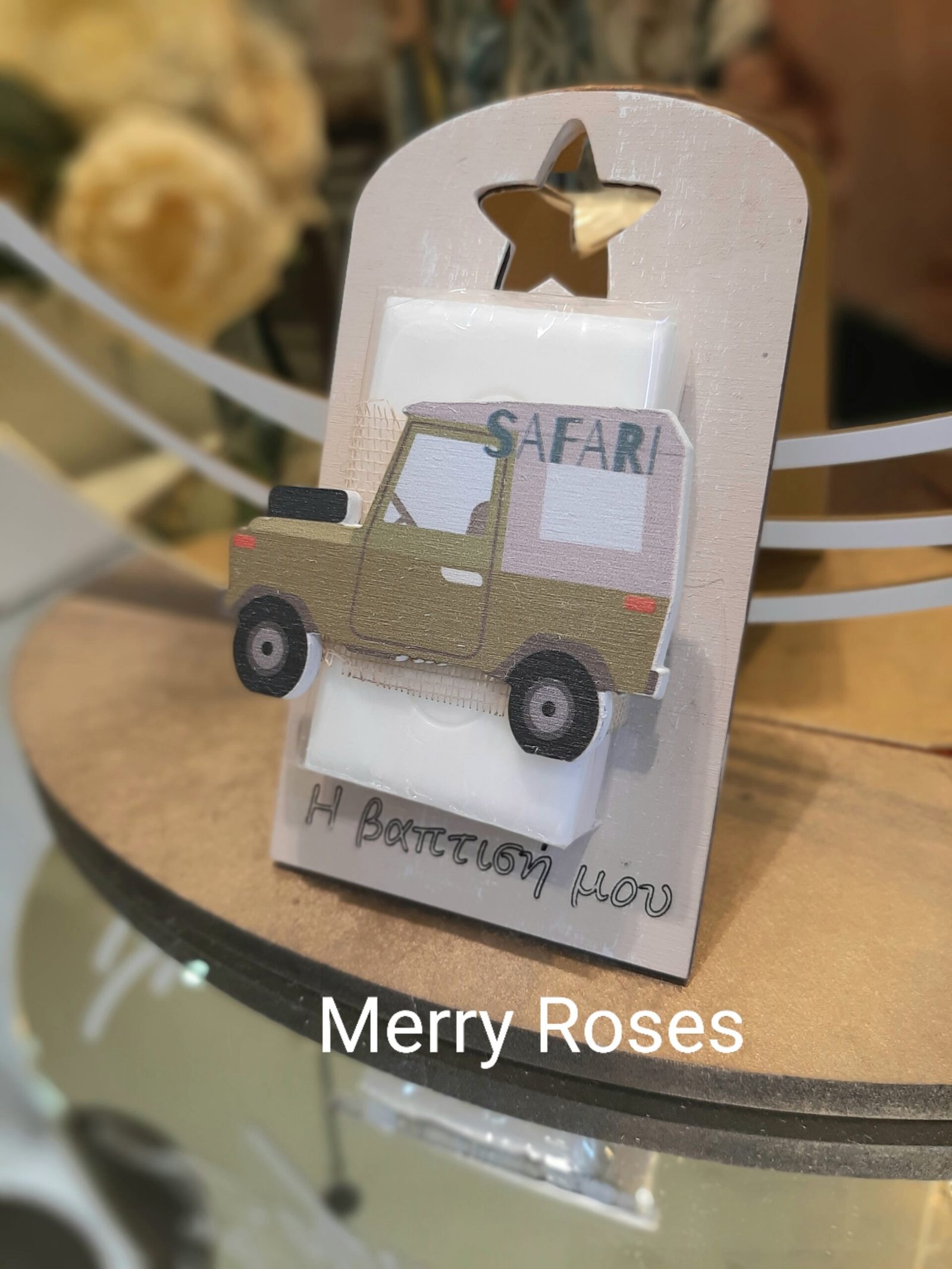 - Μπομπονιέρα βάπτισης για αγόρι σαπουνάκι φυσικό σε ξύλινο καδράκι που γράφει η βάπτιση μου θέμα βάπτισης σαφάρι