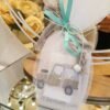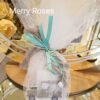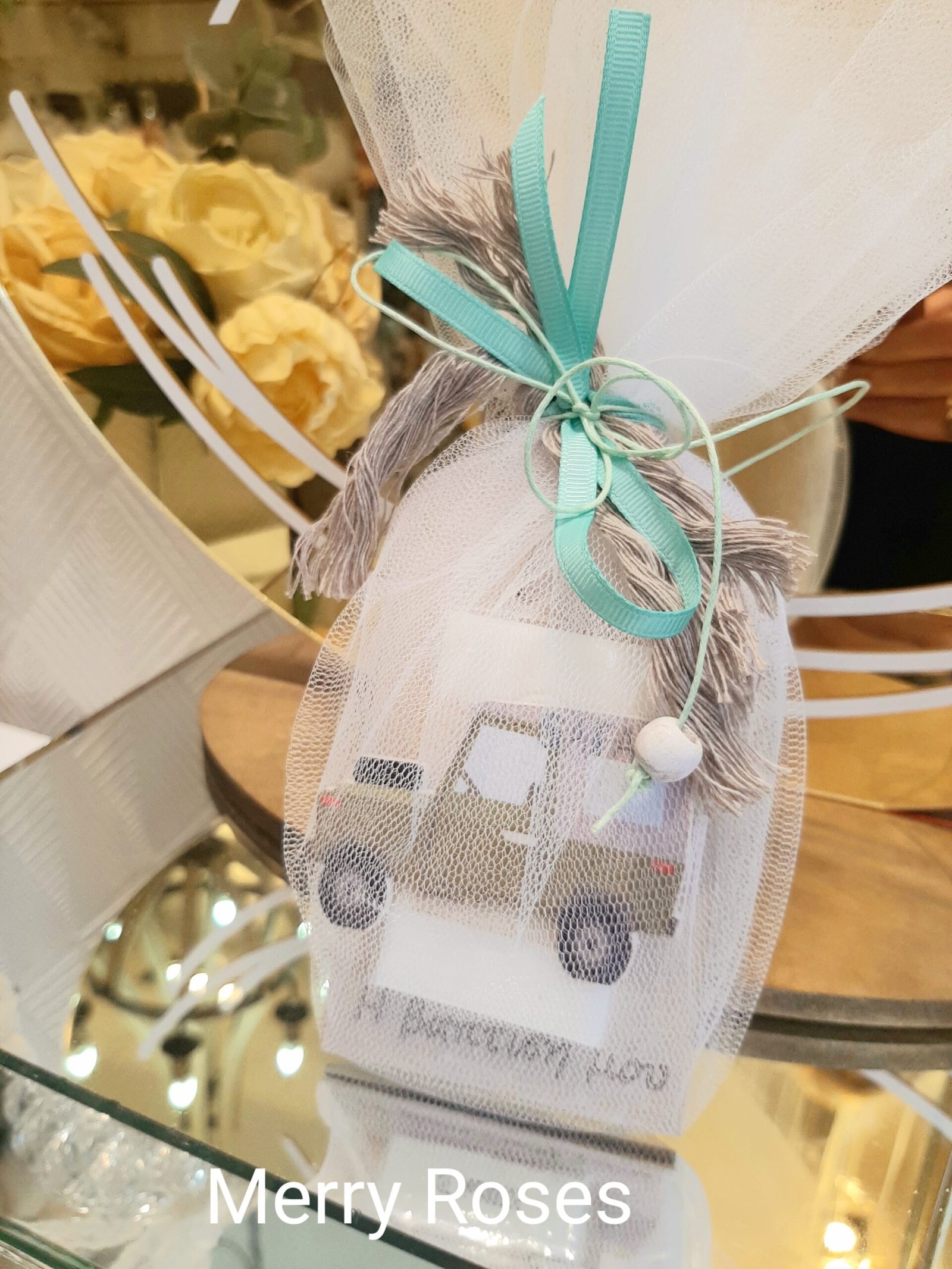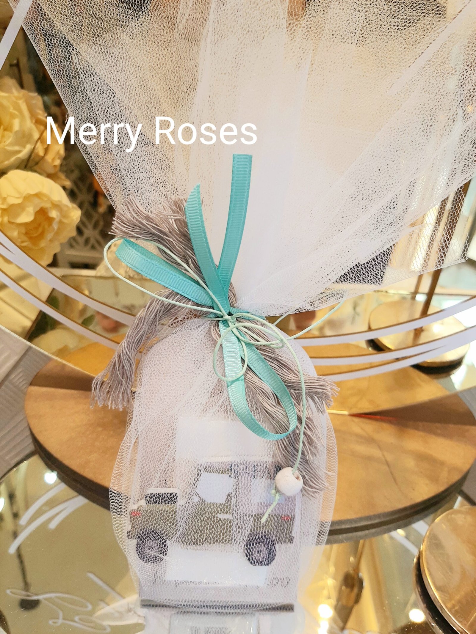 - Δεμένο μεσα σε τούλι ,5 κουφέτα αμυγδάλου , ποικιλία απο κορδέλες και ξύλινη χάντρα.