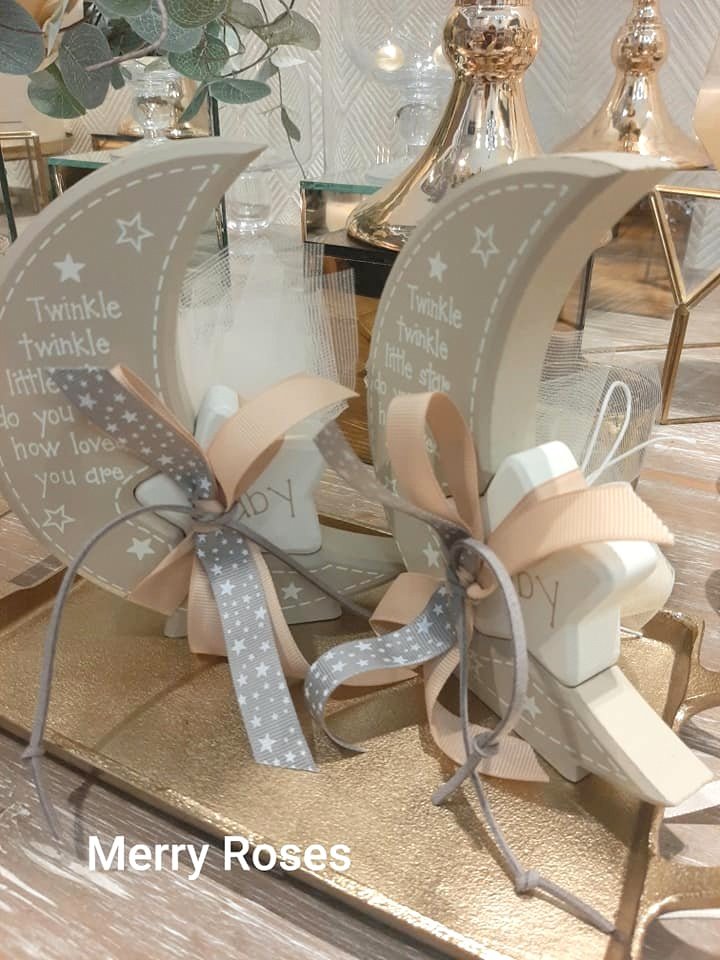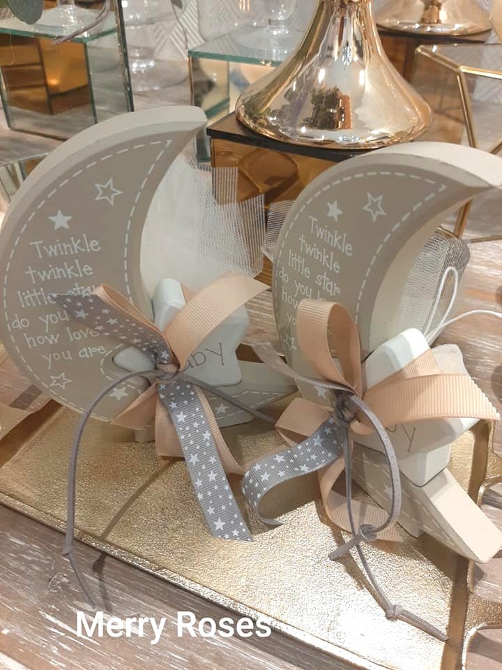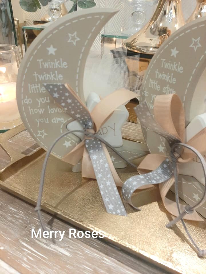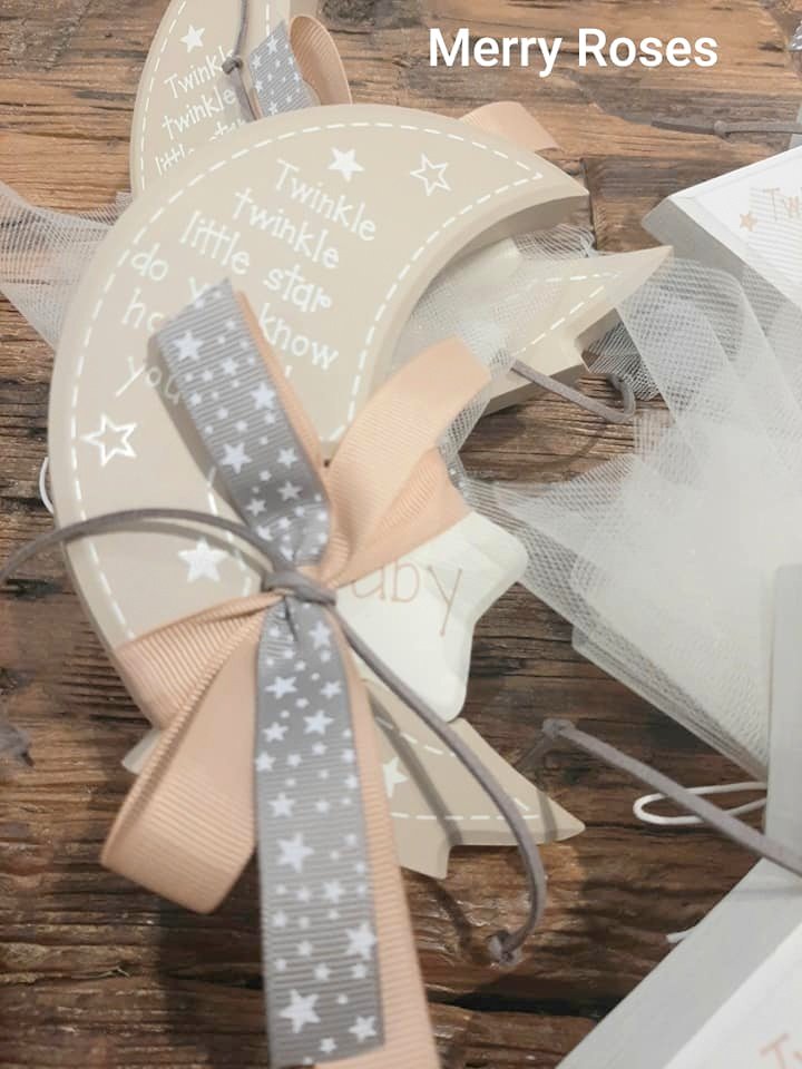 Μπομπονιέρα Βάπτισης φεγγάρι-αστέρι λευκό- μπέζ 14*15 εκ,δεμένο με γκρό κορδέλες και δερμάτινο κορδόνι