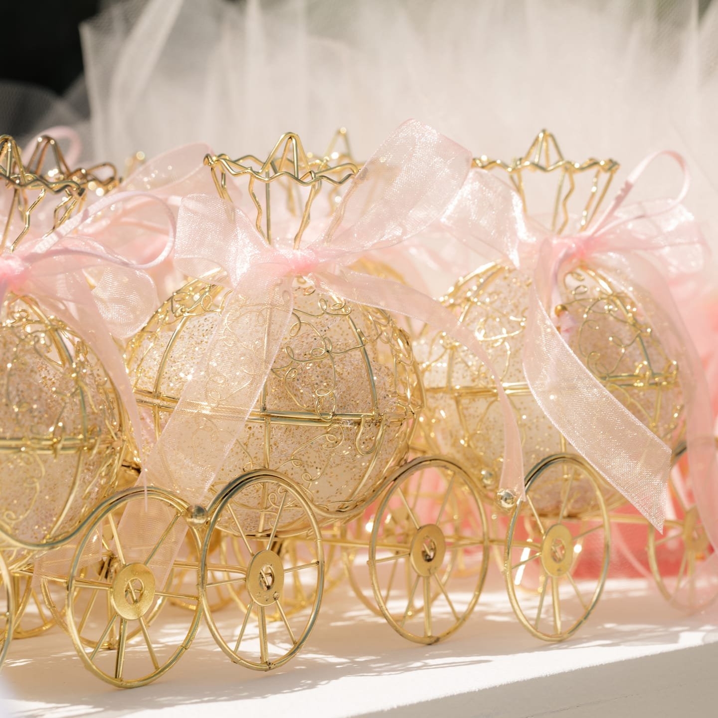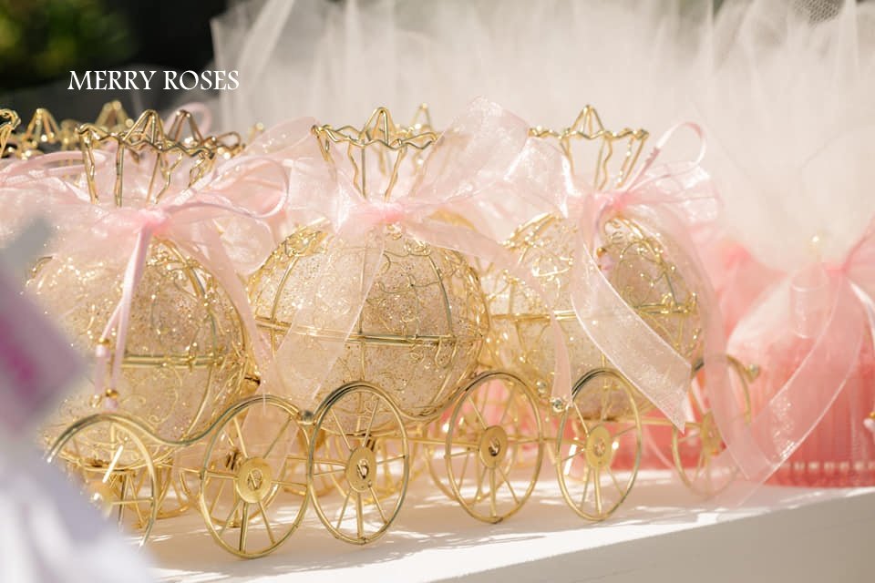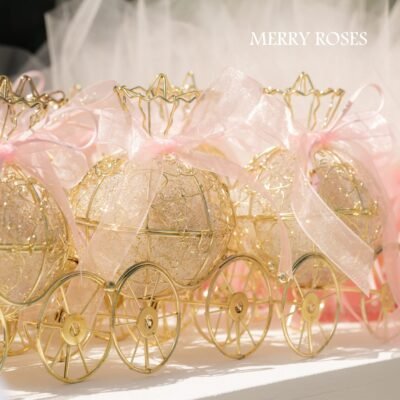 Μπομπονιέρα βάπτισης χρυσή άμαξα με γέμιση εσωτερικά απο τούλι με χρυσό γκλίτερ και 5 κουφέτα αμυγδάλου