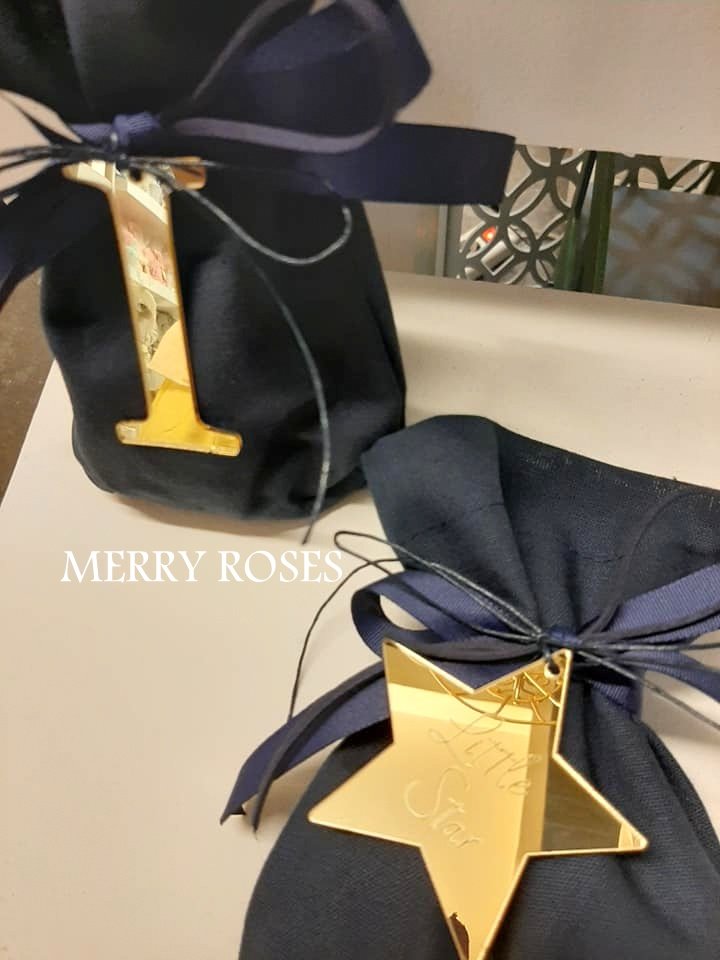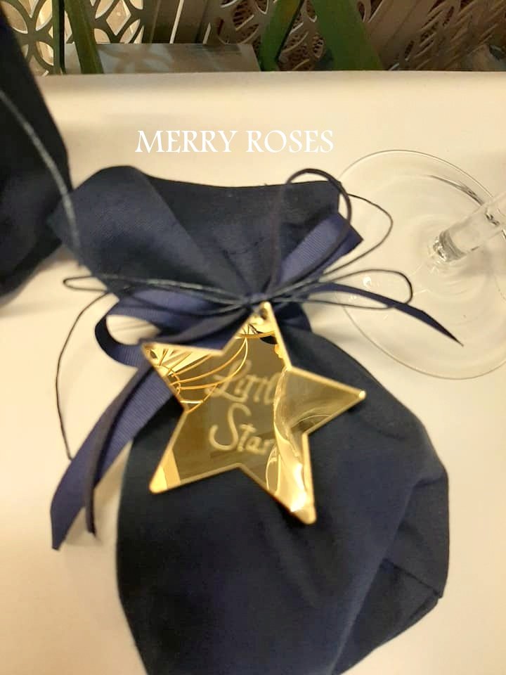 Μπομπονιέρα βάπτισης χρυσό αστέρι gold plexiglass με χάραξη my little star δεμένο σε μπλέ σκούρο πουγκί με γκρό κορδέλα και κορδόνι κέρινο.