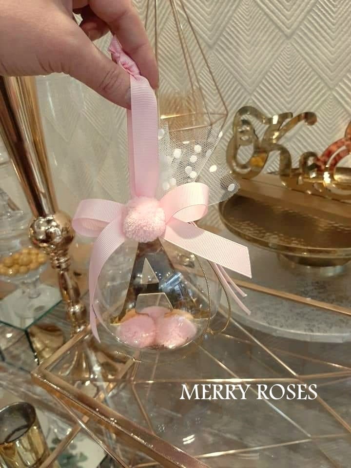 Μπομπονιέρα Βάπτισης χρυσό μονόγραμμα πλέξιγκλας με πον -πον, σε μπάλα 10 εκ