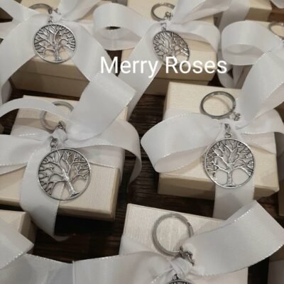 Μπομπονιέρα γάμου κουτί πολυτελείας δεμένο με ασημένιο μπρελόκ το δέντρο της ζωής μαζί με λευκή κορδέλα σατέν 2,5 εκ