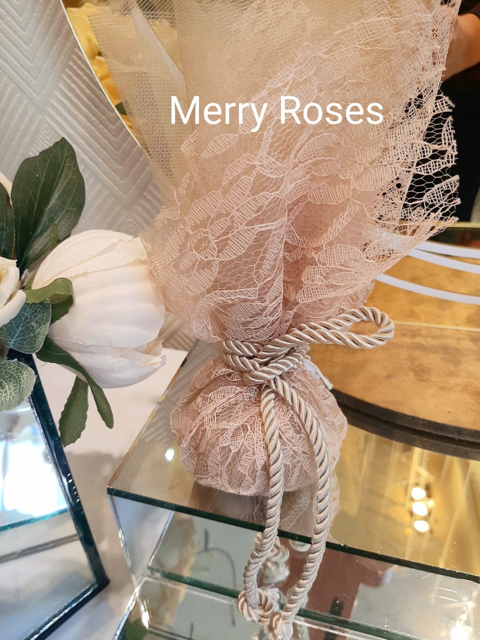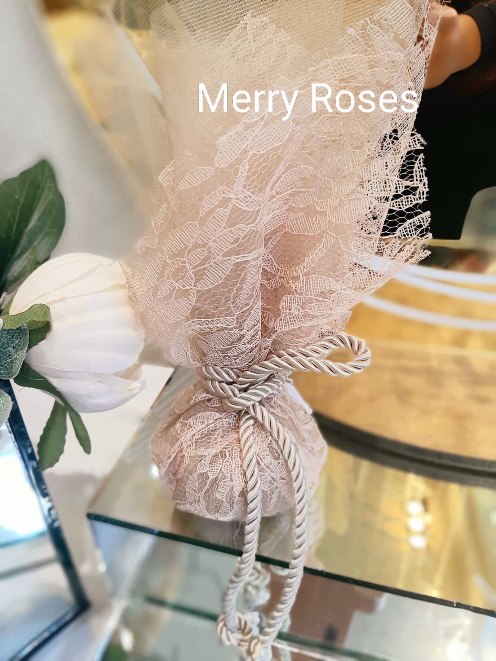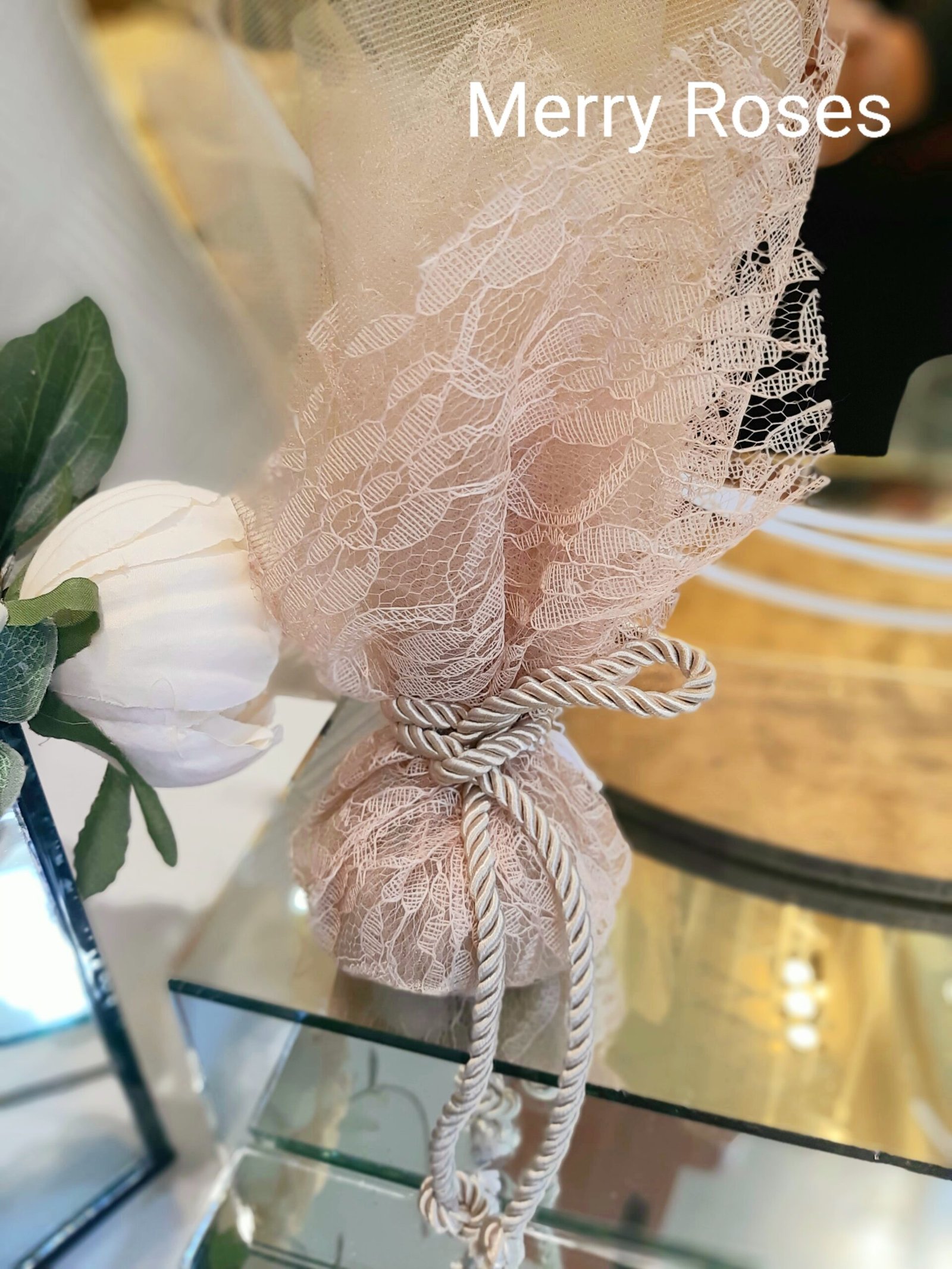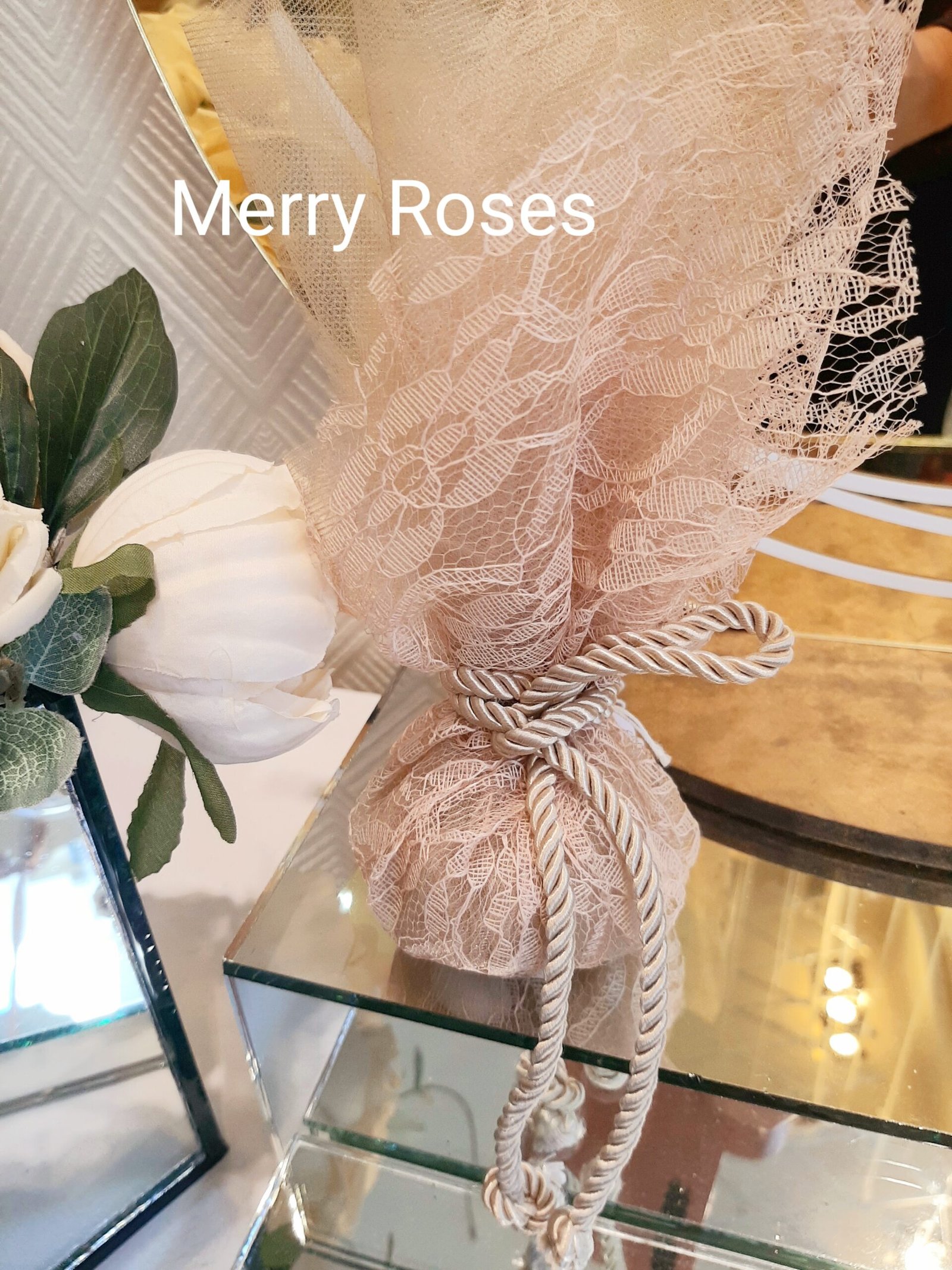 Μπομπονιέρα γάμου με δαντέλα χρυσό μπεζ και τούλι ιδίου χρώματος,σε γήινες αποχρώσεις,δεμένη με κορδόνι χρυσό μπεζ απόχρωσης