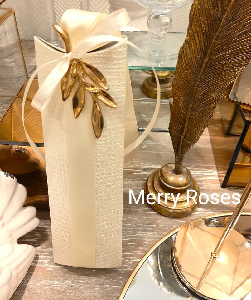 Μπομπονιέρα Γάμου κουτί πολυτελείας ιριδίζον ιβουάρ 20*7,5 εκ μαζί με μεταλλικό διακοσμητικό χρυσό κλαδί ελιάς χρυσό 7,5*4εκ.