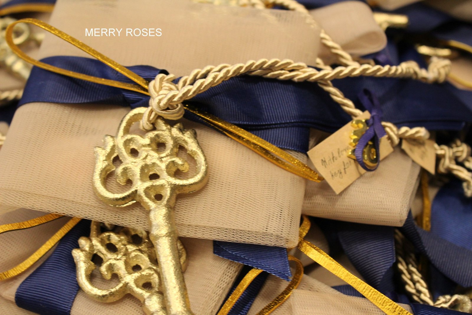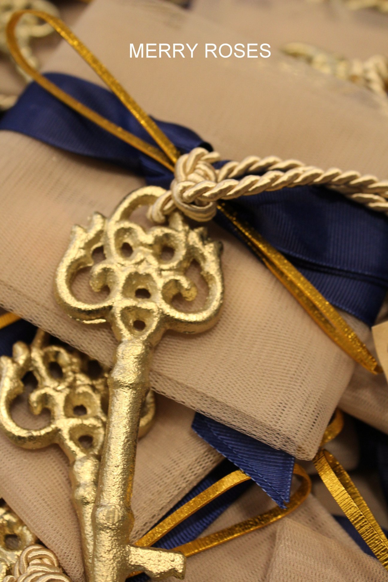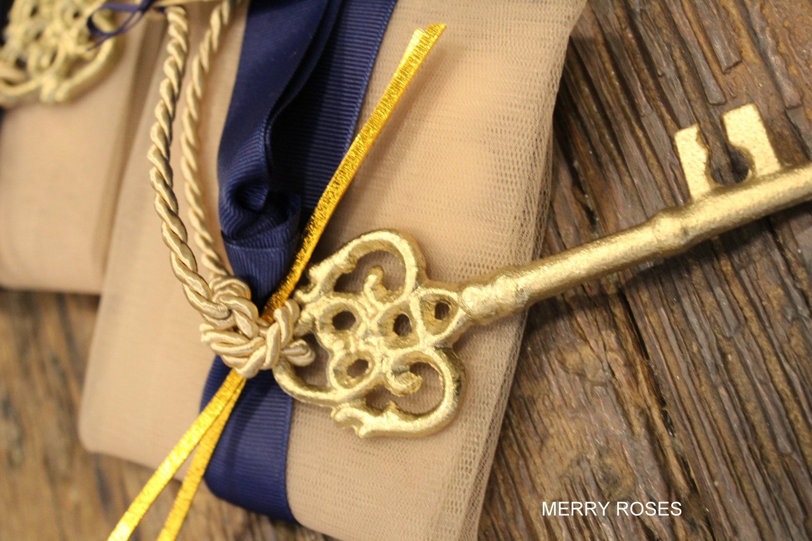 Μπομπονιέρα γάμου ,vintage μεταλλικό διακοσμητικό κλειδί 12,5 εκ χρυσό δεμένο σε τούλινη θήκη με κορδέλες,γκρό μπλε , μπέζ rayon κορδόνι & διακοσμητική χρυσή μεταλλική ράβδο .
