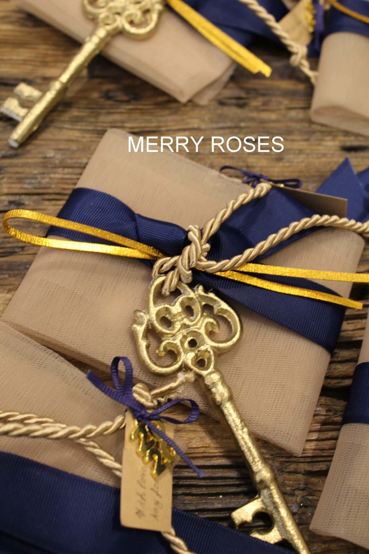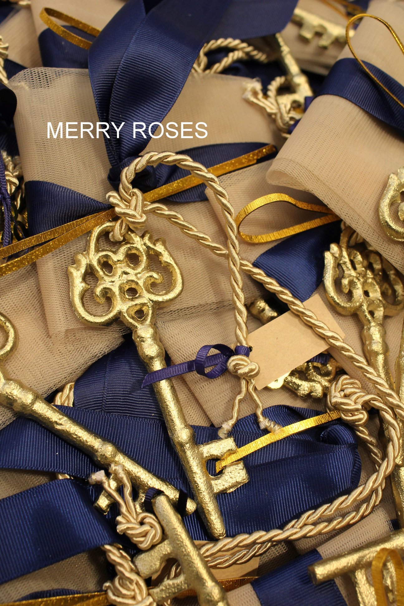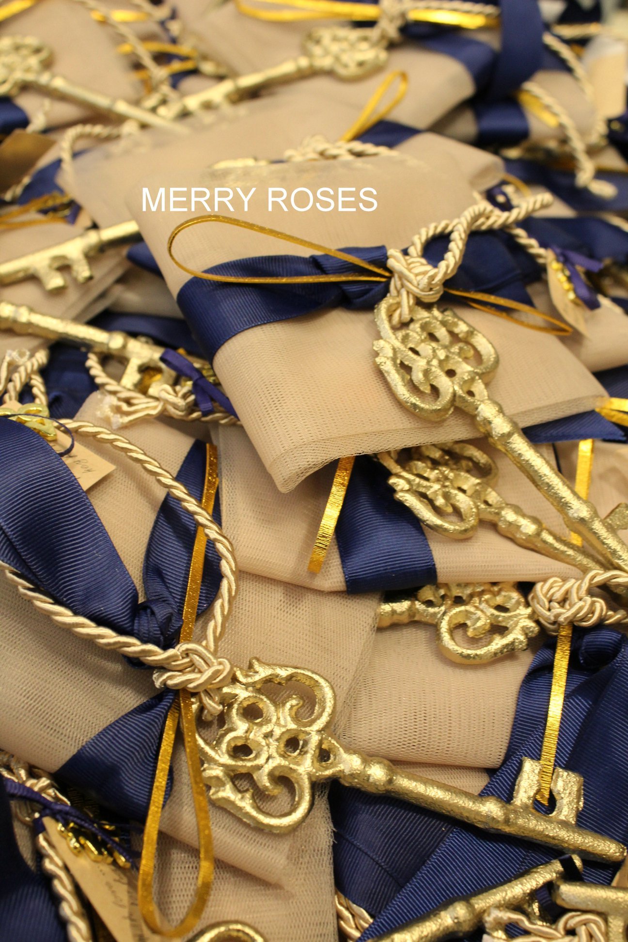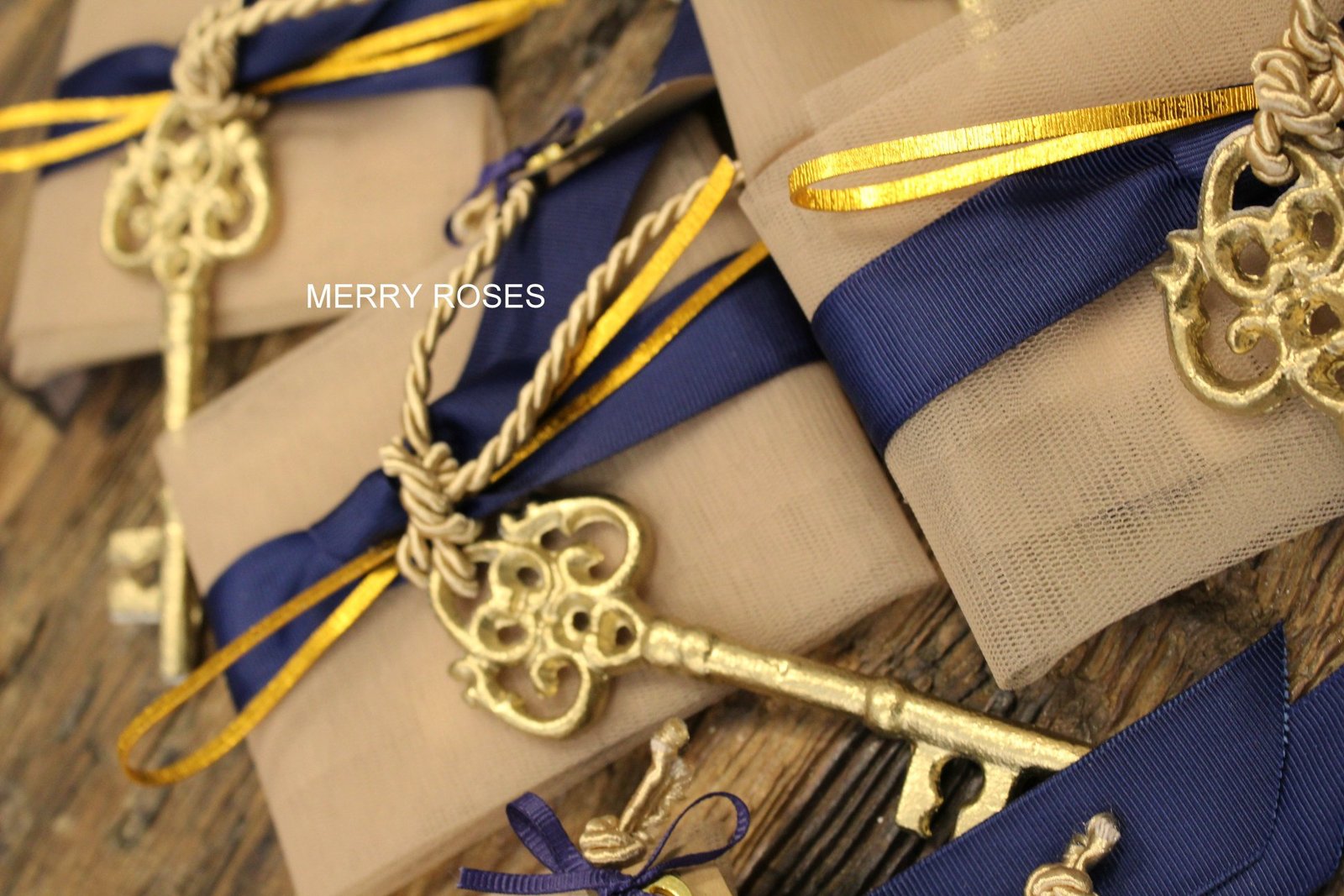 Μπομπονιέρα γάμου ,vintage μεταλλικό διακοσμητικό κλειδί 12,5 εκ χρυσό δεμένο σε τούλινη θήκη με κορδέλες,γκρό μπλε , μπέζ rayon κορδόνι & διακοσμητική χρυσή μεταλλική ράβδο .