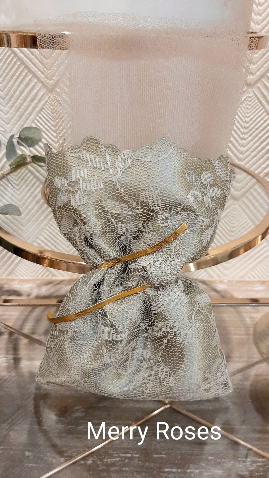 Πολυτελής μπομπονιέρα γάμου με λαδί πουγκί δαντέλας  ντουμπλαριστό 13×18εκ,δεμένη με σφυρήλλατη χρυσή ράβδο,και χρυσό τούλι γαλλικό εσωτερικά.